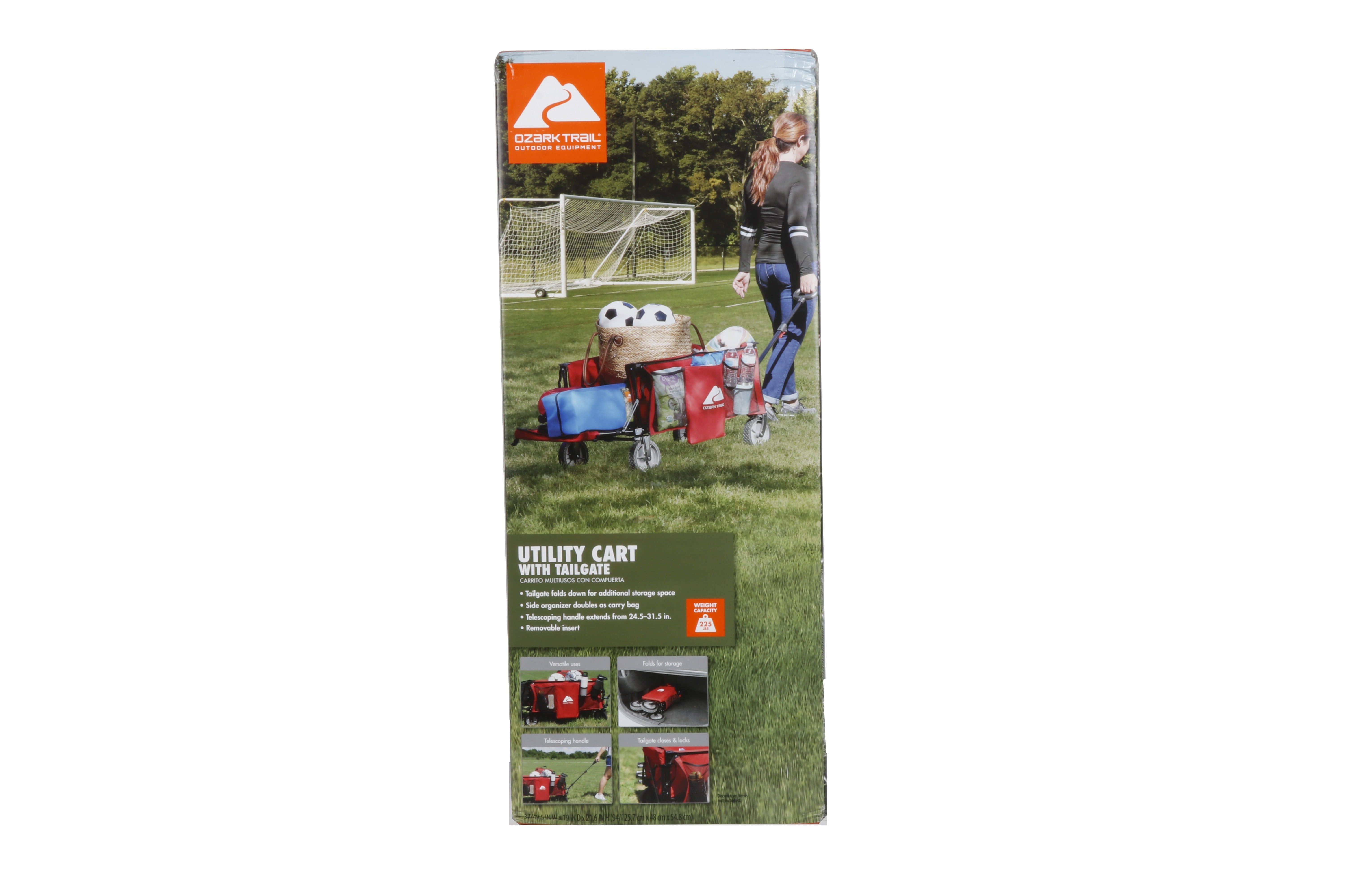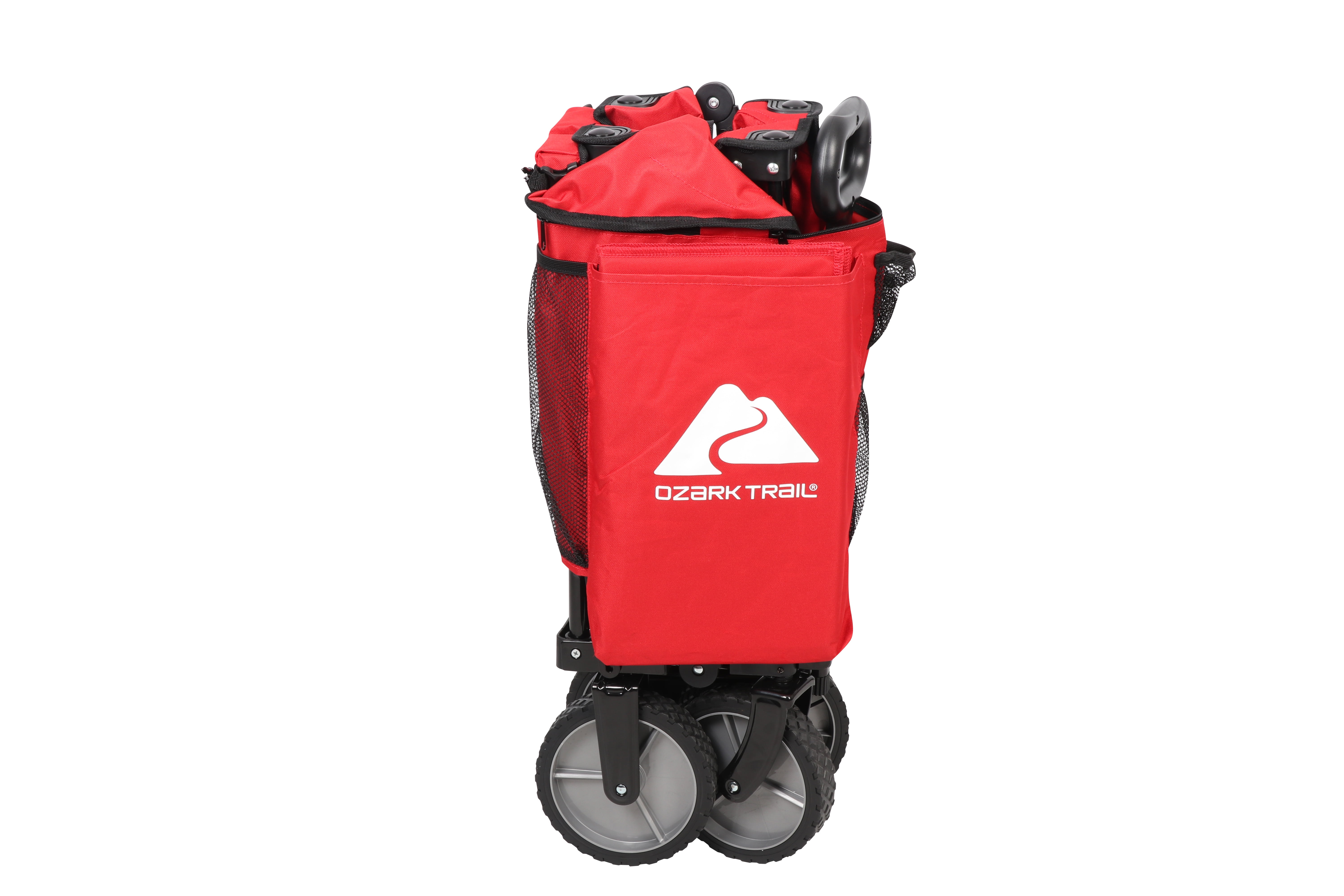 Ozark Trail Camping Utility Wagon with Tailgate & Extension Handle, Red Fabric: 300D polyester with PE coating Sturdy steel folding frame Convenient side organizer for books, tools, water bottles, and other items Heavy-duty oversized 7-inch wheels for traversing a variety of terrain Folding tailgate that allows you to load and unload items effortlessly, as well as haul longer items Folds up into a compact size for easy transportation and storage Conveniently transport up to 225 pounds Item weight: 21.6 pounds Product overall size (W*D*H” inches): 35.5 x 18.90 x 21.60