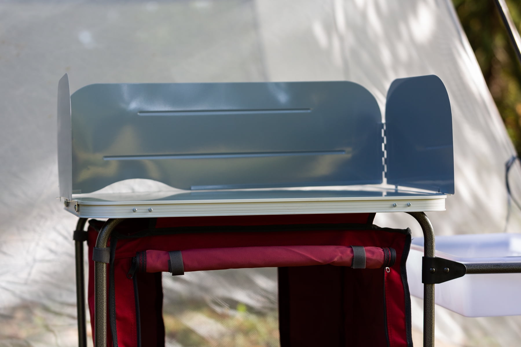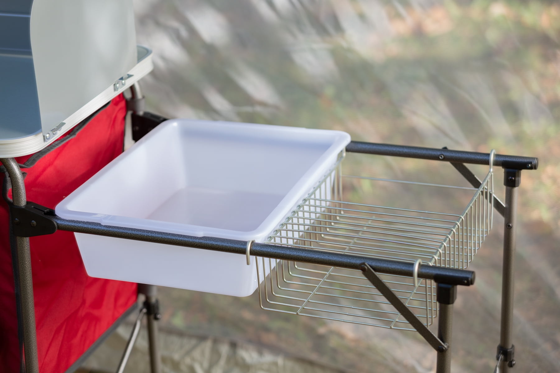 Ozark Trail Deluxe Camp Kitchen with Storage and Sink Table, Red Durable steel frame with easy-to-clean tabletop Grill table top is 19″ x 24″Removable windscreen on tabletop Windscreen Pantry organizer with zippered opening and mesh panel Outdoor sink table and drying rack included Durable steel frame Tub style sink, no drain Holds up to 65 lbs Packs small into included carry bag Assembly required Product weight: 20 lbs Dimensions (inches): 31″ x 13″ x 8.25″ Open dimensions (inches): 49″ x 19.5″ x 31.9″ Folded dimensions (inches): 33.1″ x 26″ x 5.9″ Model: TA-619, silver