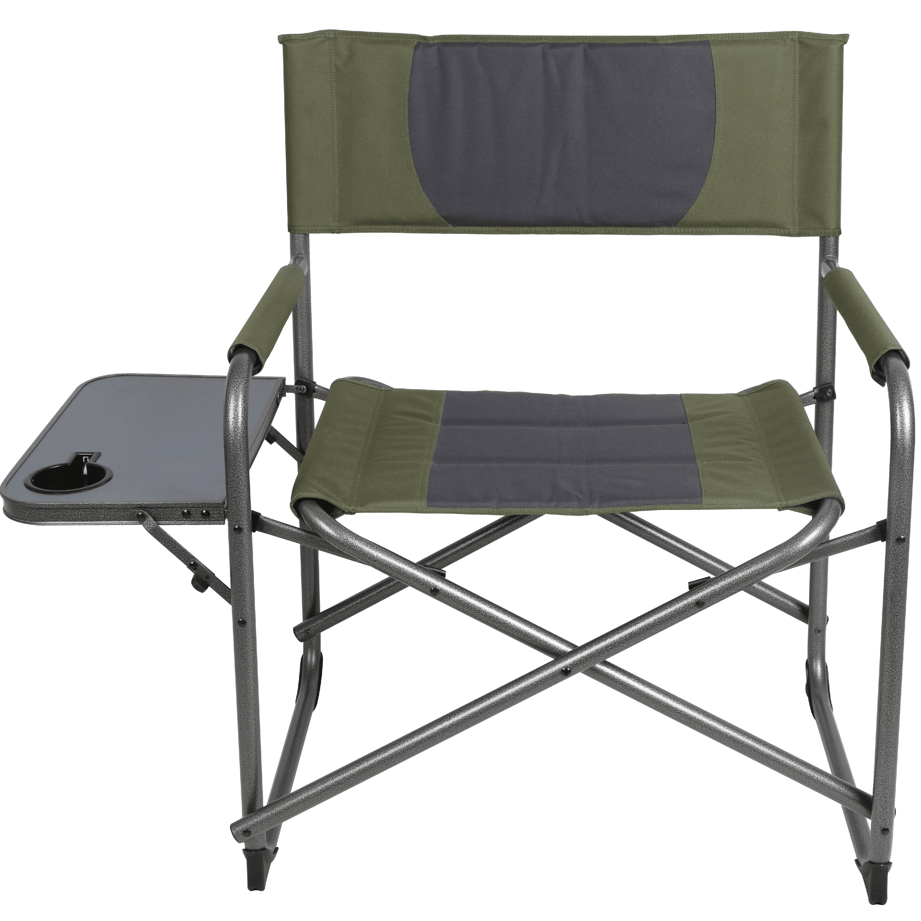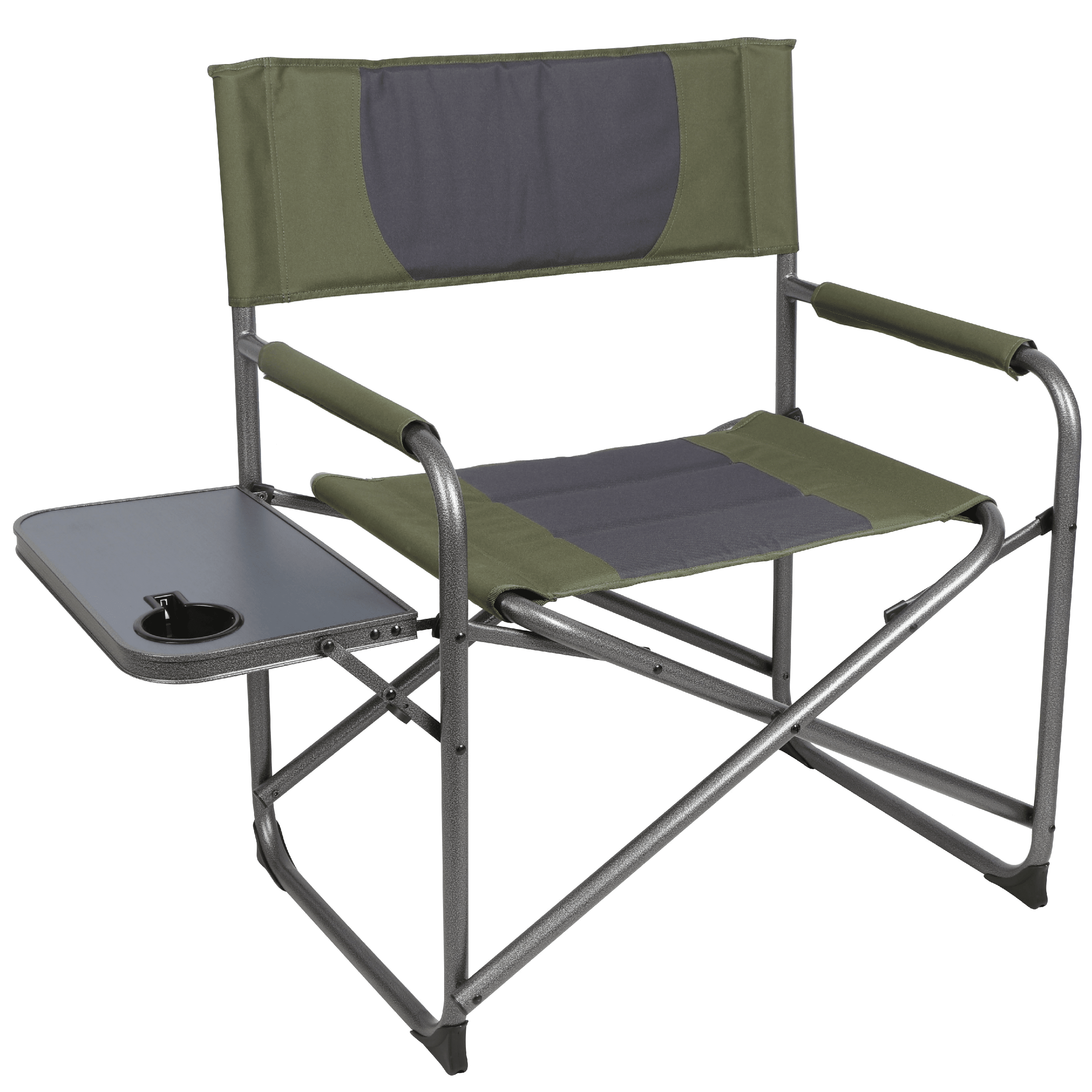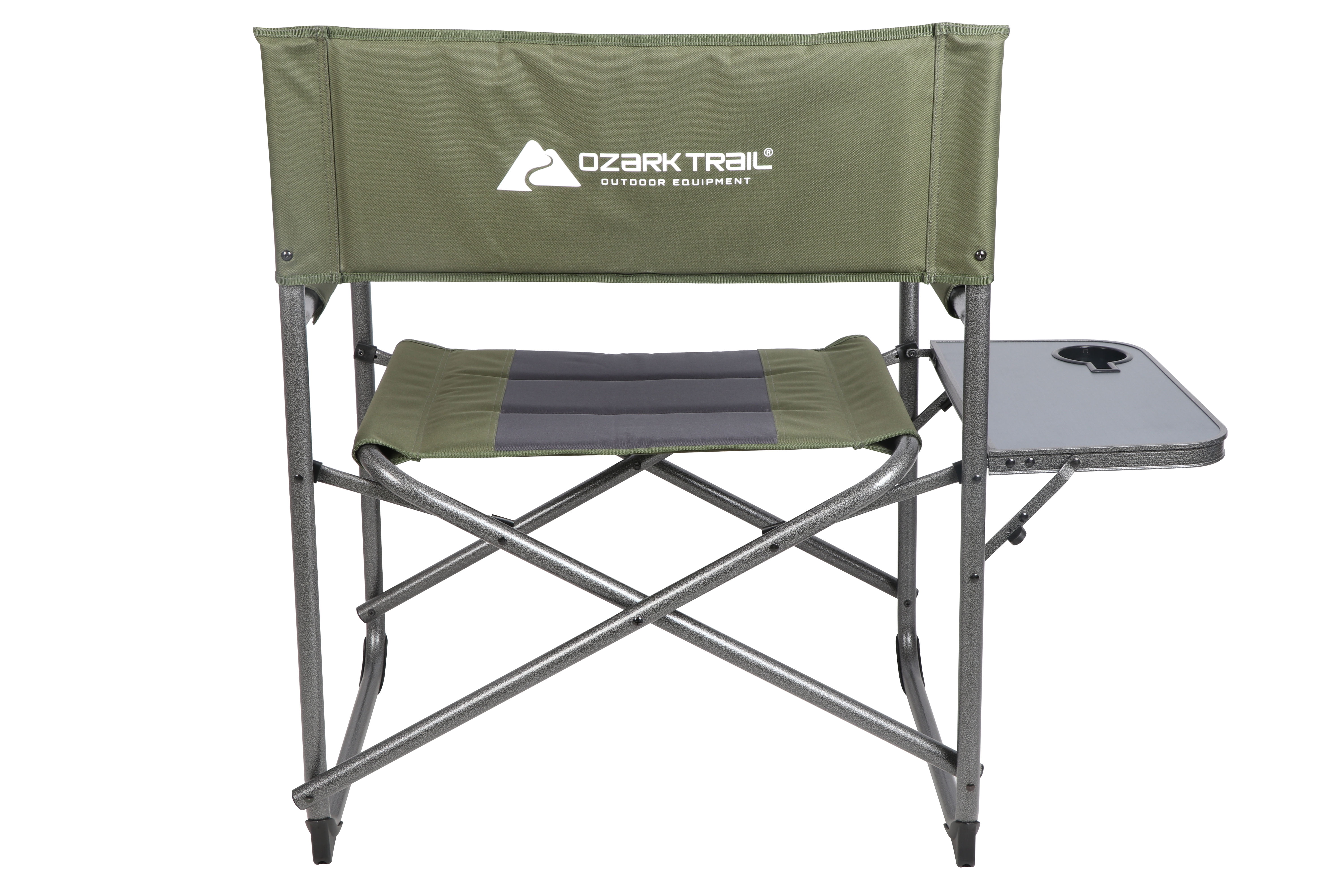 Ozark Trail Oversized Director Chair with Side Table, Green: Oversized foldable director’s chair for easy transportation and storage Convenient side table folds down when not in use XL seat width Made with durable polyester fabric put on a steel frame for long-lasting comfort Carry handle for easy transport Adult size Weight Capacity (lbs): 600 Product weight: 13.2lbs Product overall size (W * D * H inch): 38.5×22.8×35 Product seat size (W * D * H inch): 23x16x18 Fabric: 600D polyester with PVC coating Frame: Steel tube with powder coating Folding directions: stand on one side of the chair, step on the bottom bar of the frame and pull up on the side of the seat until chair closes