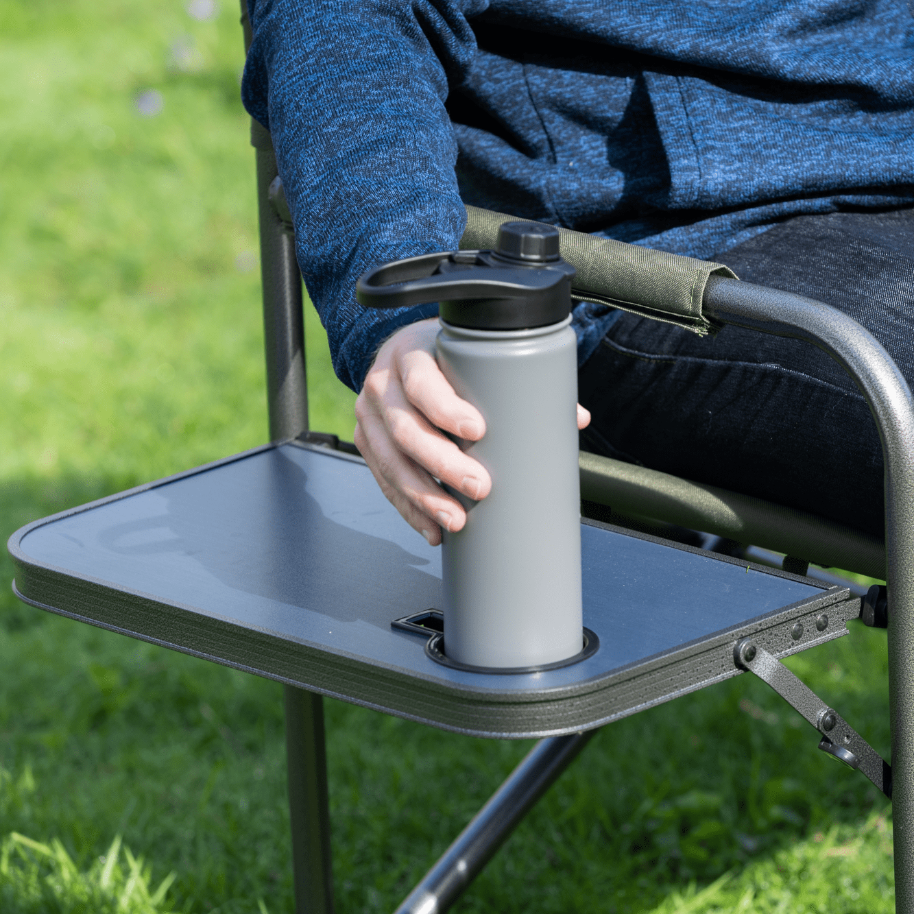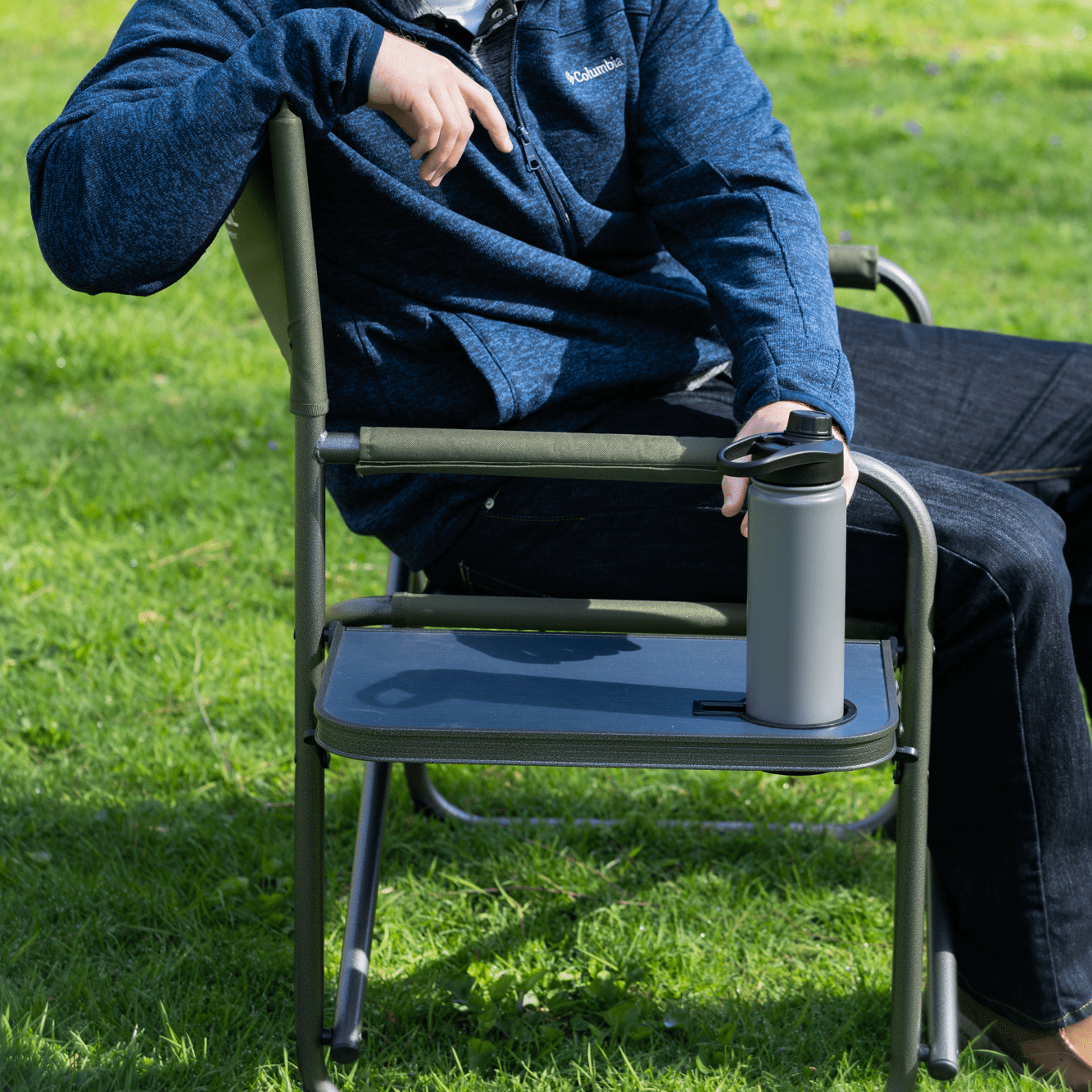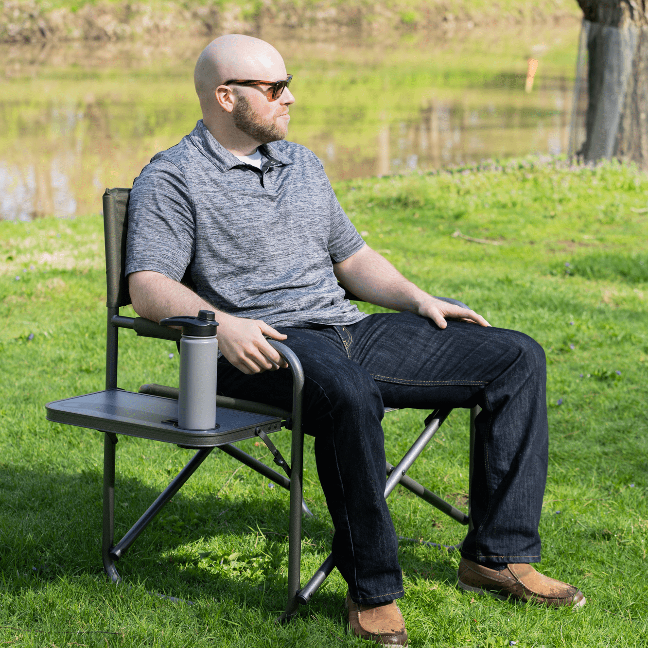 Stay comfortable with the Ozark Trail Oversized Director Chair with Side Table. Whether you are camping, tailgating, or lounging in this backyard, this chair will help you make the most of your time outdoors. The durable powder coated steel frame and comfortable polyester seat fabric can hold up to 600 pounds, and the extra-large seat width means plenty of room for comfort. There is also a convenient side table with a built-in cup holder that you can fold down when you do not need it, and the whole chair folds up easily for effortless moving and storage. Do not worry about getting caught in a sprinkle, since the chair fabric is coated for weather and moisture resistance. The convenient carry handle makes it easy to transport to ballgames, picnics, camping trips, and more. Are you ready for your next outdoor adventure? Stay comfortably seated outdoors with the Ozark Trail Oversized Director Chair with Side Table.