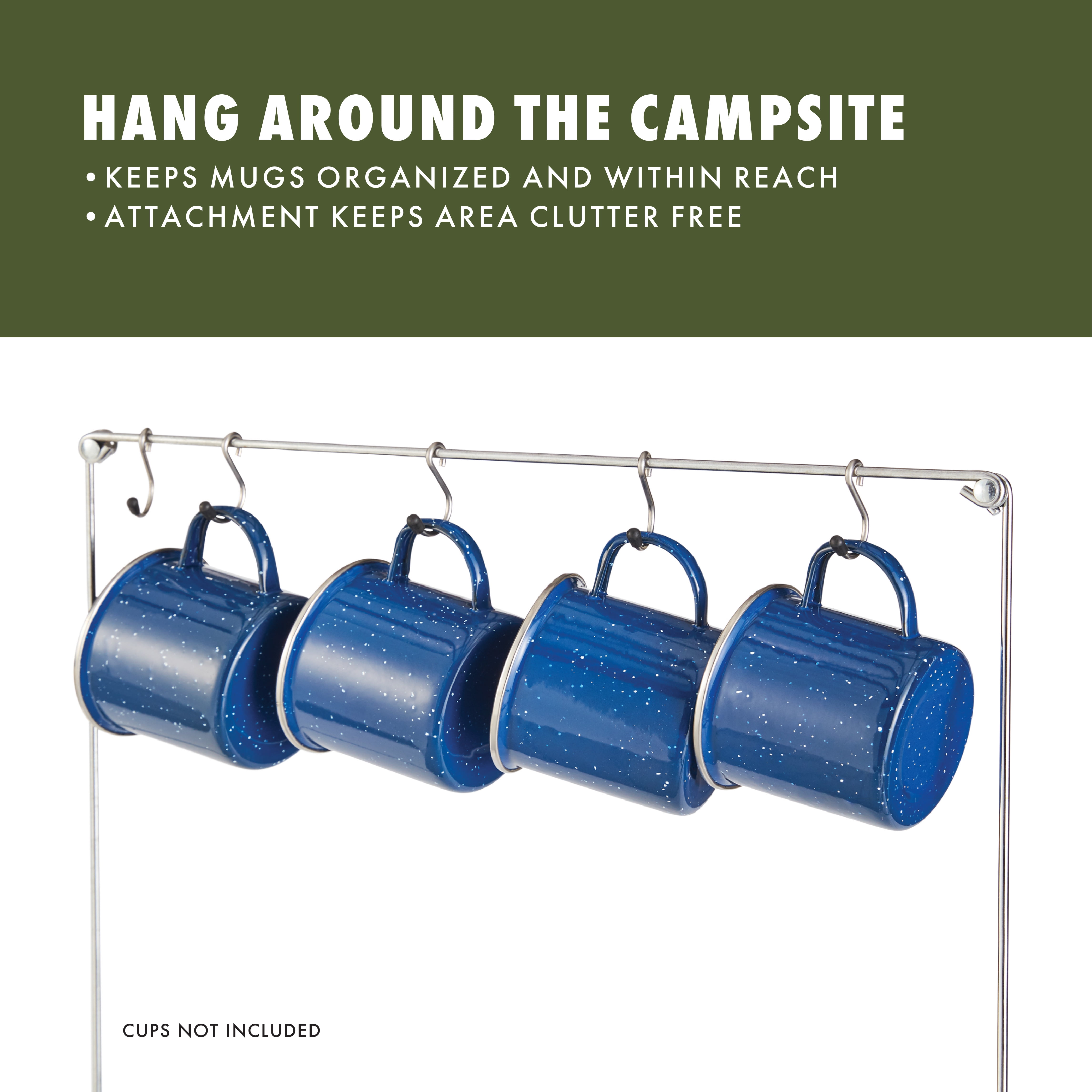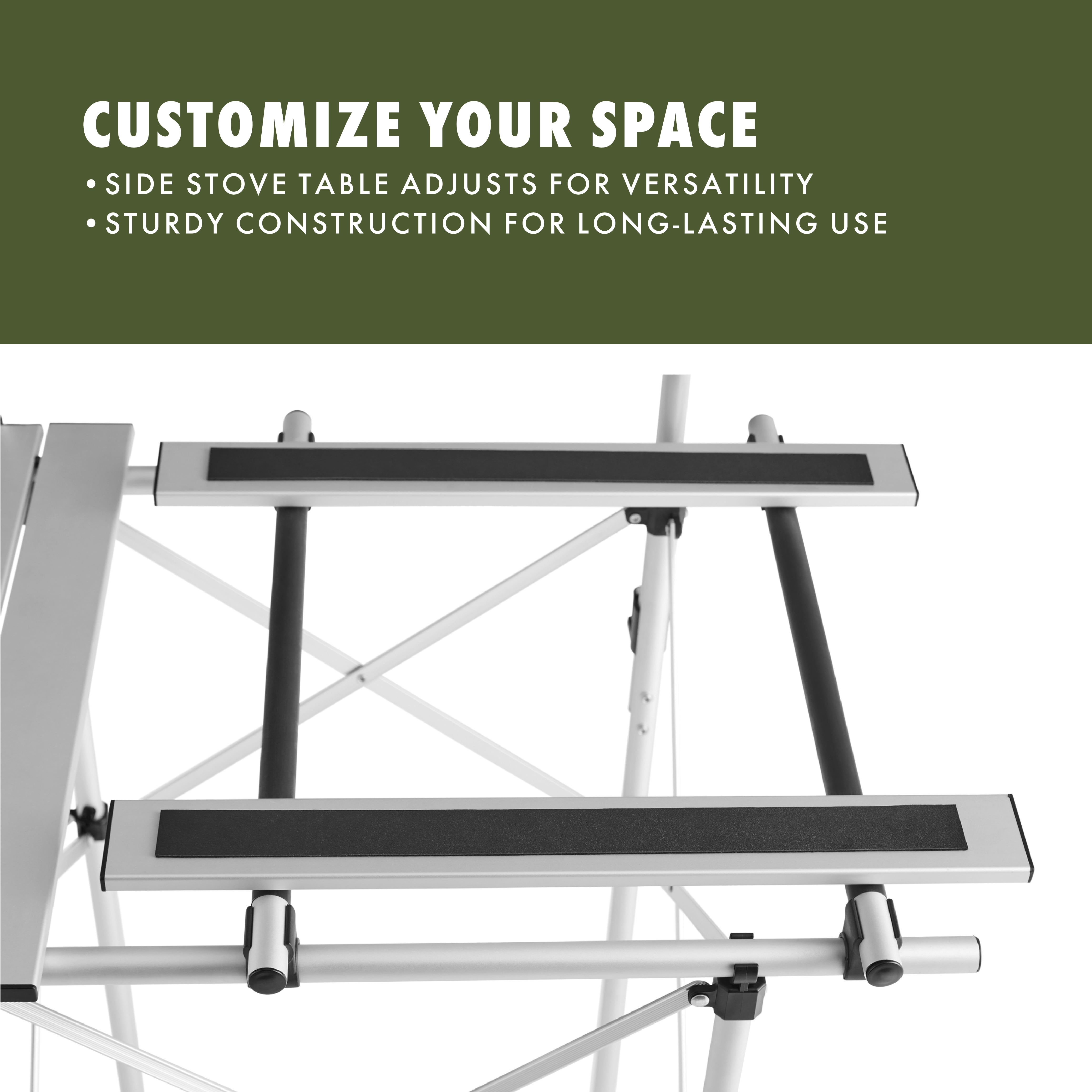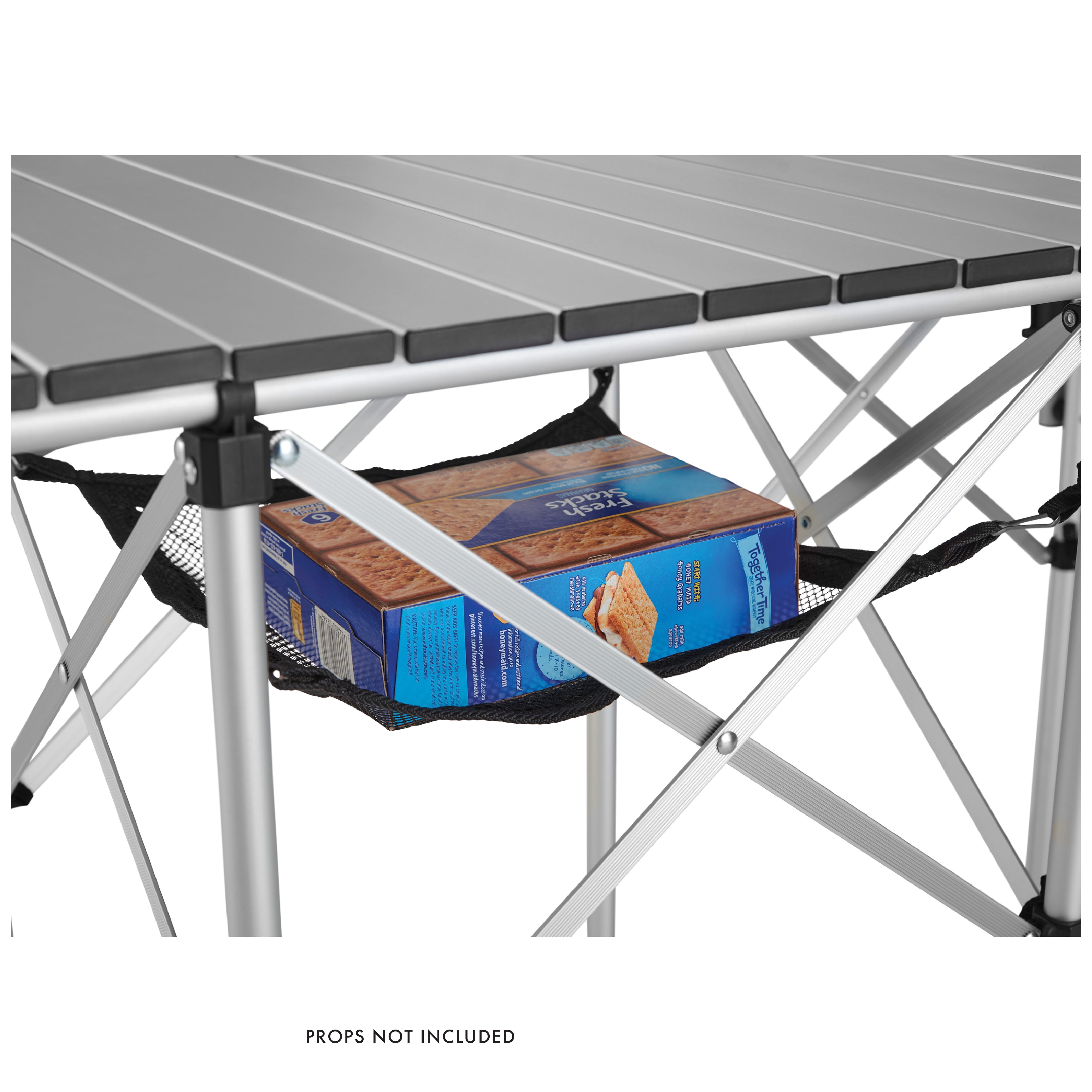 Compact aluminum and steel frame with matte finish Aluminum slat roll top table Side stove shelf with adjustable stove platform Removable lantern holder accessory Mesh storage shelf keeps important items within reach Additional hanging organizer rack with hooks Durable carry bag included for easy transportation Weight Capacity (pounds): 66 lbs. Open dimensions (inches): 41 x 18 x 31.5