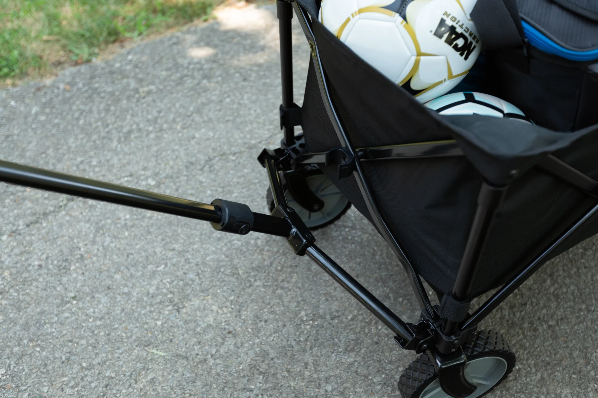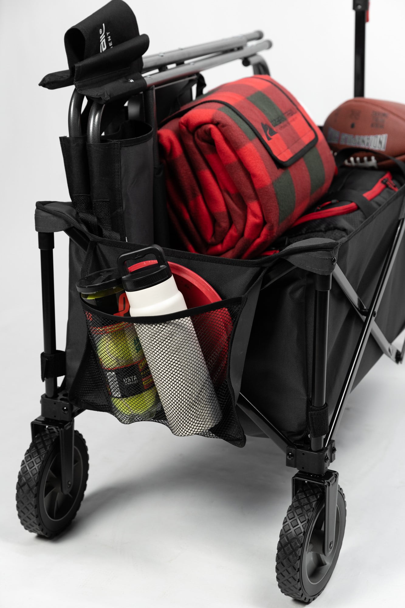 Quad folds for easy storage in your closet, garage, or the trunk of your car Great for adults hauling around supplies at your campsite 7-inch heavy-duty PVC wheels MDF board insert for the bottom of the wagon is also the carry wrap The ergonomic telescoping handle extends for easy towing Use the carry handle to fold up the wagon Durable steel folding frame and polyester fabric Weight Capacity: 225lbs Assembled Dimensions: 35.50 x 18.90 x 21.60 Inches