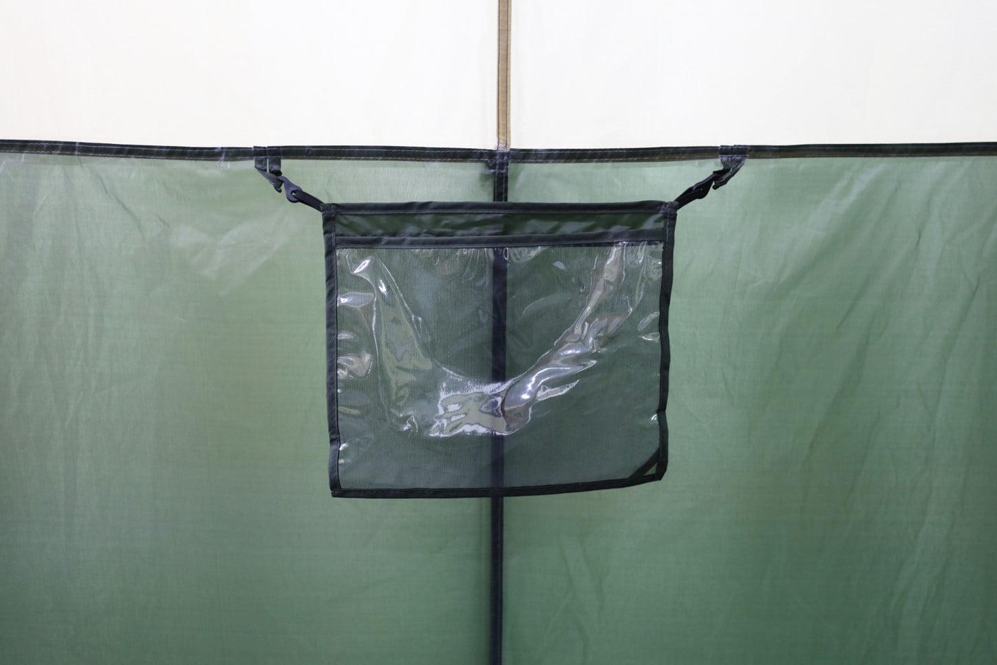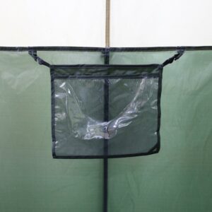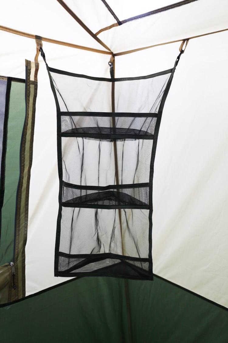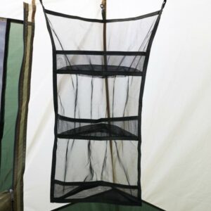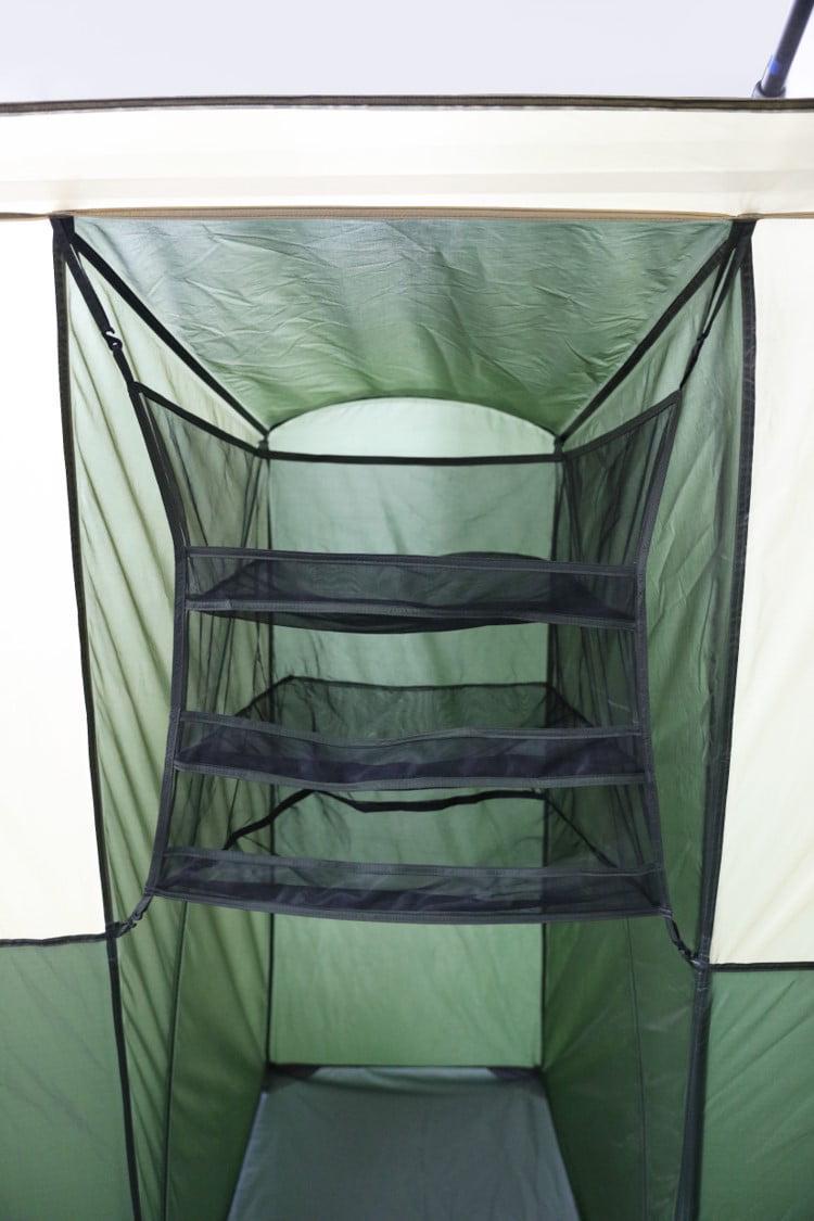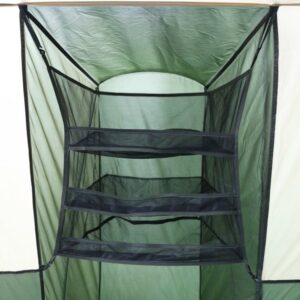 – Includes two 2 deep closets with large mesh hanging organizer and gear hanger with four carabiners