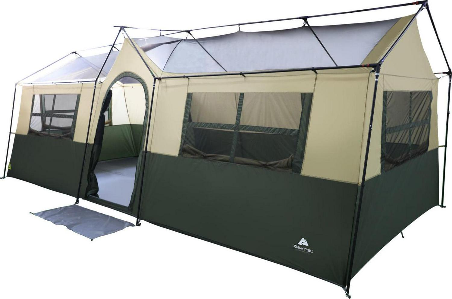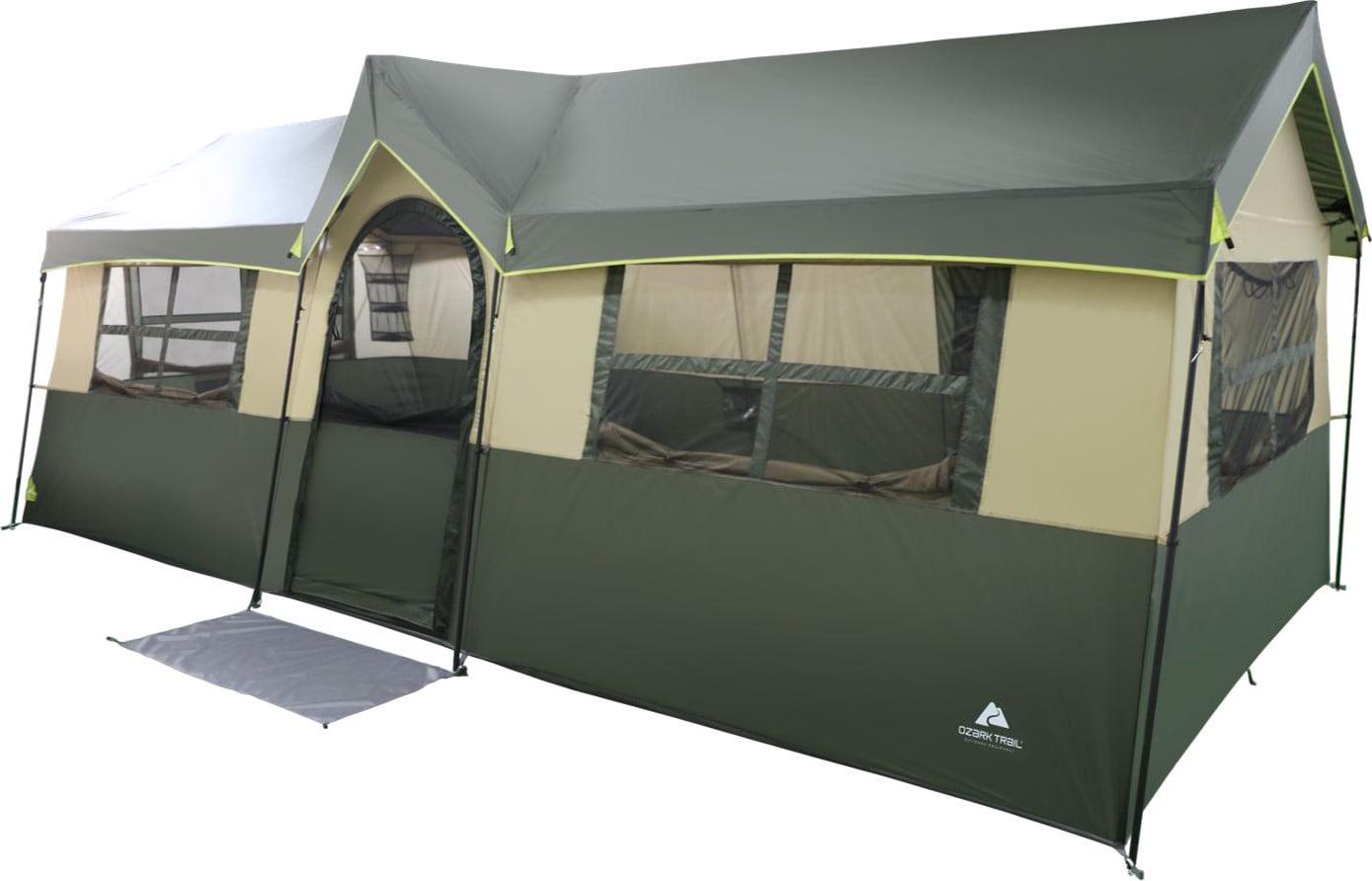 - Ozark Trail Hazel Creek 12 Person 3-Room Cabin Tent, 20′ x 9′ x 84″, Green