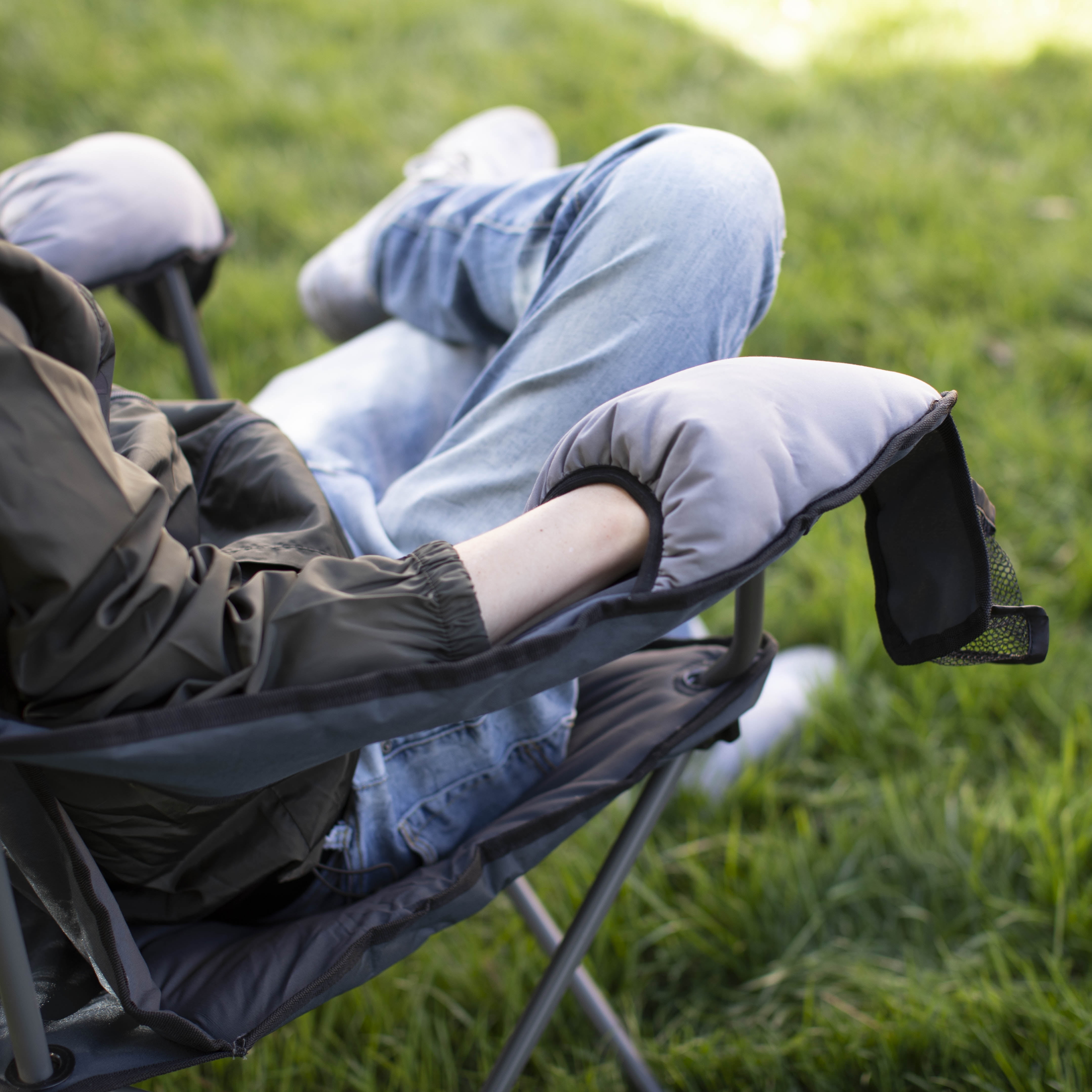 Integrated mittens to keep your hands warm on the cooler days by the campfire, tailgating, or sitting on the sideline cheering on your kids at soccer Two large mesh pockets to hold smaller items, like sunglasses or cards Insulated chair for additional warmth on top of the integrated mittens Carry bag with strap for quick and easy transportation Perfect for cooler weather tailgating or camping Constructed with a durable steel frame Weight Capacity: 400 pounds Color: Grey and Black Dimensions: 36? x 24? x 36? (H) Model Number: 30592