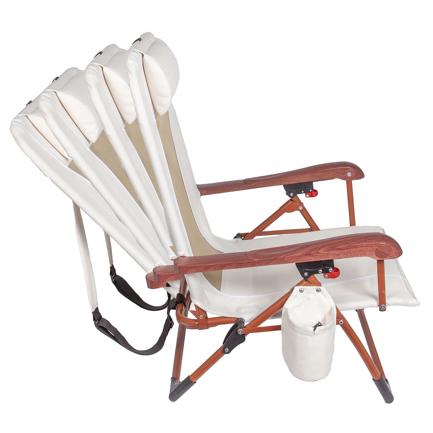 Elevate your outdoor relaxation experience with the Ozark Trail Low Profile Reclining Glamping Chair in fashionable Vanilla Dream Polyester fabric and sleek woodgrain print arms. The chair has multiple reclining positions, for maximum comfort, convenient insulated drink holder, spacious back storage pouch and adjustable, padded shoulder straps. Whether you’re out camping in the woods, lounging on the beach reading, soaking up the sun or tailgating at sporting event, this chair is quick and easy to set up and recline, giving you the best seat anywhere. Adult use. Overall size: 24.3 inches wide and is 40.15/25 inches deep with 29.13/36.61 inches high This durable chair has the capacity of 275 pounds