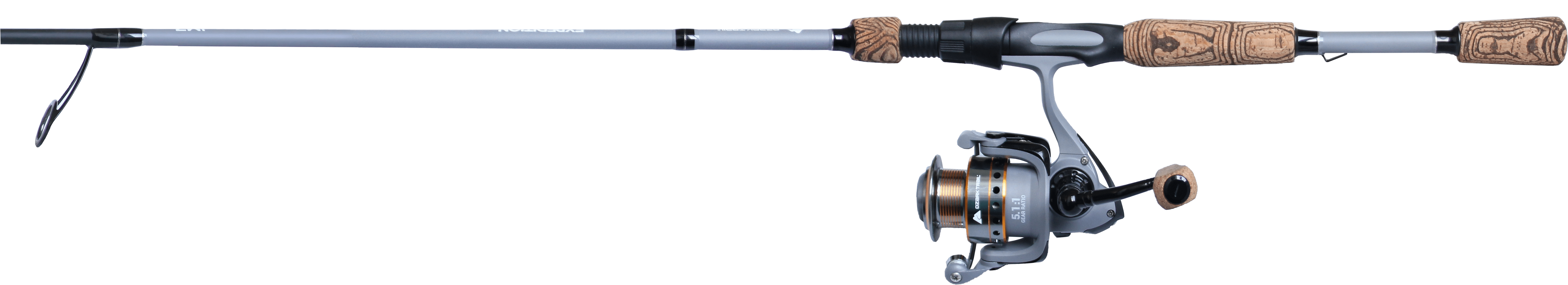 7’0″ 1 piece IM7 rod 8 ball bearing size 3000 spinning reel 5.1:1 gear ratio Ozark Trail