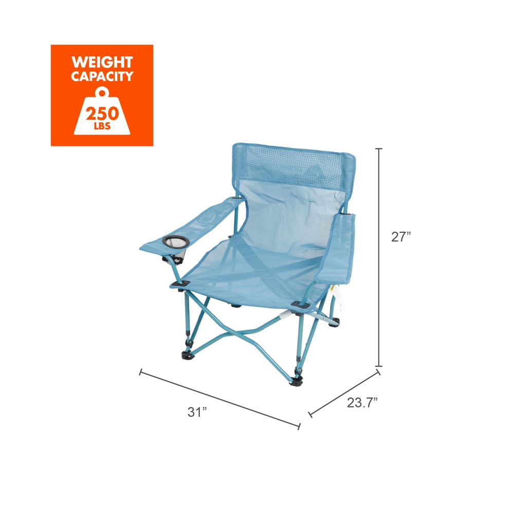 Ozark Trail Mesh Beach Folding Chair, Turquoise: Durable steel frame Compact, quad folding design Dura-Mesh fabric for increased ventilation Lower seat height One built-in mesh cupholder Weight capacity: 225 lbs Product weight: 6.6 lbs Open dimensions (inches): 31” x 23.7” x 27” Adult Use