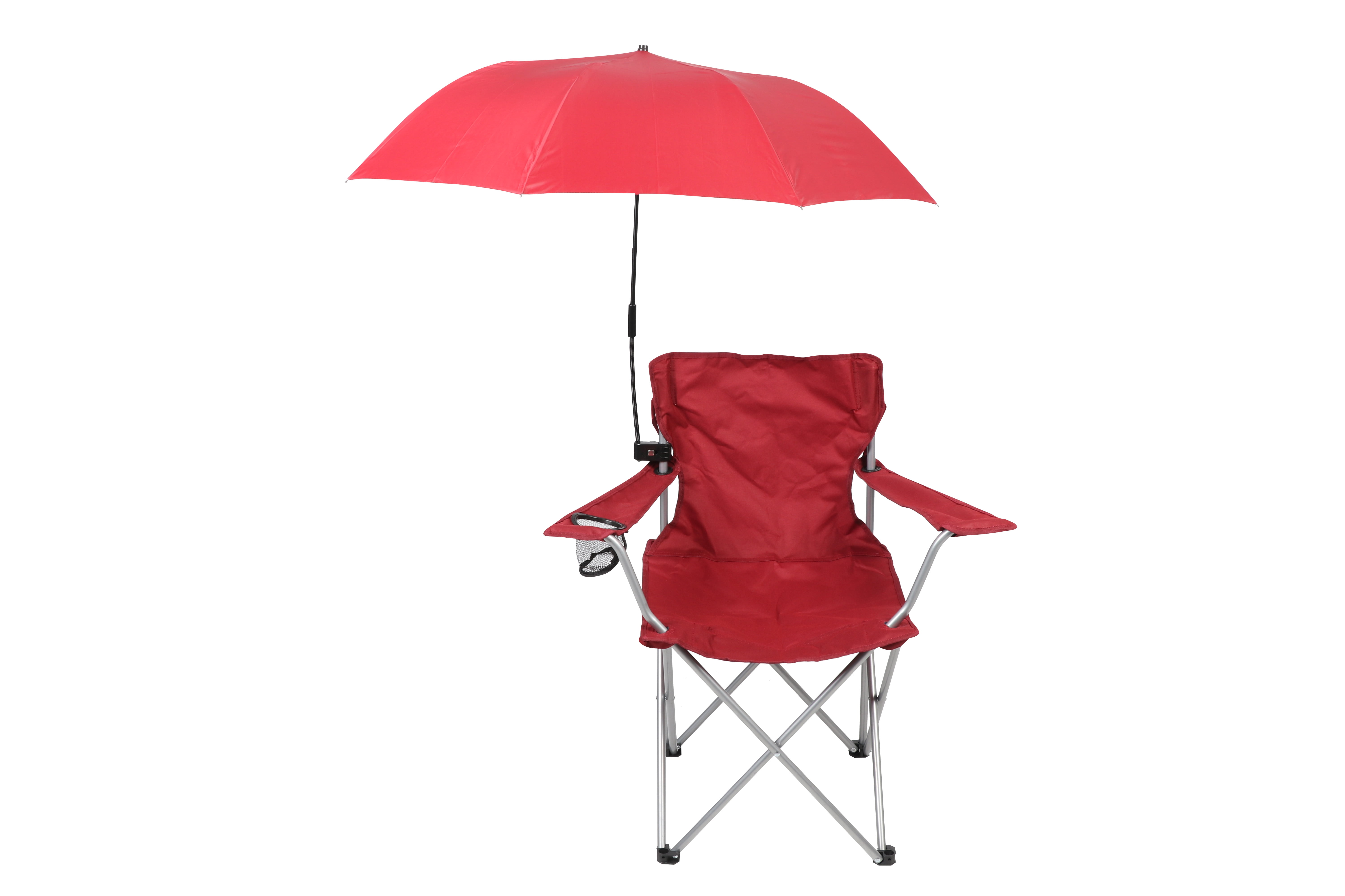 Ozark Trail Regular Chair Umbrella with Universal Clamp Durable red 180T polyester fabric with UPF 50 silver coating to protect you from the sun, rain, and other elements Flexible shaft bends for adjustable and customizable shade and protection throughout the day Clip on the umbrella bottom provides easy attachment to most folding chairs Draw String Carry Bag Easy to transport and store when not in use Adds shade to any chair Adults or teens Product weight (pounds): 1.1 lbs. Dimensions (inches): 42” L x 42” W x 31” H