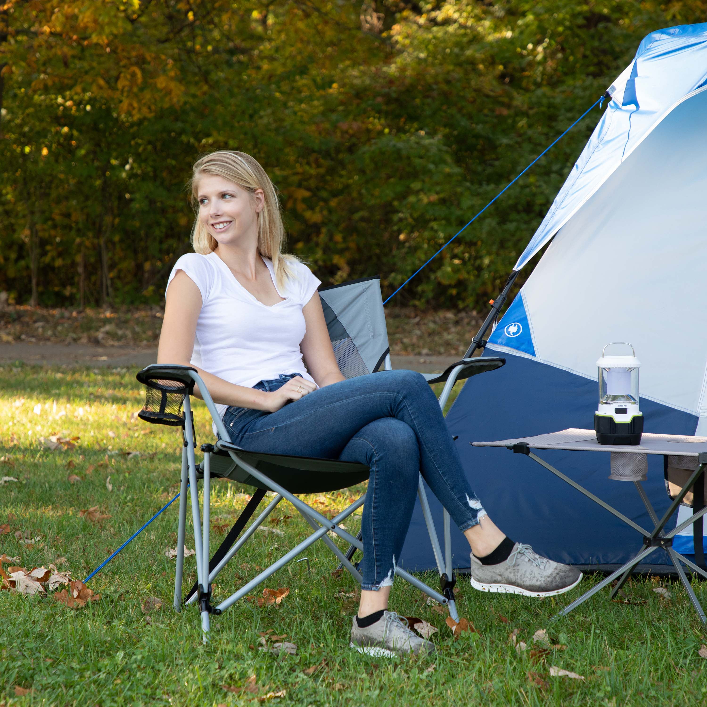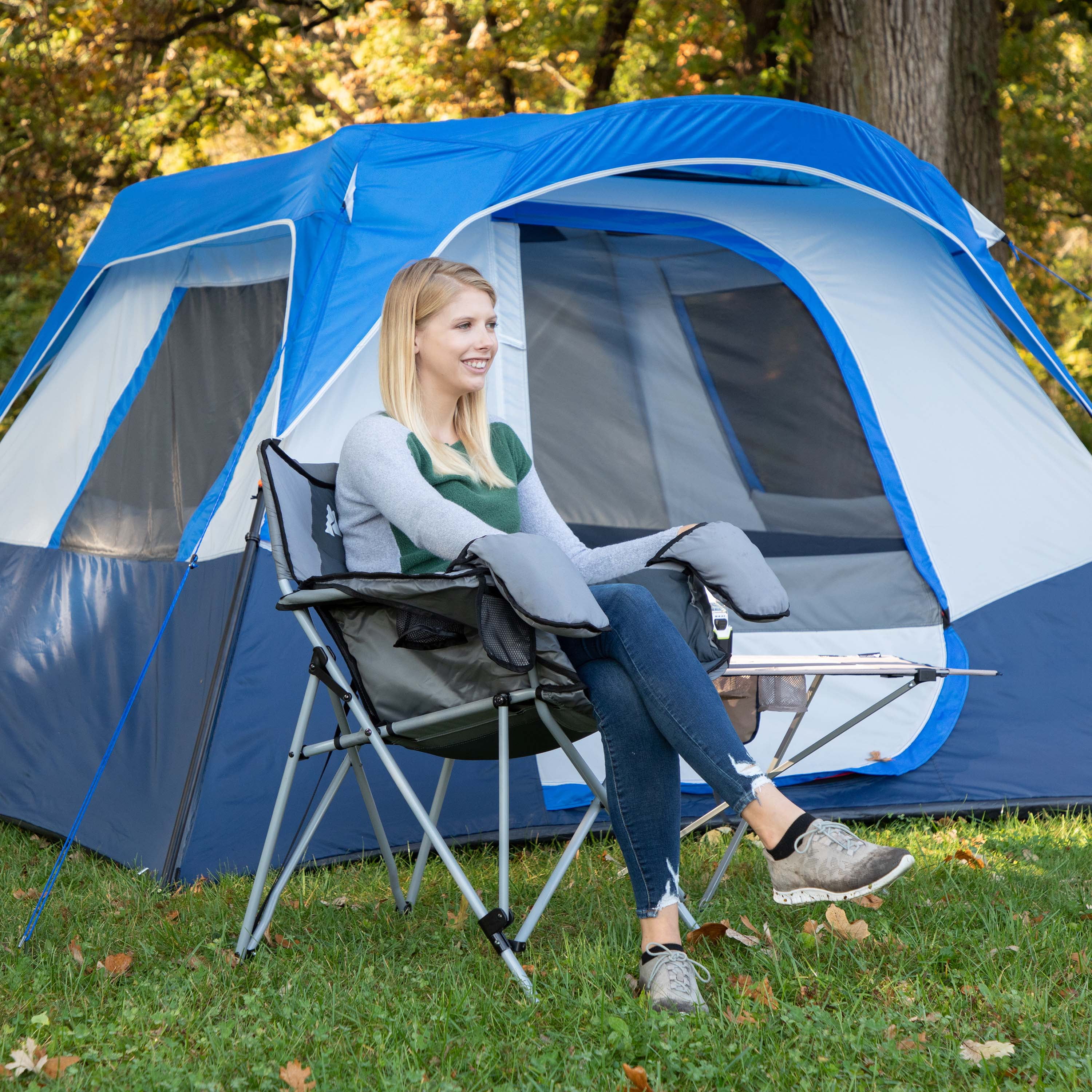 No matter the weather, make sure you have the Ozark Trail Tension Chair with All Season Cover. This adult chair is perfect for sunny tailgate days or chilly mornings at the campsite. This chair comes with a removable padded cover integrated with hand-warming pockets to keep you warm all day. The integrated mittens include a hanging mesh storage pocket for holding small items like your wallet or sunglasses. Remove the padded cover, and you have a tension chair with a breathable mesh back to help keep you cool on those warm summer days. The Ozark Trail Tension Chair with All Season Cover is constructed with a sturdy steel frame, making this chair durable and giving it a 400-pound weight capacity. It also includes a roll-top carry bag with an attached shoulder strap to make transportation and storage quick and easy. You can rest assured knowing that no matter the weather, you will be comfortable with the Ozark Trail Tension Chair with All Season Cover.