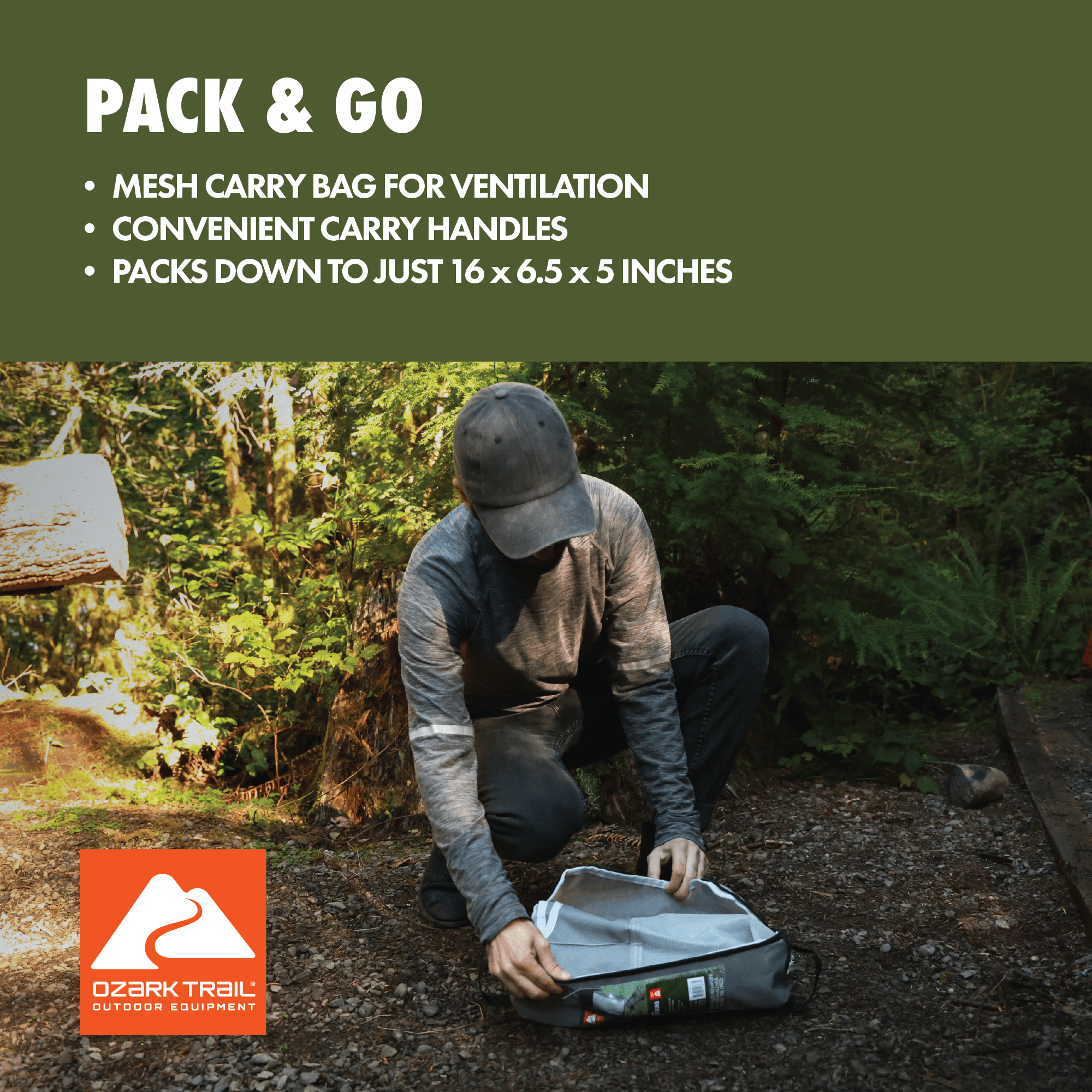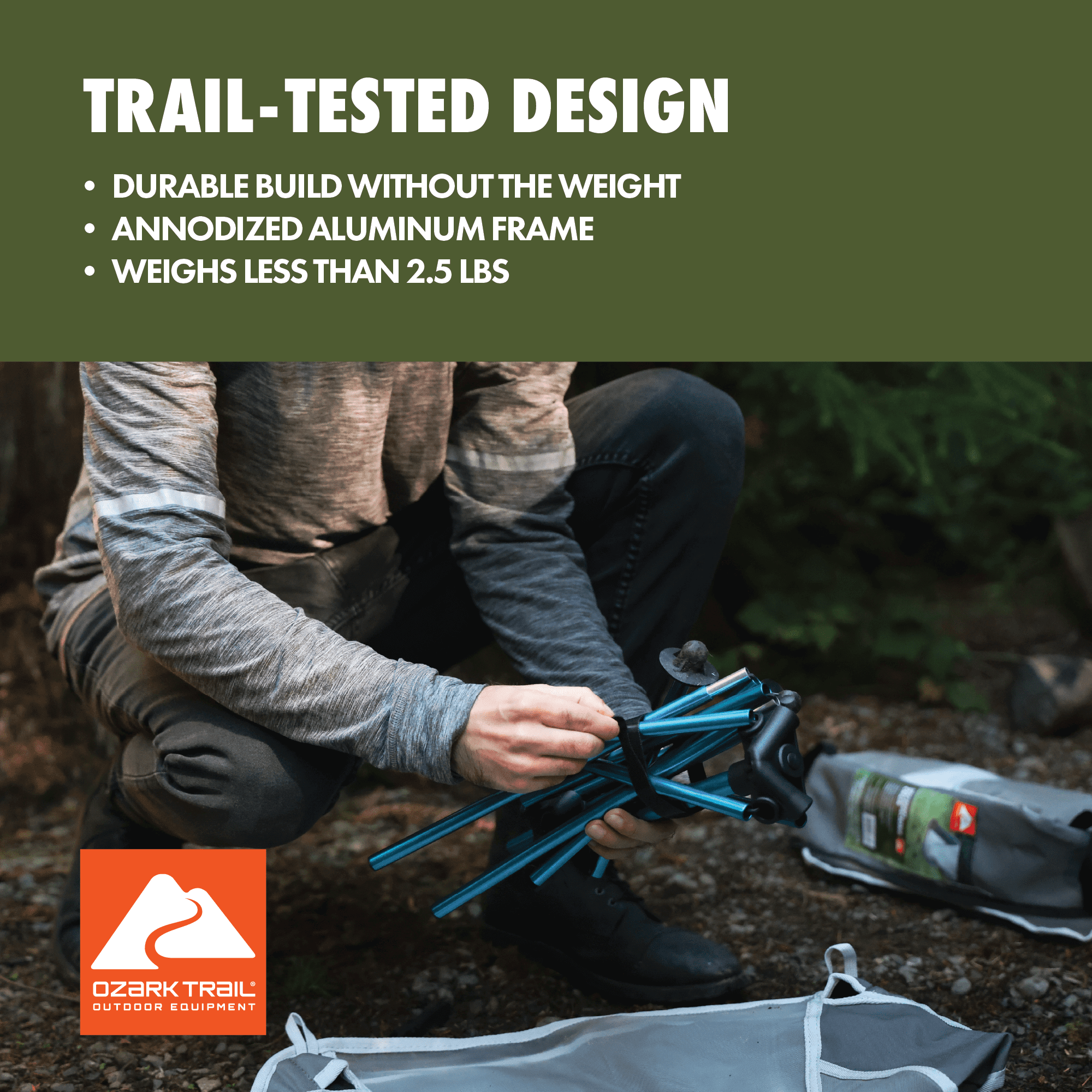 Weighing in at under 2.5 lbs. the Ozark Trail Ultra-lightweight Backpacking Chair with front pocket, is one of our lightest camp chairs. It’s a go-anywhere, do-anything seating option for hiking, backpacking and more. The chair has a Breathable mesh back and an Ultralight aluminum frame design which provides supreme comfort at less then 2.5 lbs. The chair includes is Quick and Easy to Setup and Compacts To 16”x6.5”x5”.