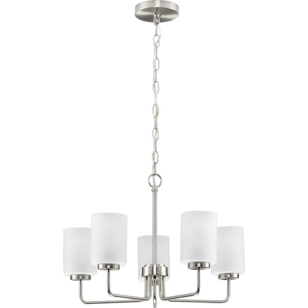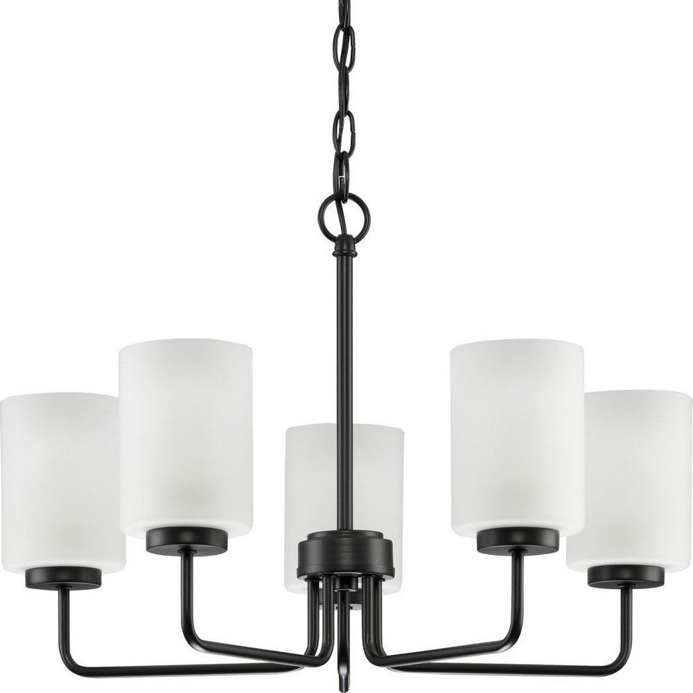 Progress Lighting-P400275-031-Collection: Merry, Material: Steel, Finish Color: Matte Black, Width: 22.12″, Height: 14.75″, Length: 22.12″, Chain Length: 48″, Lamping Type: Incandescent, Number Of Bulbs: 5, Wattage: 100 Watts, Moisture Rating: Dry Rated, Desc: Incorporate a clean, contemporary design with the Merry Collection 5-Light Etched Glass Brushed Nickel Transitional Chandelier Light. Light sources glow from within crisp etched glass shades for a generous elegant glow sure to transform your favorite living space into a modern retreat. The clean-lined tubular frame is coated in a beautiful brushed nickel finish that perfectly blends transitional and modern character. Canopy Included: Yes / Canopy Diameter: 5.12 / Chain Length: 48.00 / Shade Included: Yes / Shade Dimensions: 4 x 4 x 5.37 . ,-Merry – 5 Light Chandelier-Matte Black Finish -Traditional Installation