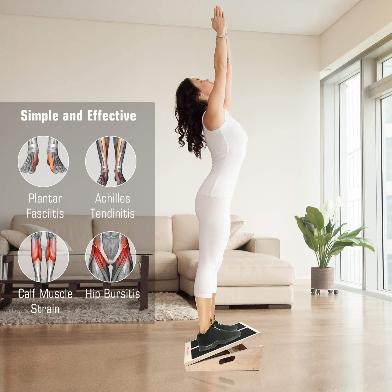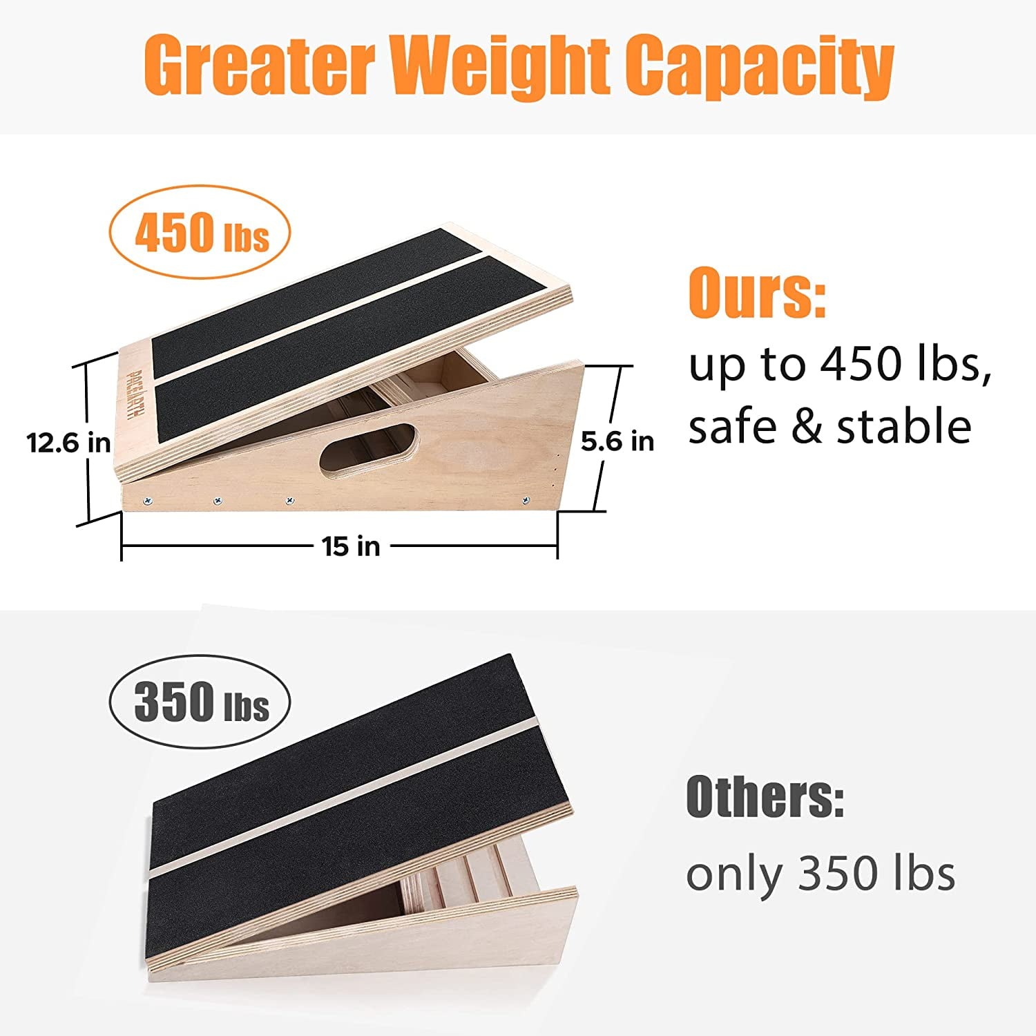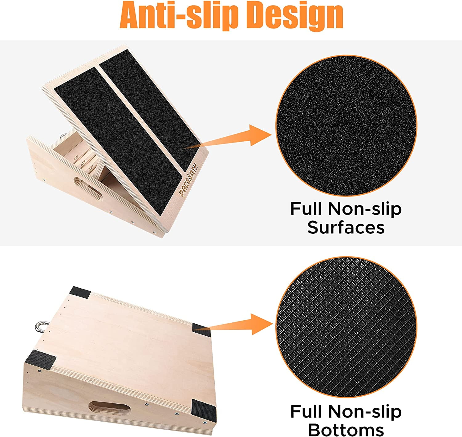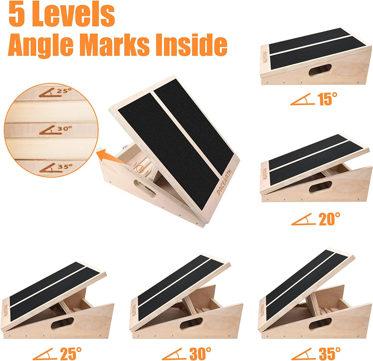 【Extra Metal Ring & Resistance Bands】Equipped with extra metal ring & resistance bands on the PACEARTH calf stretch board, you can do arms resistance training while stretching your feet and legs, maximizing the exercise effect. 【450lbs Weight Capacity】The wood slant board for squat is made of tough plywood with long-term durability and greater weight capacity, and the whole structure is reinforced with steel hinges, strong and safe enough to hold up to 450 lbs. This Achilles tendon stretcher comes fully assembled right out of the box and you can use it anywhere: home, office, gym, or the physical therapy clinics. 【Great Physical Therapy Tool】 Wooden slant board for calf stretching, as an ideal tool for relieving calf muscle strains, plantar fasciitis, hip bursitis and Achilles Tendonitis by stretching out the muscles at an increasing magnitude. If you sit too much and don’t exercise, get one to relieve your leg muscles! 【Anti-Slip Design】The non-slip standing surface of the tread keeps you from slipping and falling even if you use the Most inclined level. The four rubber stops on the bottom keep the wooden slant board steadily put on any flat surface without scratching it, like your floor. 【Adjustable Inclines】The squat wedge can be adjusted between five marked inclines: 15°, 20°, 25°, 30° and 35°. This enables you to choose the suitable level of training calf muscles or recovering from leg symptoms. Your tight calves will be stretched out gradually and the muscle and tendon issues of your legs and feet will disappear eventually.
