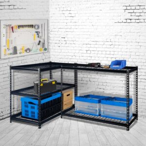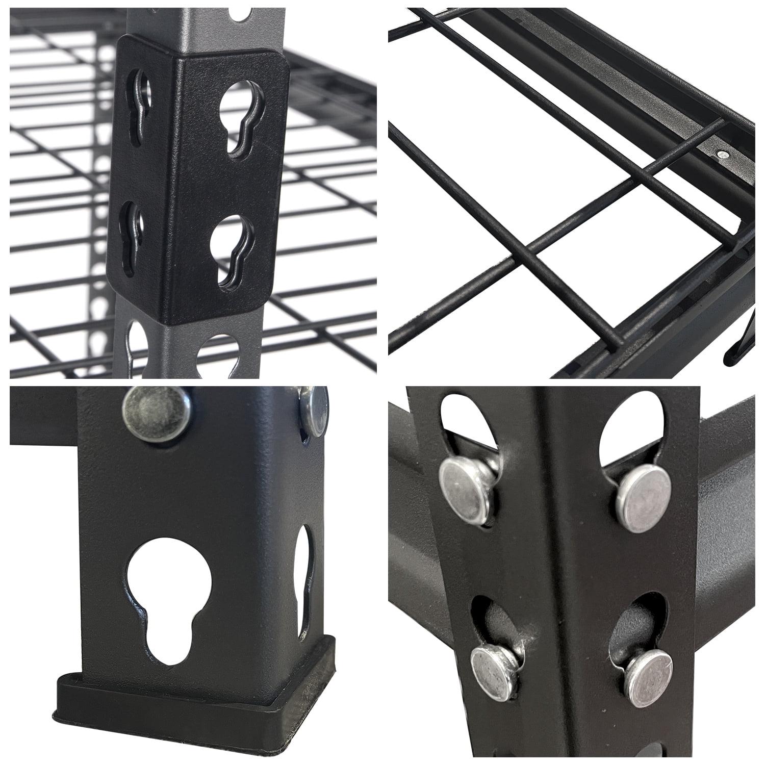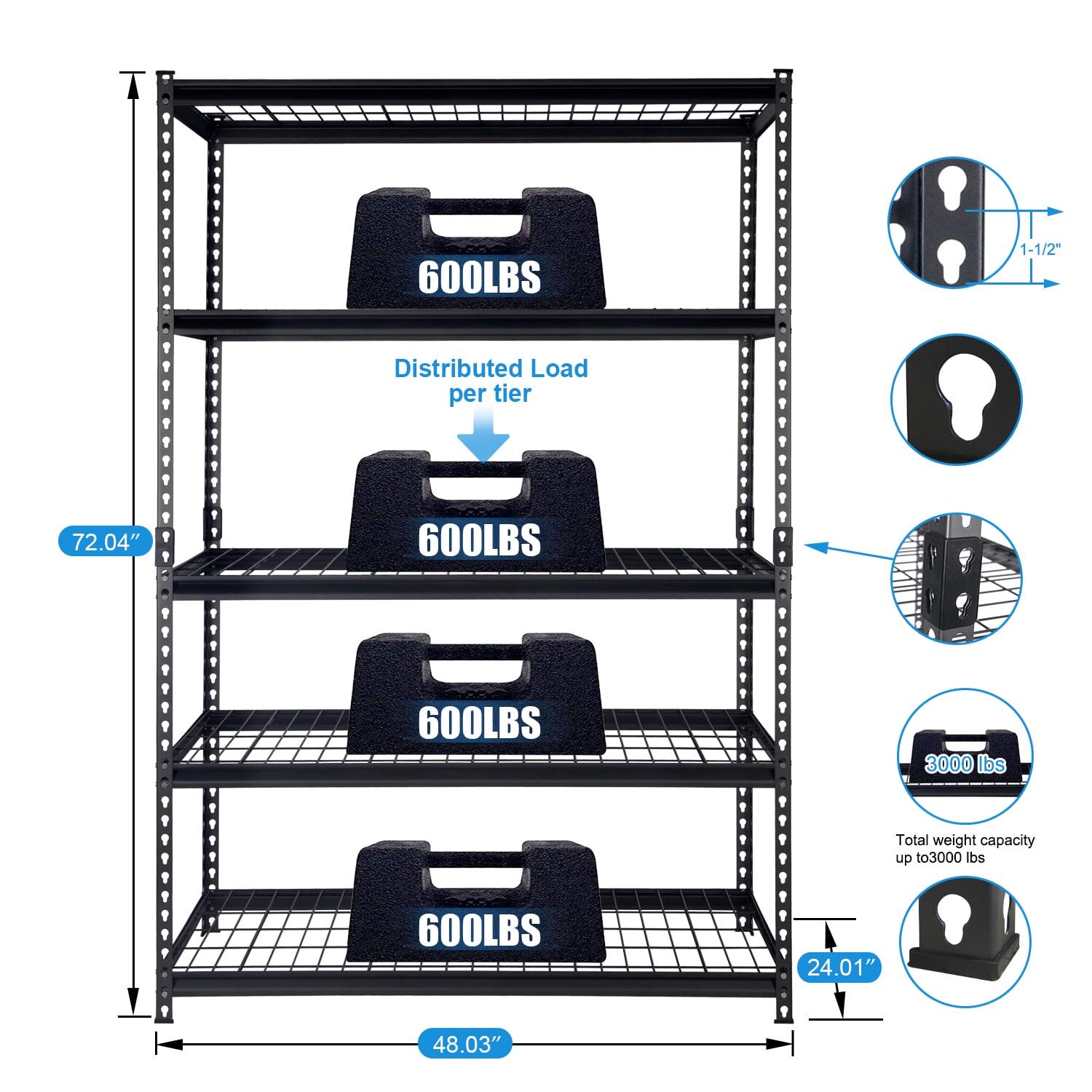 – Steel Beams And Shelves With wire decking and a durable black finish Weight Capacity Of 600Lbs. Per Shelf And 3000 Lbs. In Total