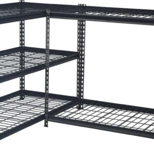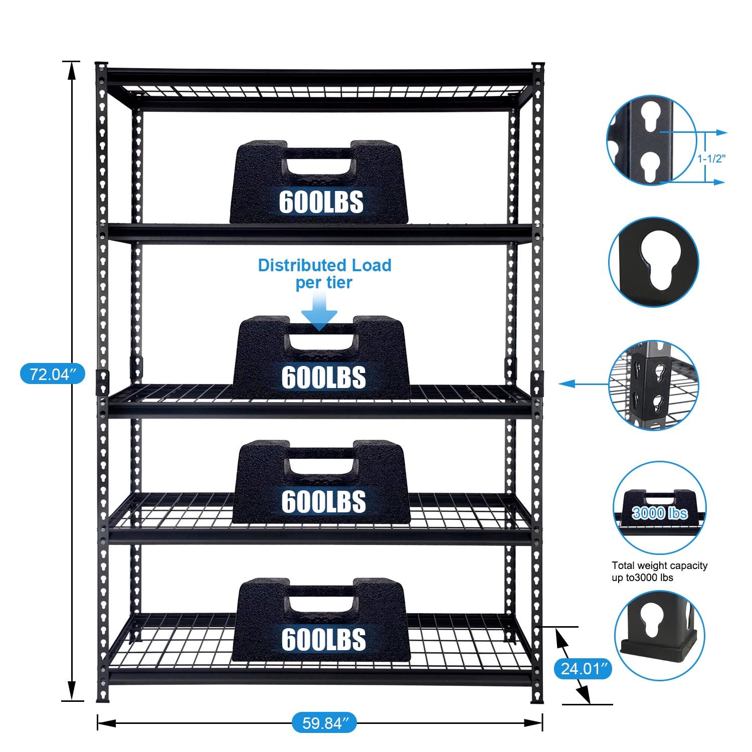 – Steel Beams And Shelves With wire decking and a durable black finish Weight Capacity Of 600Lbs. Per Shelf And 3000 Lbs. In Total