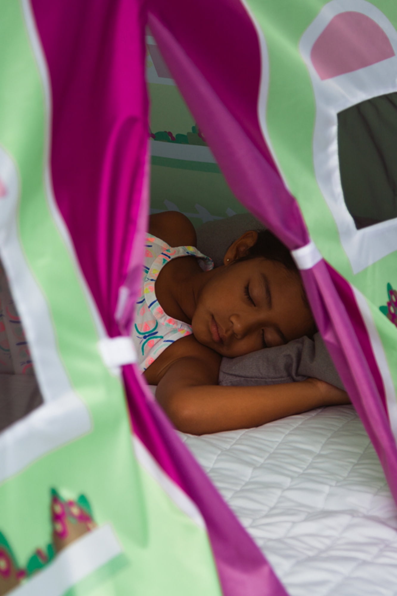 Does your child dream of rolling hills, chirping birds, and flower boxes outside of her windows? Look no further than the Pacific Play Tents Cottage Bed Tent! Measuring in at 77″ x 54″ x 42,” this durable bed tent can accommodate a full size mattress. It also includes double stitched seams along stress points for reinforcement, color-coated Super Poles™ and pole pockets for fast and easy assembly, and a sturdy carry bag for convenient travel and storage. Bed tents make a wonderful bridge between sleeping in a crib to sleeping in a “big girl bed” as they provide a cozy, enclosed space with an exciting theme. Featuring doors that can be tied back with radius-cut hook and loop fasteners as well as ultra-mesh walls that allow for ventilation while keeping bugs at bay, this tent is perfect for letting your child sleep comfortably in safety and style. Sweet dreams!