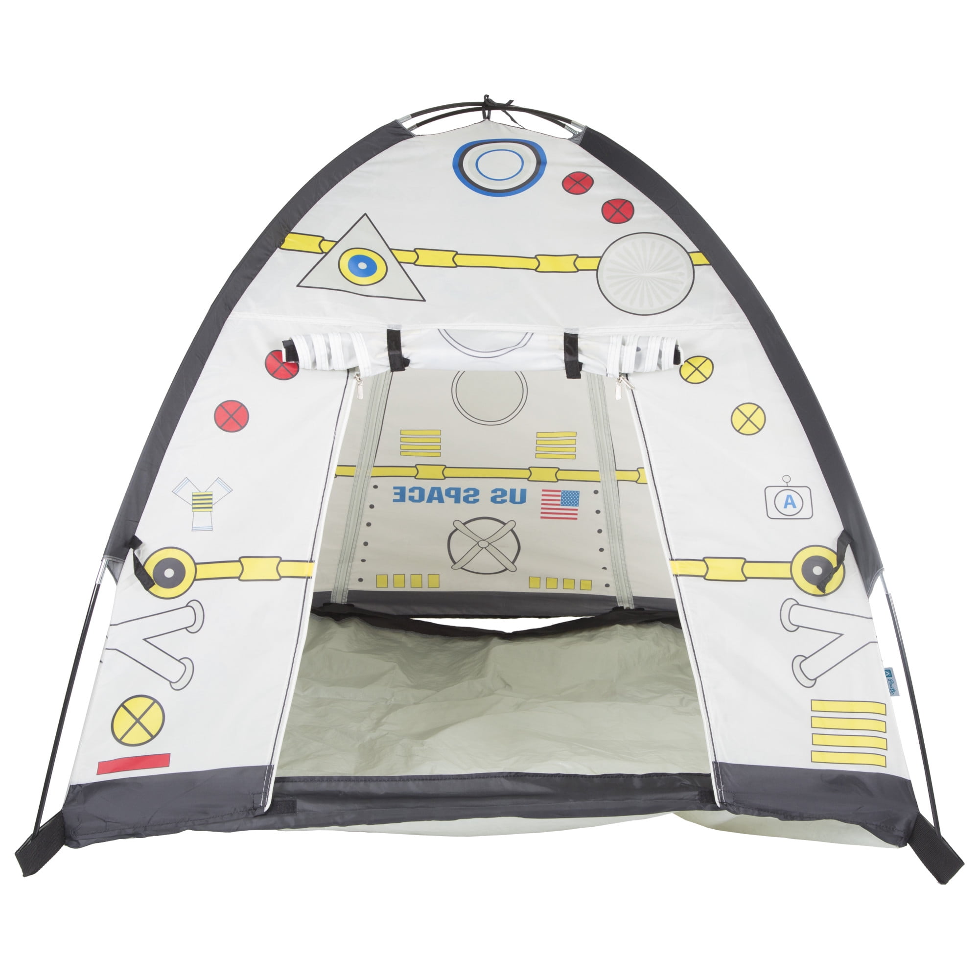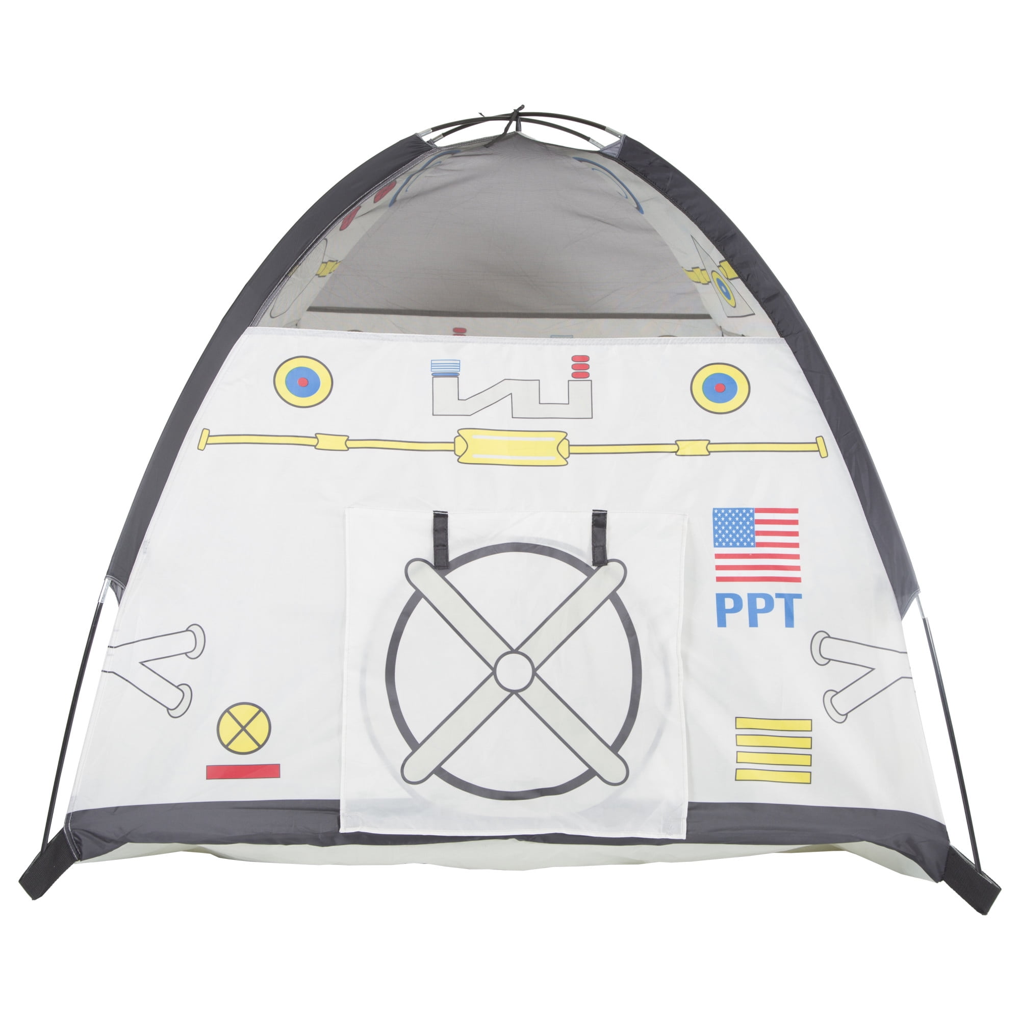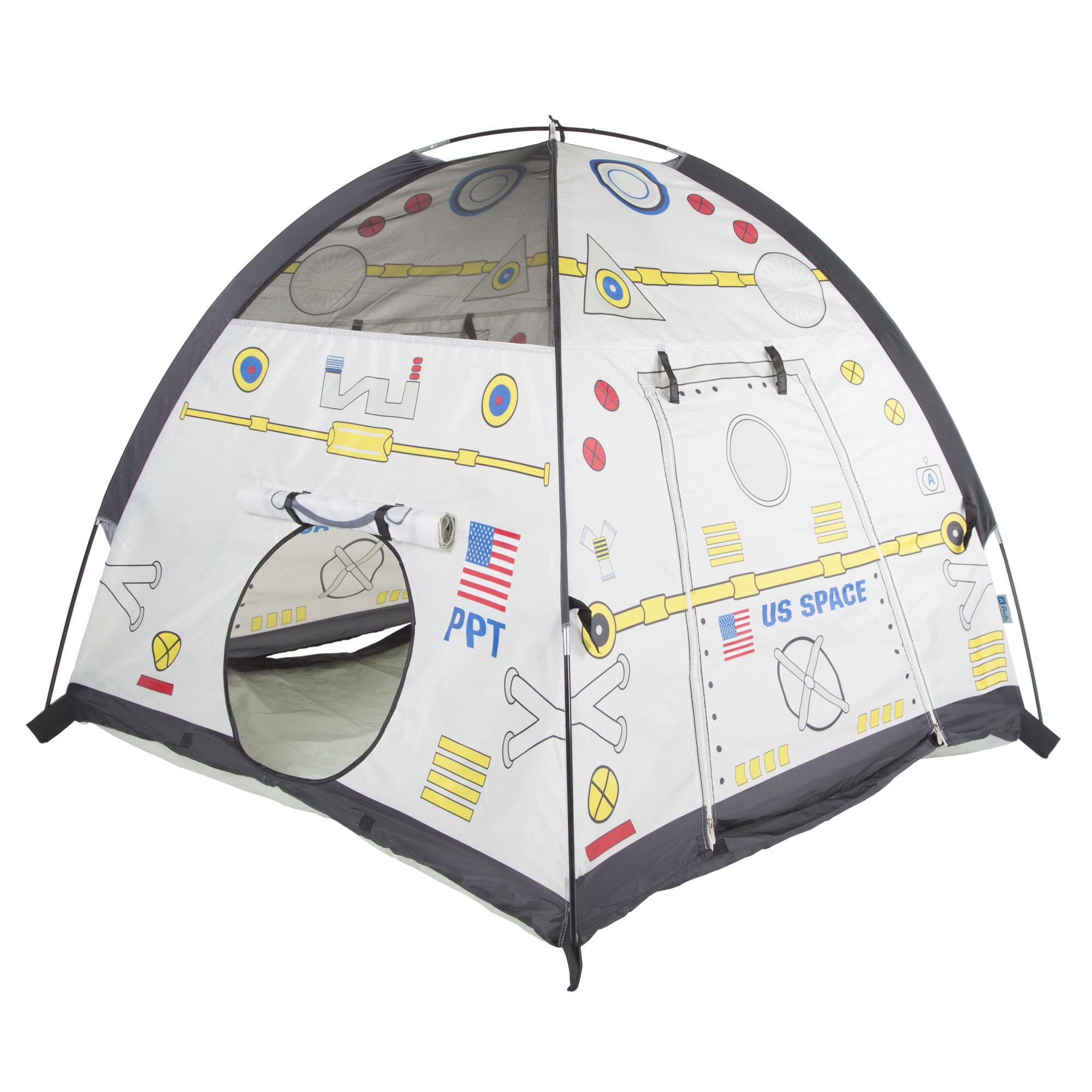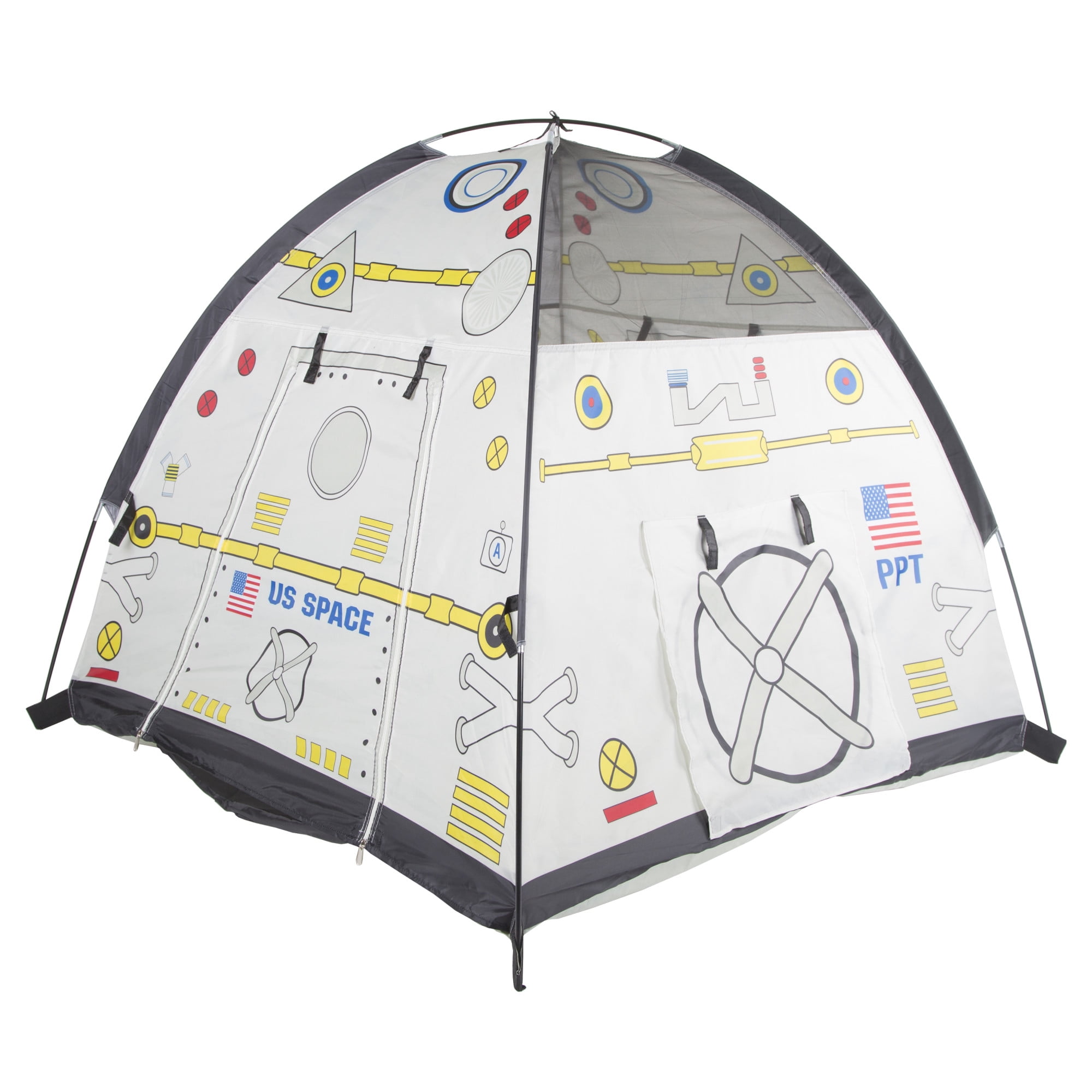 Pacific Play Tents Space Module Tent: Exciting graphics for a real-life play experience Dome tent with mesh panels 2 roll-up “hatch flaps” for secret access Tunnel hole Durable, waterproof polyethylene floor Cleans easily with a damp cloth and mild soap Sturdy PU-coated shock-corded poles for easy assembly 70 denier, 190T polyester taffeta with PU coating Flame retardant, meets CPAI-84 and ASTM F963 safety standards Adult assembly required Tent dimensions: 48″W x 48″D x 42″H Box dimensions: 17″L x 17″W x 3″H