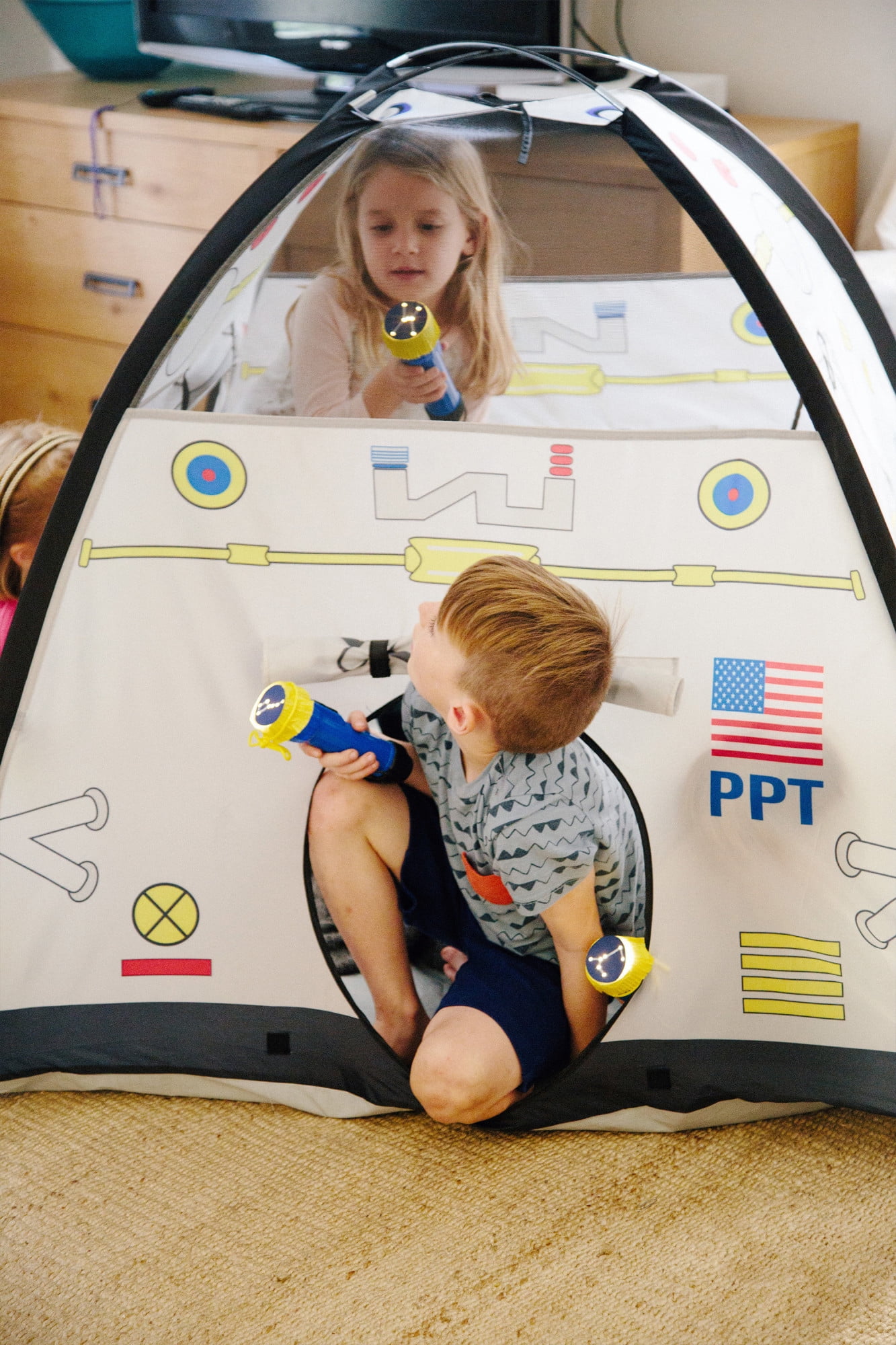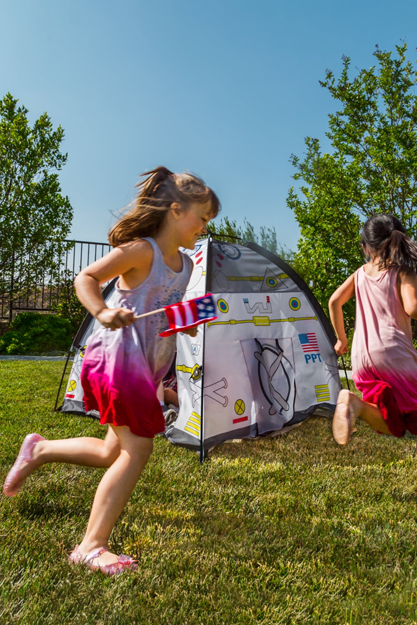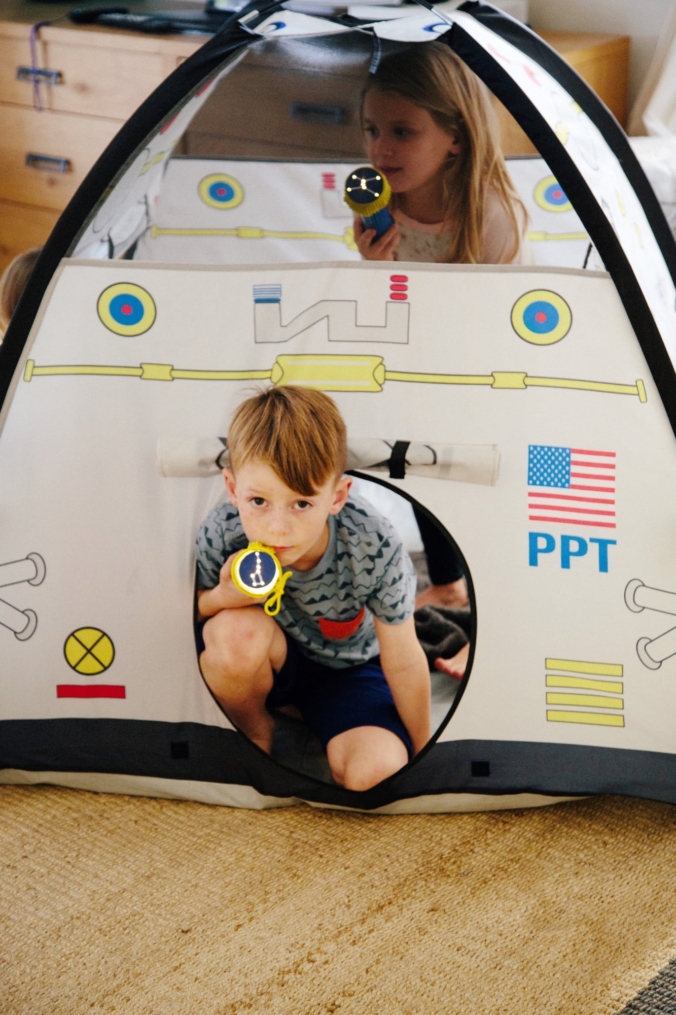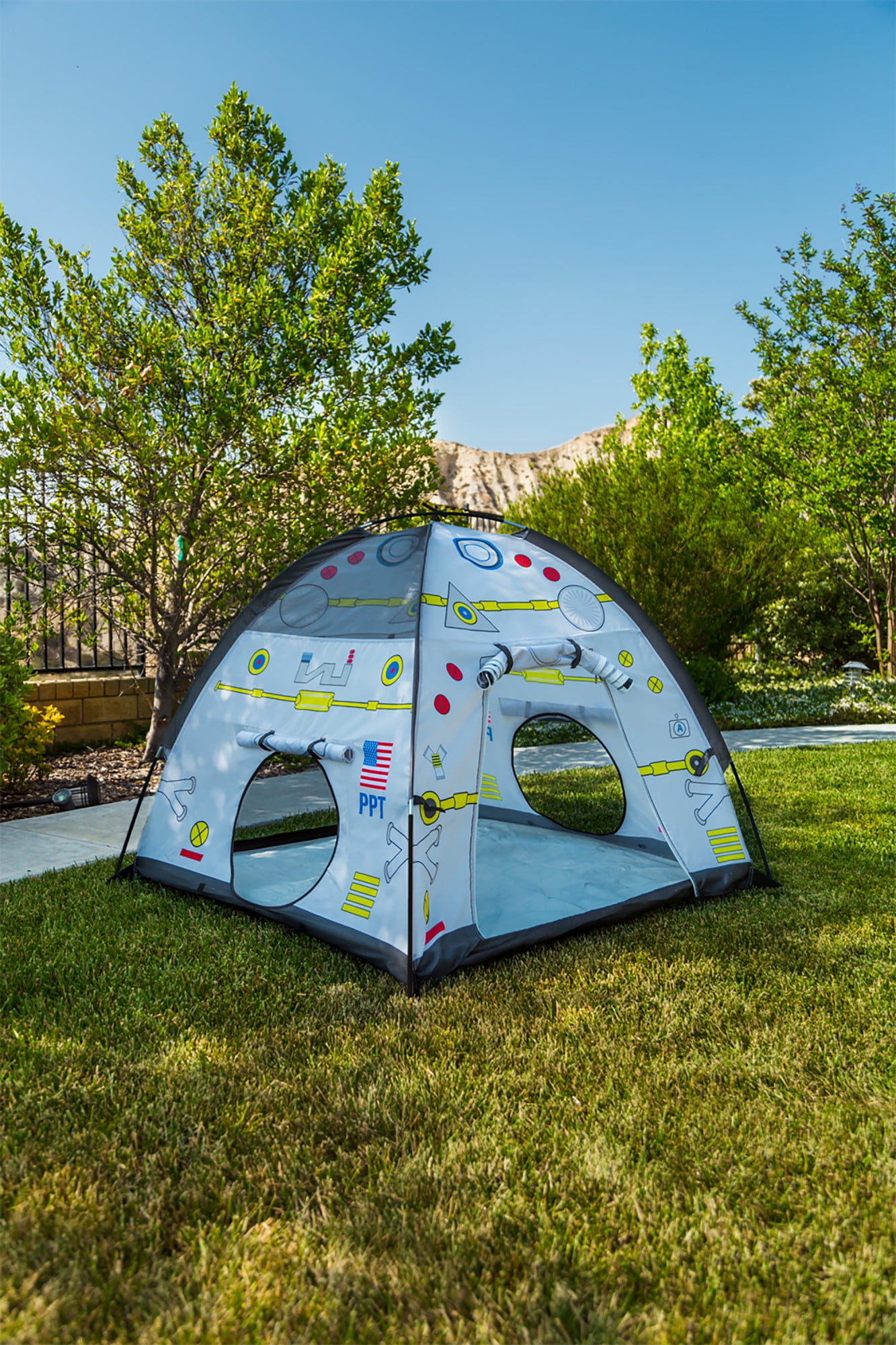 Pacific Play Tents Space Module Tent: Exciting graphics for a real-life play experience Dome tent with mesh panels 2 roll-up “hatch flaps” for secret access Tunnel hole Durable, waterproof polyethylene floor Cleans easily with a damp cloth and mild soap Sturdy PU-coated shock-corded poles for easy assembly 70 denier, 190T polyester taffeta with PU coating Flame retardant, meets CPAI-84 and ASTM F963 safety standards Adult assembly required Tent dimensions: 48″W x 48″D x 42″H Box dimensions: 17″L x 17″W x 3″H