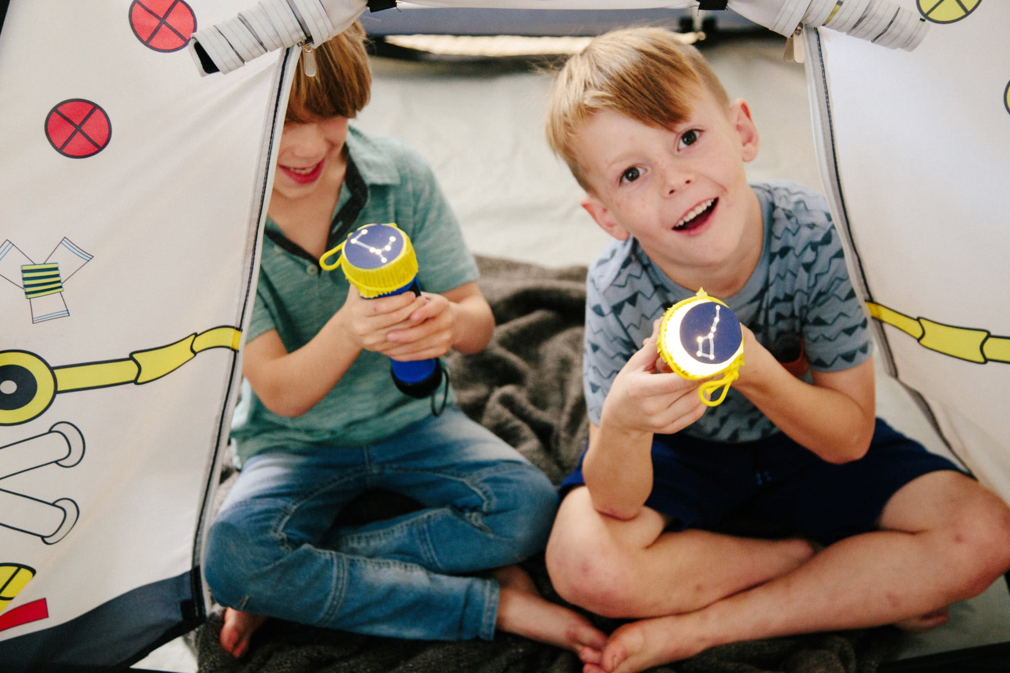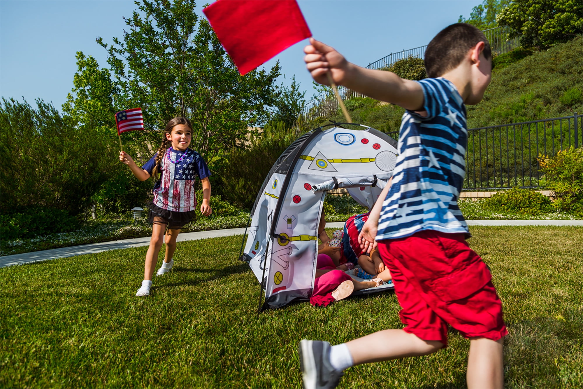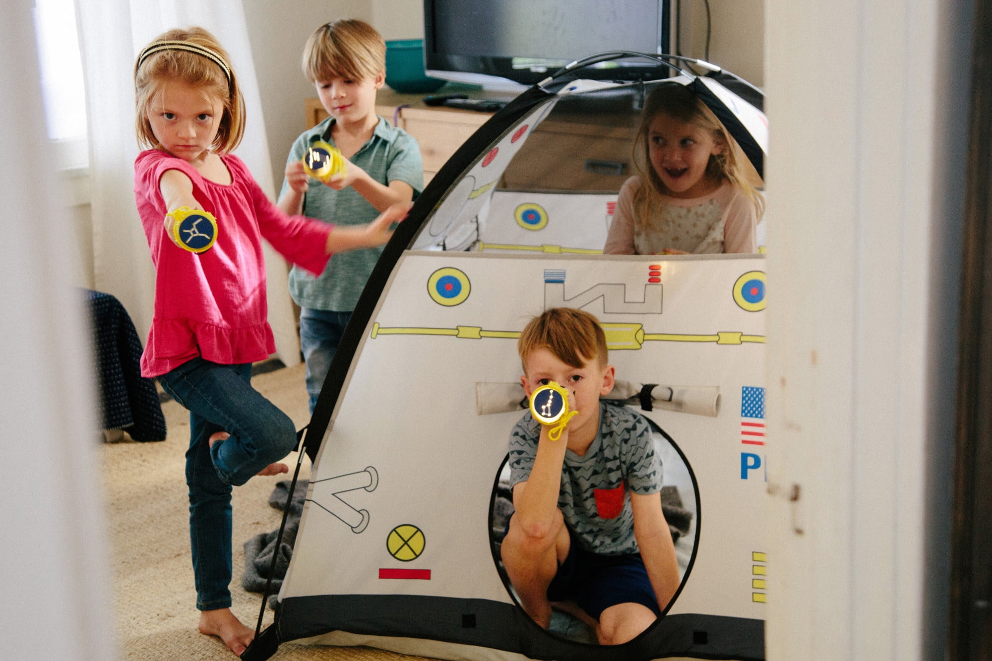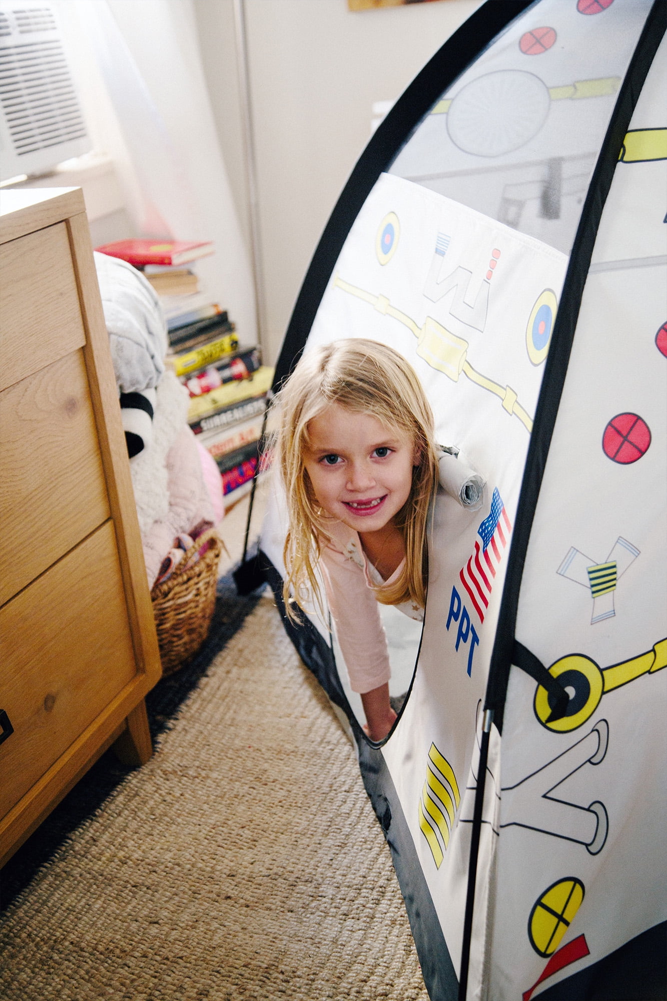 Pacific Play Tents Space Module Tent: Exciting graphics for a real-life play experience Dome tent with mesh panels 2 roll-up “hatch flaps” for secret access Tunnel hole Durable, waterproof polyethylene floor Cleans easily with a damp cloth and mild soap Sturdy PU-coated shock-corded poles for easy assembly 70 denier, 190T polyester taffeta with PU coating Flame retardant, meets CPAI-84 and ASTM F963 safety standards Adult assembly required Tent dimensions: 48″W x 48″D x 42″H Box dimensions: 17″L x 17″W x 3″H