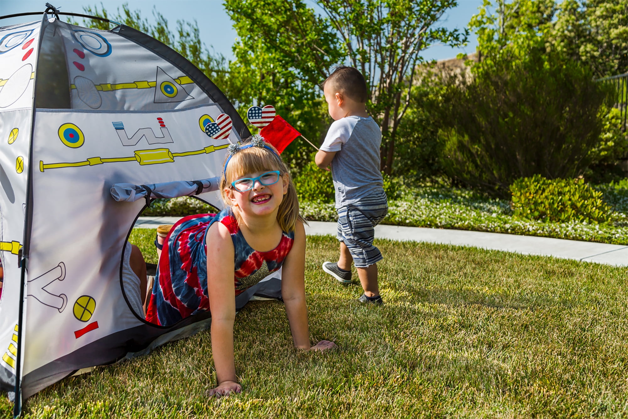 Pacific Play Tents Space Module Dome Tent takes your child’s imagination to the moon, this dome tent is perfect for a backyard adventure or indoor fun on a rainy day. This tent has enough room for friends, toys and kid-sized furniture. Features a durable washable floor, mesh panels for ventilation and easy viewing. The color-coded G-3 Super Poles make for easy assembly. Cleans easily with a damp cloth and mild soap. Includes carry bag.