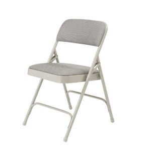 Made with comfort, elegance and strength in mind, the NPS 2202 grey fabric-upholstered folding chair is made with stain-resistant Scotchguarded fabric covering 1¼- inch thick foam on our most popular frame. The institutional-grade frame is made from heavy-duty grey powder-coated 18-gauge round tubing with two U-shaped double-riveted cross-braces. Color-coordinated V-tip stability plugs provide added reinforcement and matching replaceable glides prevent floor damage.