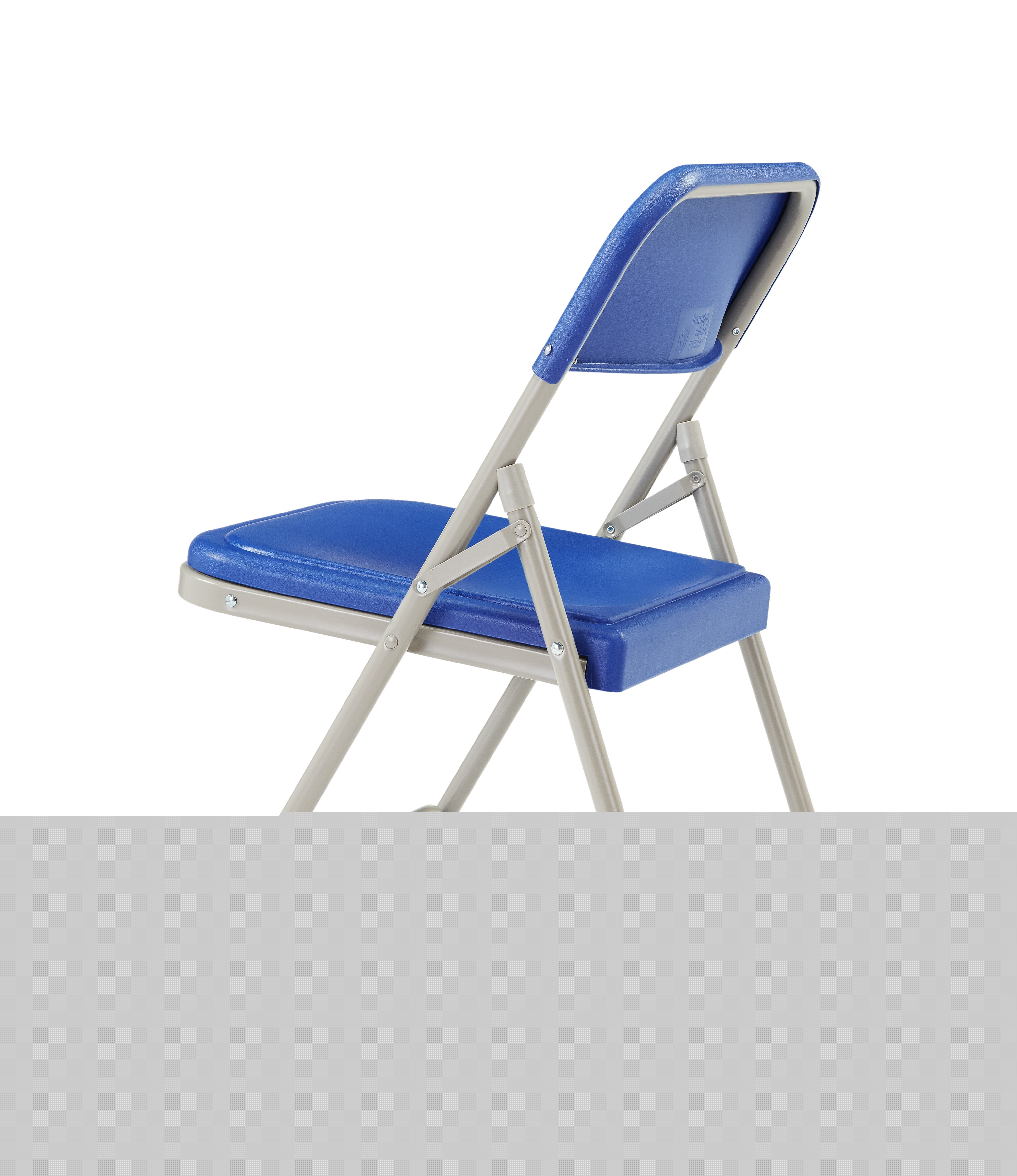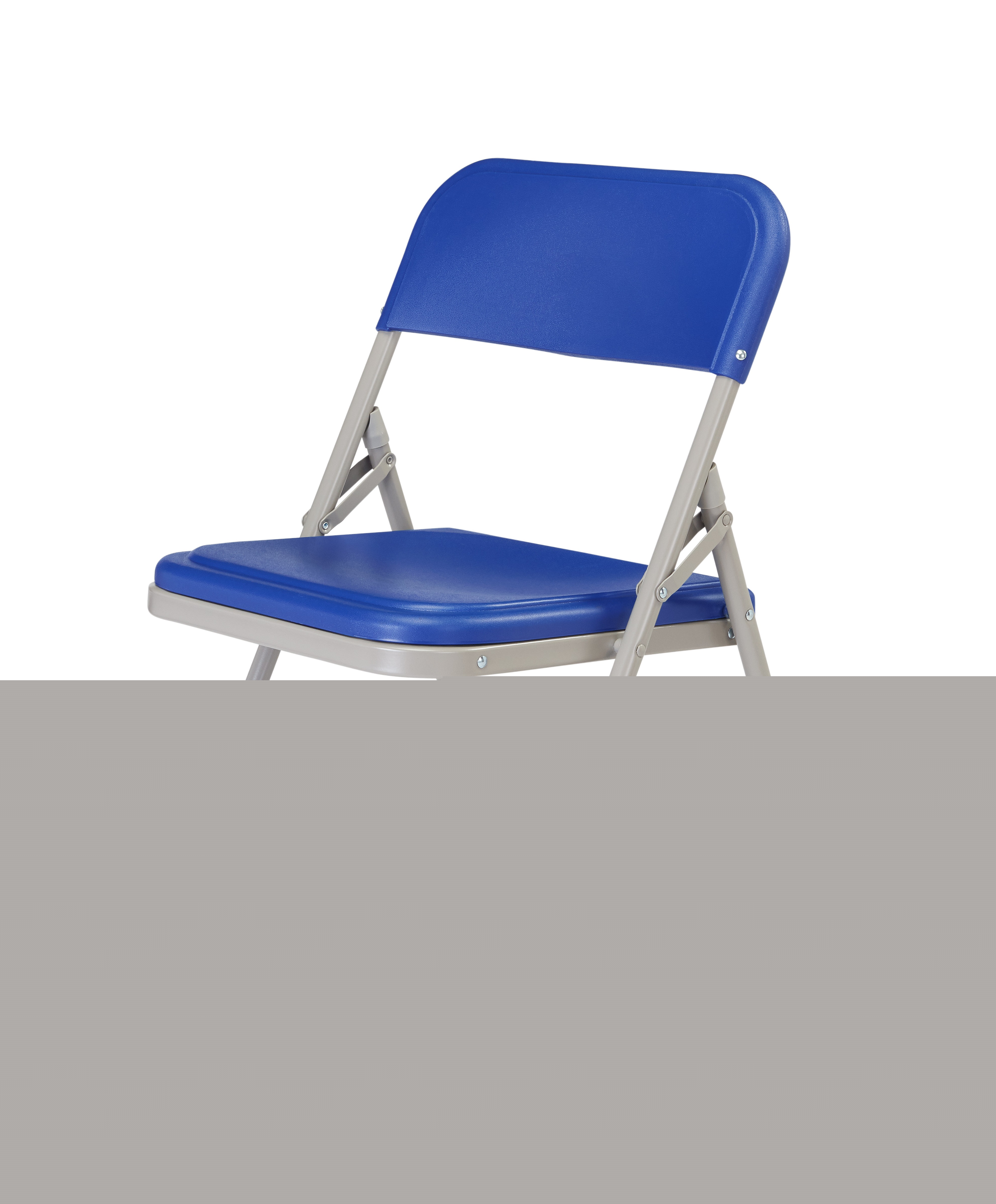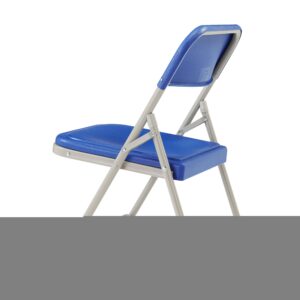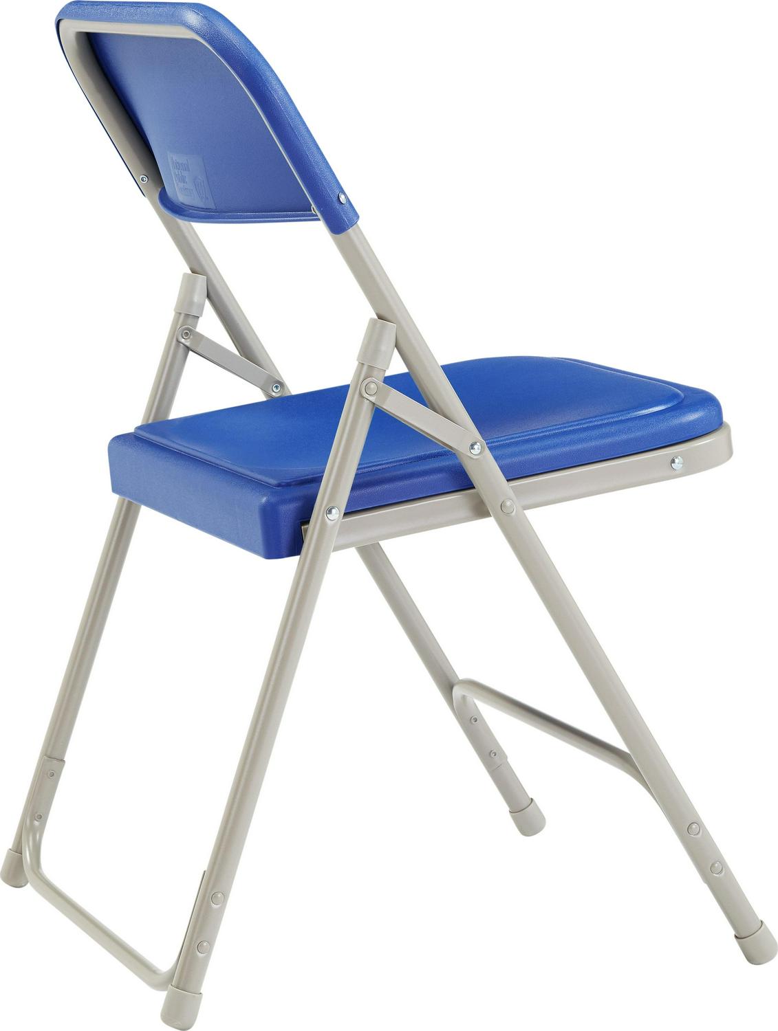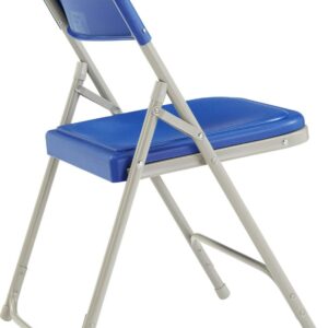 The NPS 800 Series folding chair offers the perfect solution for both indoor and outdoor seating events such as meetings, graduations and receptions. This lightweight institutional-grade blue chair was made to provide you with the strengths of metal and all the benefits of plastic. The grey powder-coated 18-gauge tubular steel frame features two double-riveted U-braces to securely support the double-hinged legs. The large seat and backrest are made of comfortable contoured color-impregnated plastic to prevent fading and rusting. Color-coordinated V-tip stability plugs provide added reinforcement and matching replaceable glides prevent floor damage.