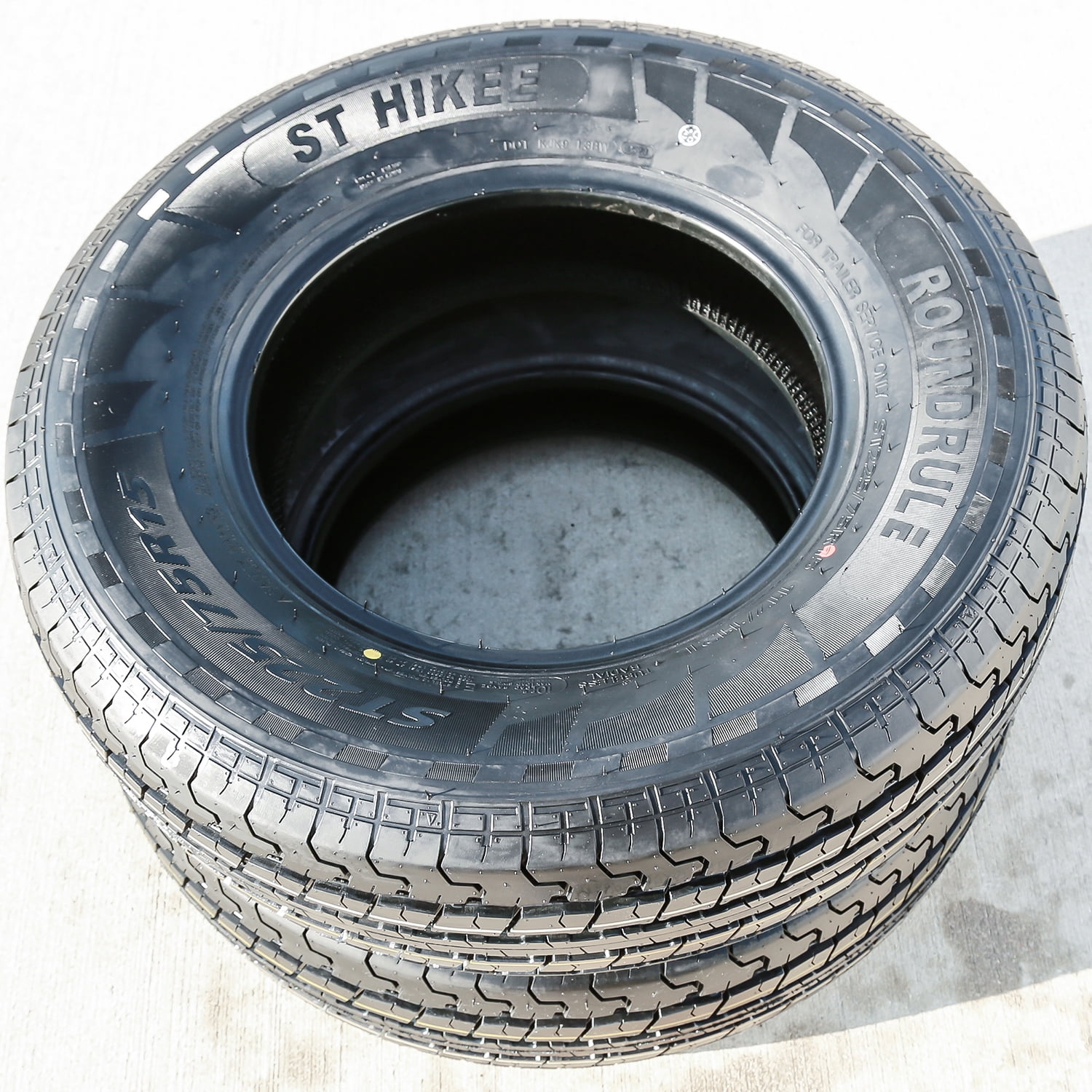Roundrule ST Hikee OVERVIEW The Roundrule ST Hikee is a highway terrain, all season tire made for trailers. This tire is NOT MEANT TO BE MOUNTED ON LIGHT TRUCKS, as its construction will not support the weight and performing style of such vehicles. It can ONLY BE MOUNTED ON TRAILERS. Exceptional all season traction is guaranteed with this model. The all season compound works with the symmetric ribbed tread design in order to upgrade its dry, wet, and winter weather grip. The sipe and groove pattern firmly grips the road with extra biting edges, optimizing road grip. Stronger compound elements keep the tire pliable throughout the year, in warmer summer and colder winter conditions alike. Circumferential grooves prevent hydroplaning, effectively dispersing water and slush from the footprint. The tire offers great controllability and maneuvering as well. The center ribs and the ideal shoulder blocks work together in order to improve the tire’s road contact at all times. As a result, quick and precise steering responses are guaranteed, while the structure is secured against driving pressure. It also helps to combat trailer swaying. The shoulder blocks pattern provides additional biting edges, gripping the road during maneuvering. The combination of these improvements ensures the towing vehicle’s control over the trailer. The ST Hikee utilizes the radial construction, in order to improve its load durability. The strengthened internal structure maintains the ideal tire shape under load and driving pressure. In this manner, it effectively upgrades its load-carrying capability. This enables the tire’s exceptional load-handling ability, optimizing its performance in heavy-duty applications. Manufacturers recommend changing tires every 10 years. As long as tires are properly stored before they are sold, the year of their manufacture will not shorten their service life.