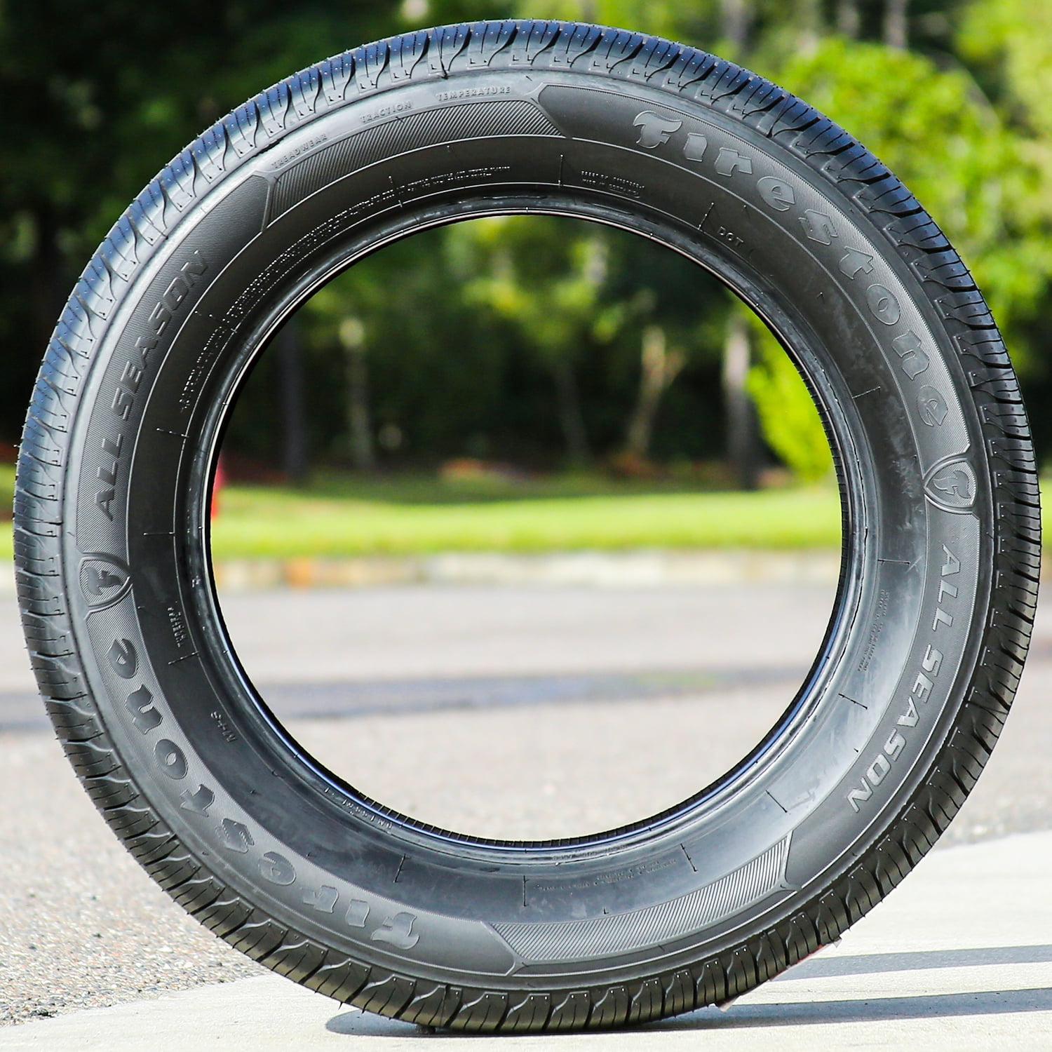 Firestone All Season OVERVIEW The Firestone All Season is a touring all season tire manufactured for passenger and crossover vehicles. Firestone offers a 55,000 mile treadwear warranty for the crossover utility vehicle sizes and a 65,000 mile treadwear warranty for the passenger car sizes. The tire promotes exceptional all weather traction and road gripping ability. The combination of the silica-based tire compound and the symmetric tread pattern with the deep siping detail ensures a safe all weather road gripping ability. The improved all weather traction is further improved by the tire’s hydroplaning resistance, which is made possible with the four wide circumferential grooves dispersing water from below the tire footprint. The better road gripping ability and hydroplaning resistance improve the year round driving safety. The symmetric tread pattern extends the tread life and tire usability greatly. The symmetric design evenly distributes the forces of acceleration, cornering and braking across the tread area. The equal spread of the driving pressure across the tread area prevents irregular wear patterns from forming along the tread surface, which extends the tread life and tire usability. As the tire can be used for a longer period of time, it is more cost-efficient. The maintained road contact and the tire’s internal structure work together to ensure excellent handling. The symmetric tread pattern’s constant road gripping ability improves the steering responsiveness and accuracy and makes sure that the tire’s steering response to the driver’s commands is quick and precise. The strengthened internal structure stabilizes the tire against the driving pressure affecting it by maintaining the optimal tire shape throughout the drive. The enhanced steering and stability allow the tire to be confidently controlled all year. The Firestone All Season offers a comfortable drive. The internal structure features two steel belts with a spirally wrapped nylon reinforcement above the polyester body casing. As a result, the tire keeps its optimal shape under the driving pressure and it absorbs the shock of driving. This reduces the road vibrations felt in the vehicle’s cabin, promoting an enjoyable driving experience. Manufacturers recommend changing tires every 10 years. As long as tires are properly stored before they are sold, the year of their manufacture will not shorten their service life.