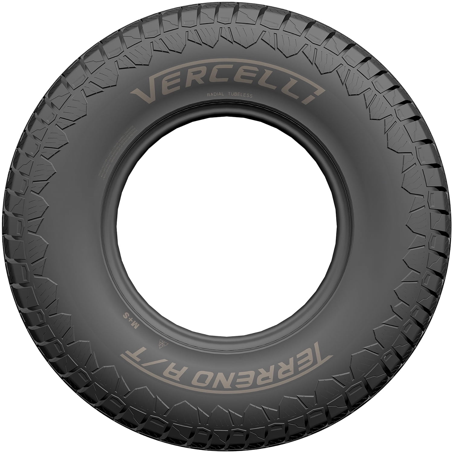 Vercelli Terreno A/T OVERVIEW The Vercelli Terreno A/T is an all terrain, all weather tire manufactured for SUVs and light trucks. Vercelli offers a 50,000 mile treadwear warranty with this model. The tire enhances its all terrain performance. The stable footprint features staggered blocks and wider grooves, which enables the tire to significantly enhance its on-road and various terrain traction. These tread elements provide the needed biting edges in order to enhance its soft, loose, and uneven terrain performance. They help to enhance the tire’s consistent forward motion, while also increasing its self-cleaning ability. The tread pattern disperses mud and snow, preventing them from blocking its surface contact. Stone retention is also effectively avoided as rocks are ejected from between the tread elements. Stronger compound elements and stable tread elements upgrade the tire’s service life. These tread elements enable the tire to upgrade its pressure circulation across the tread area. In this manner, the tire avoids irregular wear, allowing pressure build-up on sensitive tread parts. The strengthened rubber materials decrease the treadwear rate, by using wear-resistant elements. This significantly lowers its overall wear rate, boosting the model’s tread life. The tread’s consistent road and terrain contact enhances its controllability. The tire manages to increase its steering responsiveness and driving stability, promoting better handling. As a result, the tire helps to offer a quick and precise steering response to the driver’s commands, while the structure is secured against driving pressure. This helps to effectively enable the driver’s better control over the vehicle at all times. During the on-road drive, the variable pitch pattern lowers the tire’s road noise levels. This tread design helps to minimize the levels of sound waves reaching the vehicle’s cabin. The tread’s variable pattern generates a sound-canceling frequency that negates sound waves before they can reach the passengers. As road disturbances do not ruin the passenger’s driving enjoyment, offering a quiet driving experience. The Terreno A/T enhances its all weather traction. The compound and the detailed footprint allow the tire to increase its dry, wet, and winter grip. These elements firmly grip the road, by using additional biting edges. The stronger compound helps to optimize rubber flexibility in versatile weather conditions. The ideal groove pattern disperses water and slush from the footprint, preventing hydroplaning during the tire’s on-road performance. All weather tires receive the three mountain peak and snowflake (3PMS) symbol for their exceptional winter weather performance. They are all season tires with extra winter weather grip, in order to guarantee safer year-round durability. This ensures their true and secure driving ability throughout the year. Not all tire sizes are suitable for all vehicle types. Please refer to the item specifications for accurate information about vehicle type fitment for this particular size. Manufacturers recommend changing tires every 10 years. As long as tires are properly stored before they are sold, the year of their manufacture will not shorten their service life.