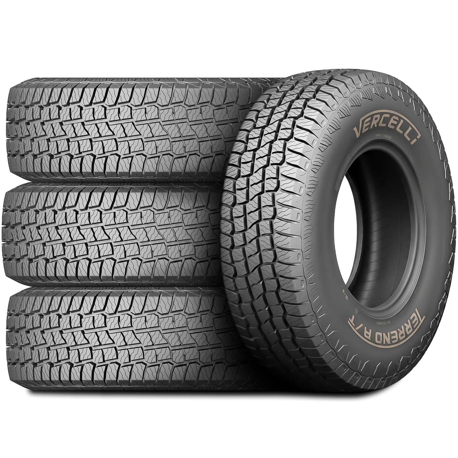 Vercelli Terreno A/T OVERVIEW The Vercelli Terreno A/T is an all terrain, all weather tire manufactured for SUVs and light trucks. Vercelli offers a 50,000 mile treadwear warranty with this model. The tire enhances its all terrain performance. The stable footprint features staggered blocks and wider grooves, which enables the tire to significantly enhance its on-road and various terrain traction. These tread elements provide the needed biting edges in order to enhance its soft, loose, and uneven terrain performance. They help to enhance the tire’s consistent forward motion, while also increasing its self-cleaning ability. The tread pattern disperses mud and snow, preventing them from blocking its surface contact. Stone retention is also effectively avoided as rocks are ejected from between the tread elements. Stronger compound elements and stable tread elements upgrade the tire’s service life. These tread elements enable the tire to upgrade its pressure circulation across the tread area. In this manner, the tire avoids irregular wear, allowing pressure build-up on sensitive tread parts. The strengthened rubber materials decrease the treadwear rate, by using wear-resistant elements. This significantly lowers its overall wear rate, boosting the model’s tread life. The tread’s consistent road and terrain contact enhances its controllability. The tire manages to increase its steering responsiveness and driving stability, promoting better handling. As a result, the tire helps to offer a quick and precise steering response to the driver’s commands, while the structure is secured against driving pressure. This helps to effectively enable the driver’s better control over the vehicle at all times. During the on-road drive, the variable pitch pattern lowers the tire’s road noise levels. This tread design helps to minimize the levels of sound waves reaching the vehicle’s cabin. The tread’s variable pattern generates a sound-canceling frequency that negates sound waves before they can reach the passengers. As road disturbances do not ruin the passenger’s driving enjoyment, offering a quiet driving experience. The Terreno A/T enhances its all weather traction. The compound and the detailed footprint allow the tire to increase its dry, wet, and winter grip. These elements firmly grip the road, by using additional biting edges. The stronger compound helps to optimize rubber flexibility in versatile weather conditions. The ideal groove pattern disperses water and slush from the footprint, preventing hydroplaning during the tire’s on-road performance. All weather tires receive the three mountain peak and snowflake (3PMS) symbol for their exceptional winter weather performance. They are all season tires with extra winter weather grip, in order to guarantee safer year-round durability. This ensures their true and secure driving ability throughout the year. Not all tire sizes are suitable for all vehicle types. Please refer to the item specifications for accurate information about vehicle type fitment for this particular size. Manufacturers recommend changing tires every 10 years. As long as tires are properly stored before they are sold, the year of their manufacture will not shorten their service life.