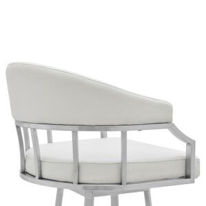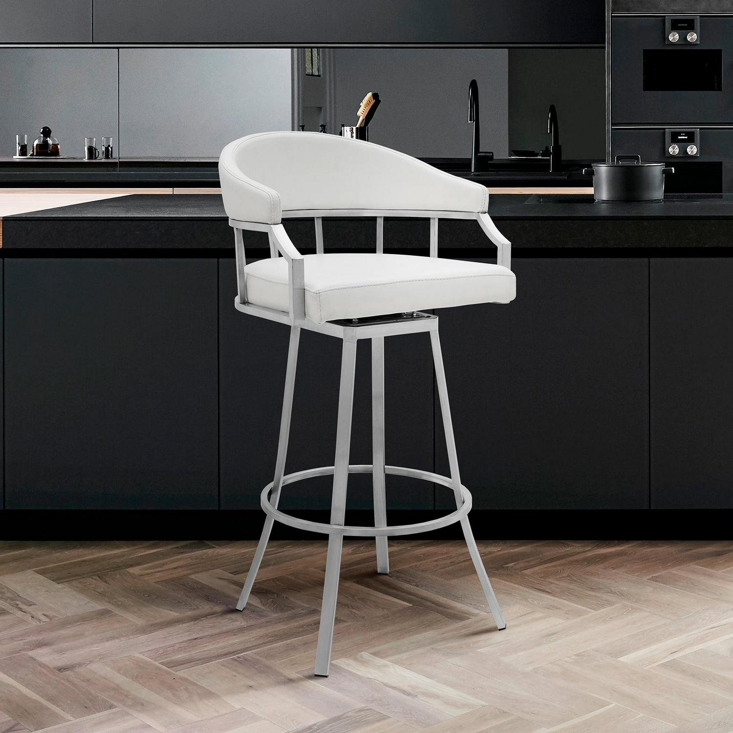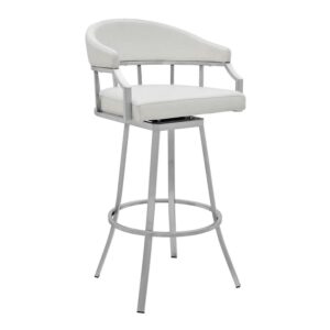 The Palmdale Swivel Modern Metal and Faux Leather Bar and Counter Height Stool is a fabulous and functional furniture addition to any home! This beautiful stool is upholstered in butter soft faux leather in multiple color options. The frame of the Palmdale stool is constructed from brushed stainless steel that is sturdy enough to last for many years to come. Enjoy full mobility with the 360-degree swivel functionality that allows you to join in on the conversation from any part of your kitchen or bar area. The padded and upholstered back rest gives you comfort that only increases with its convenient metal ring footrest. Enjoy a luxurious style bar or counter stool that is unique in style and practical in function. The Palmdale Swivel Modern Metal and Faux Leather Bar and Counter height stools are available in a sleek brushed stainless-steel finish and come in your choice of White, Slate Grey or Black faux leather.