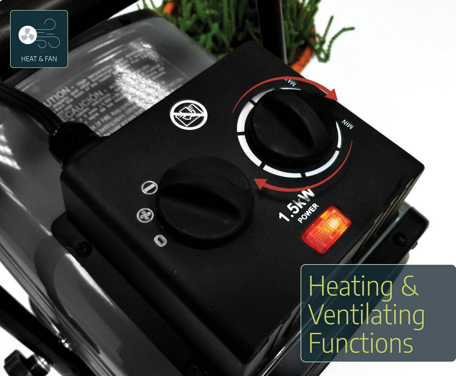 – Largest air output & heating cell in the 1500-W greenhouse heater market 233 m³/h. based on 43W durable fan equipped with bearing suitable for humid environments