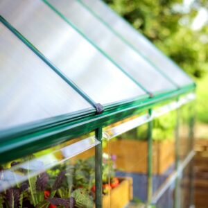 There is something very rewarding about growing your own flowers, herbs, or vegetables, and greenhouses provide the ideal environment to make that happen. The Hybrid 6′ x 4′ Greenhouse from Palram – Canopia combines two types of polycarbonate panels to create a balanced environment for your plants. The translucent polycarbonate roof panels have twice the heat retention of single layer panels and allow the light to reach your plants at all angles while the crystal-clear polycarbonate side panels provide over 90% light transmission and block harmful UV rays. Polycarbonate is a virtually unbreakable polymer that provides the light transmission of glass, but is lighter, stronger, and safer. Palram – Canopia engineers their panels and aluminum frames to be strong, highly resistant to harsh weather and sun, and durable. This attention to detail continues with an integrated gutter system for drainage as well as a roof vent and hinged door to provide airflow and allow adjustment of heat, humidity, and ventilation. The 6′ x 4′ Hybrid Greenhouse comes as a complete kit and can be quickly and easily assembled. Extend the enjoyment of your growing season and protect your plants from harsh weather and pests with the Palram – Canopia Hybrid Greenhouse kit!