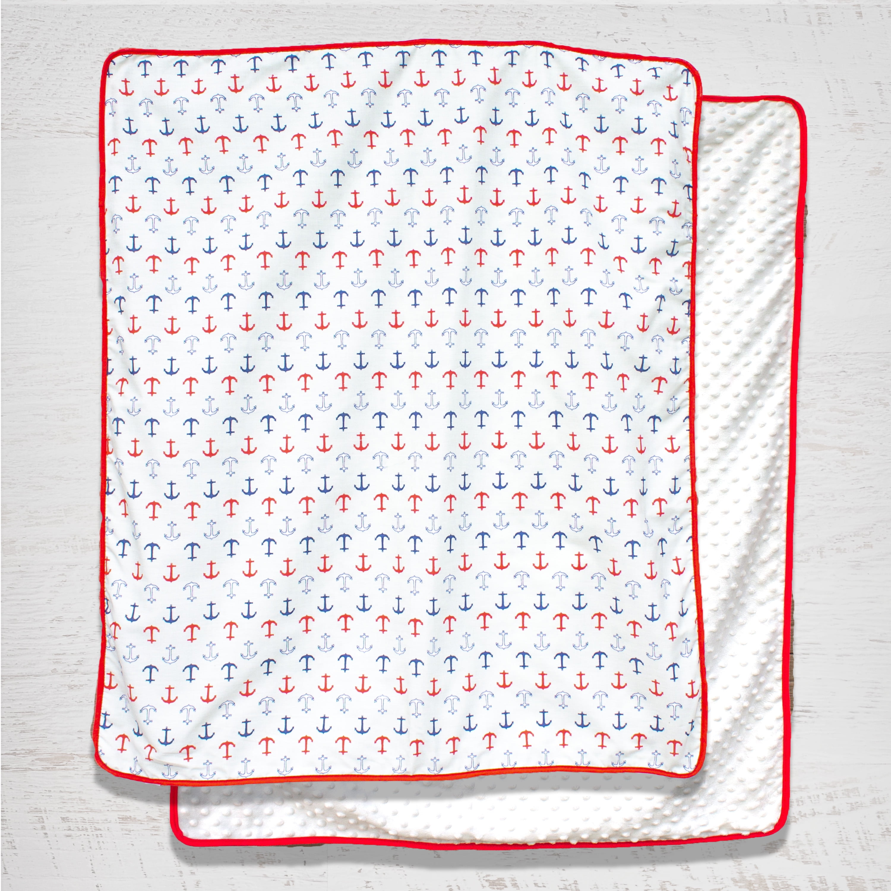 Pam Grace Creations Anchors Away 3 Piece Crib Bedding Set · Set includes Reversible Chenille Dot Baby Blanket, Fitted Crib Sheet and Crib Skirt. · Other matching items available to complete your Anchors Away Nursery set include Reversible Chenille Dot Blanket, Boppy Cover, Changing Pad Cover, Curtain Panels and Lamp Shade. · Soft Cotton/ Poly Blend freshens up quickly with machine wash and dry. · Imported · Red, Navy, Grey, White