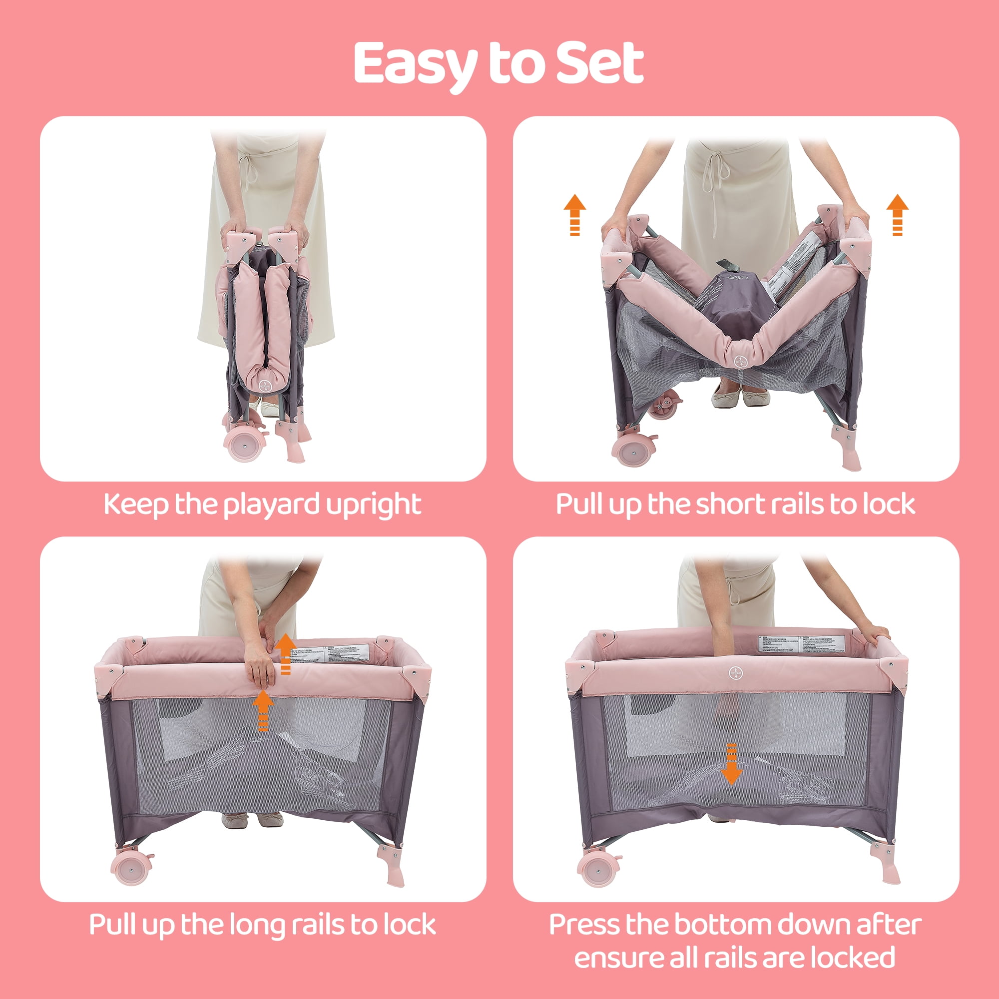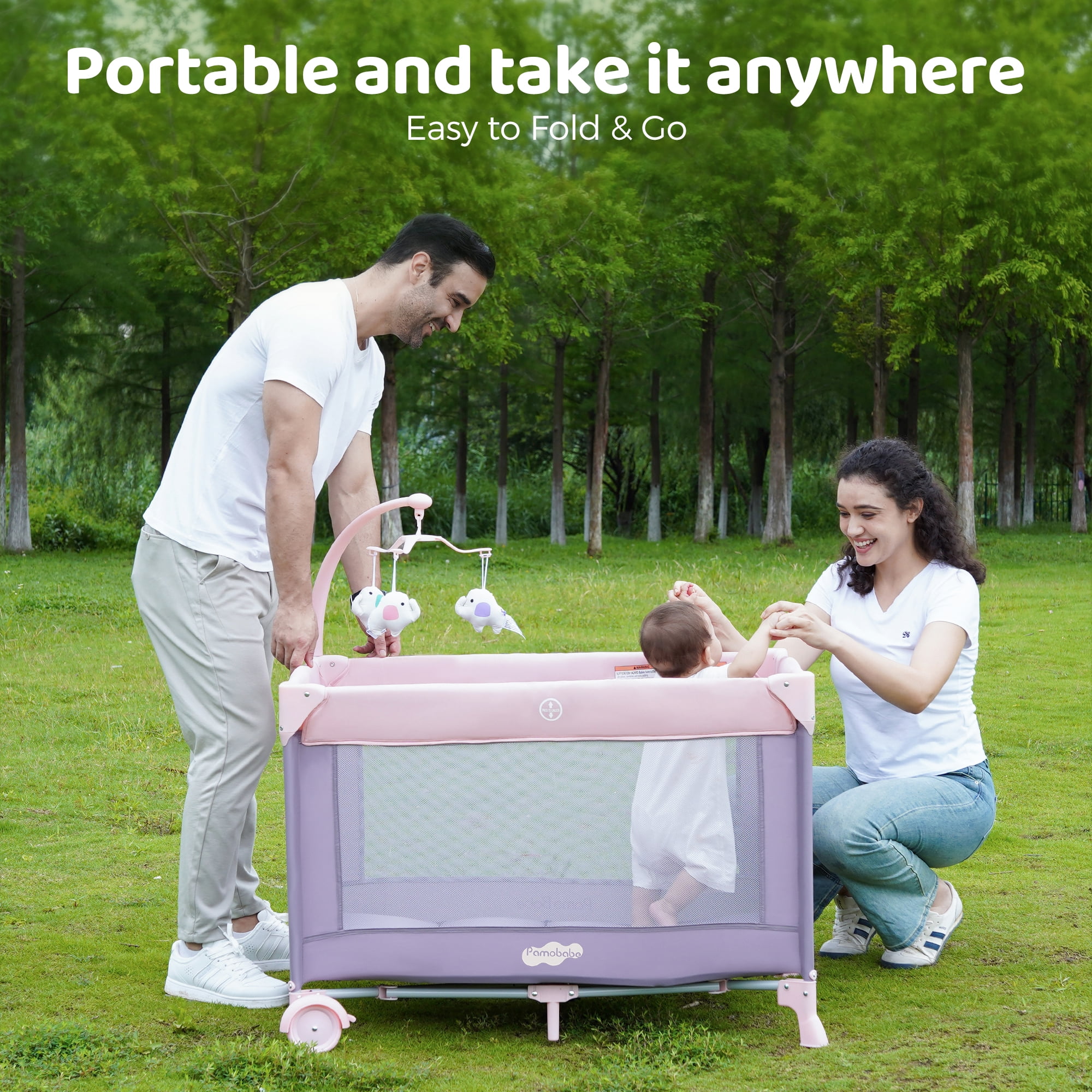 The Pamo Babe portable play yard will provide you convenient and pragmatic place for baby sleeping and playing! The Unisex Infant play yard includes a removable full bassinet, changing table, storage bag . Easy locking mechanism makes the 4-panels Playpen stable and it can be moved from place to place with large wheels and secured with brakes. Also included is a convenient travel tote bag. The Play yard with an incline less than or equal to 7° from horizontal while in using. Size Details: Unfolded Sizes:39.4*27.6*27.6 inch folded Sizes:28*14*10.23 inch Assembled Product Weight:31 Pounds Age group:0-36 months for Newborn