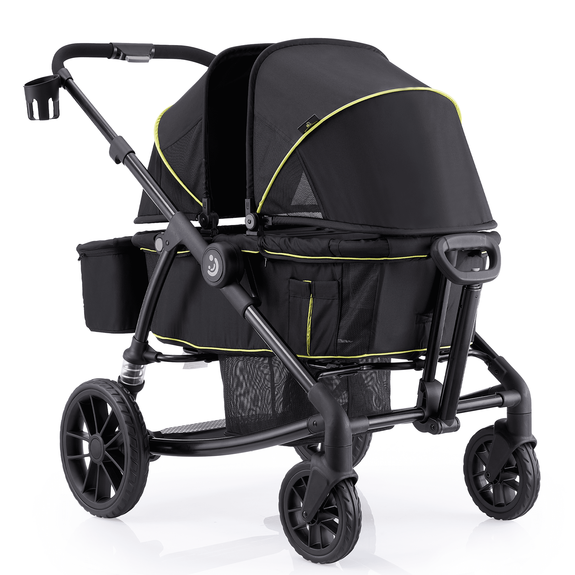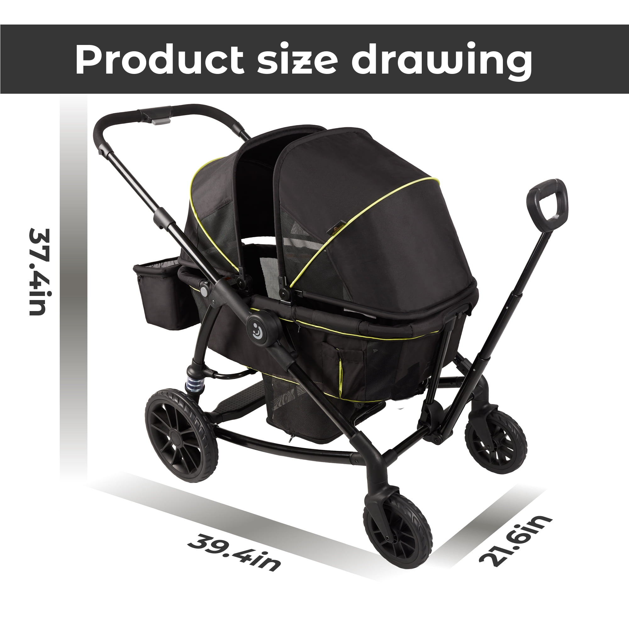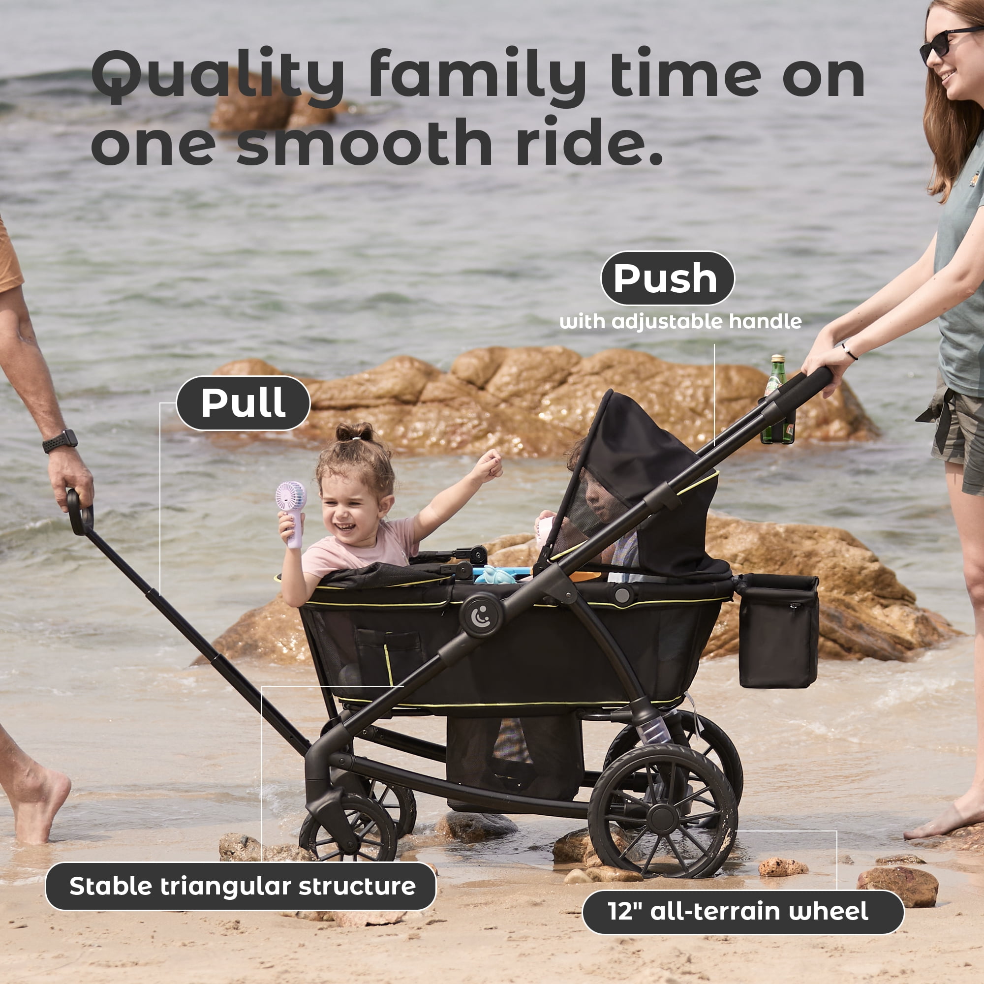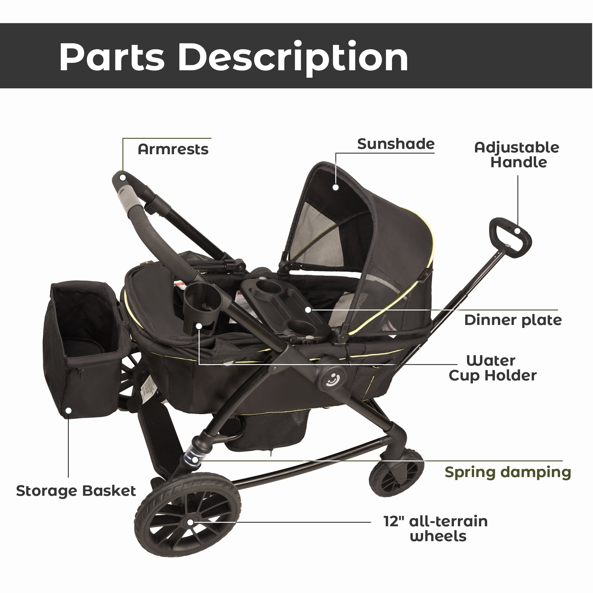 Built to last: This wagon stroller’s unique triangular frame is made to withstand even the toughest terrains. As your childs grow, you can transform your wagon stroller into a ride stroller that accommodates up to a 5-year-old. All-terrain design: With 12” extra-large rear wheels and wheel suspension, the wagon stroller can navigate any terrain, from sand to mud to rocks, in any weather, from rain to snow. Safe and comfortable: With extra spacious padded seating, an ergonomic footrest, your childs will stay comfortable from road to trail and everywhere in-between. Better Protection: With two UPF 50+ sun-shielding canopys,a Rain cover and a Mosquito net, protect your childs from any harm in the wild. As your childs grow: Rear standing pedal design,you can transform your wagon stroller into a stroller that accommodates up to over 5-year-old.