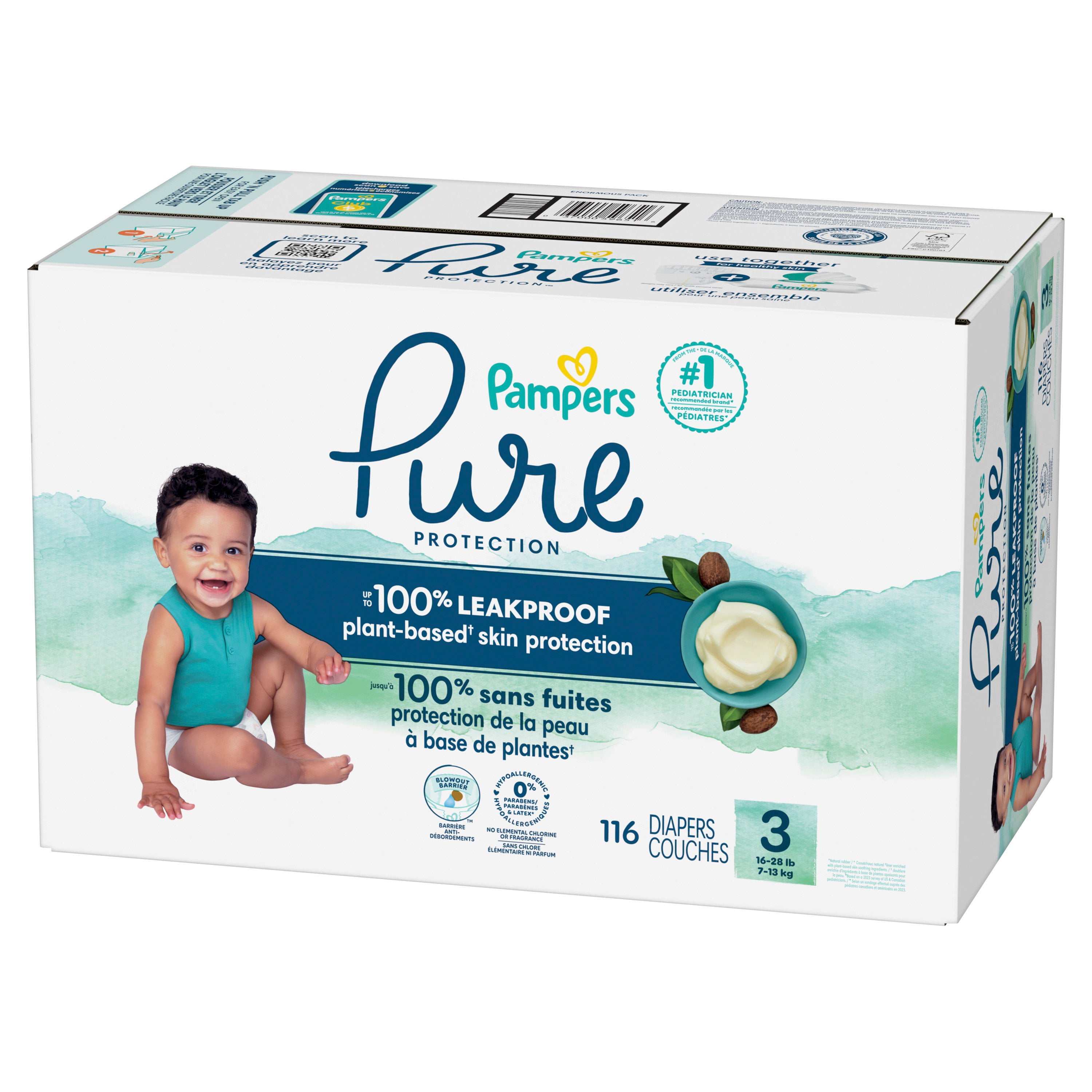 Your search for pure protection that works is over! Designed to help skin stay dry and healthy, Pampers Pure Protection diapers lock wetness away from skin for up to 12 hours for outstanding leakage protection withskin-loving care. Plus, our designer, boutique prints make Pampers Pure just as precious as they are protecting. We’ve thoughtfully chosen all of our ingredients to care for your baby’s precious skin. Our exclusive, plant-based liner** is enriched with shea butter to help nourish and protect skin while our outer cover is enhanced with premium cotton, making Pampers Pure Protection diapers irresistibly soft and breathable. But the ingredientswe’ve chosen to leave out are just as important. That’s why Pampers Pure Protection diapers are free of elemental chlorine, fragrance, parabens, and latex* and are hypoallergenic.*Natural rubber**Plant-based and polypropylene blend The Seal of Cotton and cotton enhanced are trademarks of Cotton Incorporated. cotton enhanced soft outer cover contains 15% cotton.