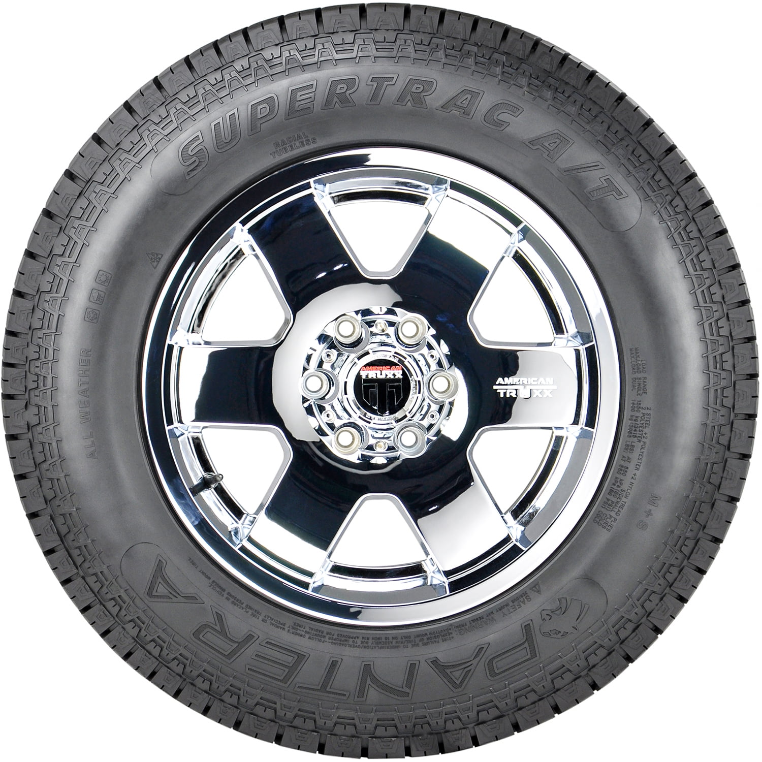 Pantera Supertrac A/T OVERVIEW The Pantera Supertrac A/T is an all terrain, all season tire manufactured for SUVs and light trucks. Pantera offers a 45,000 mile treadwear warranty with this model, as long as the vehicle is not used in off-road and commercial applications. This model guarantees exceptional on- and off-road terrain grip. The staggered block pattern, along with the sipe and groove placement, significantly increases the tire’s surface grip. They generate the needed number of biting edges, in order to optimize its on-road and soft, uneven, and loose terrains. Its consistent forward motion through deep mud and loose dirt terrains is guaranteed in this manner. Its self-cleaning capability is also promoted as the wider grooves and special stepped blocks eliminate mud, snow, and rocks stuck between the tread elements. Stone retention is also avoided as a result. Better handling is also offered since the footprint ensures the tire’s consistent surface contact. The tire helps to greatly upgrade its steering responsiveness and driving stability. In this manner, the driver’s consistent control over the vehicle at all times, as the fast and precise steering responses ensure a safer drive. Additionally, it also secures the structure against the driving pressure, which greatly upgrades the tire’s overall performance. The all season compound and the detailed tread design improve its year-round traction. This combination enables the tire’s dry, wet, and winter-weather grip. In other words, these enhancements work together to guarantee the tire’s performance in versatile weather conditions. Furthermore, the ideal groove pattern channels water and slush from the footprint. This effectively prevents hydroplaning in wet weather conditions. The Supertrac A/T utilizes its footprint stability and special five-pattern tread design to ensure a quiet on-road drive. These tread elements prevent tread flexing, enabling the tire to channel airwaves through the footprint. As airwaves do not contact the tread elements, the tire is able to significantly lower road noise levels. The tread pattern prevents sound waves from reaching the vehicle, offering a quiet and comfortable driving experience. Not all tire sizes are suitable for all vehicle types. Please refer to the item specifications for accurate information about vehicle type fitment for this particular size. Manufacturers recommend changing tires every 10 years. As long as tires are properly stored before they are sold, the year of their manufacture will not shorten their service life.