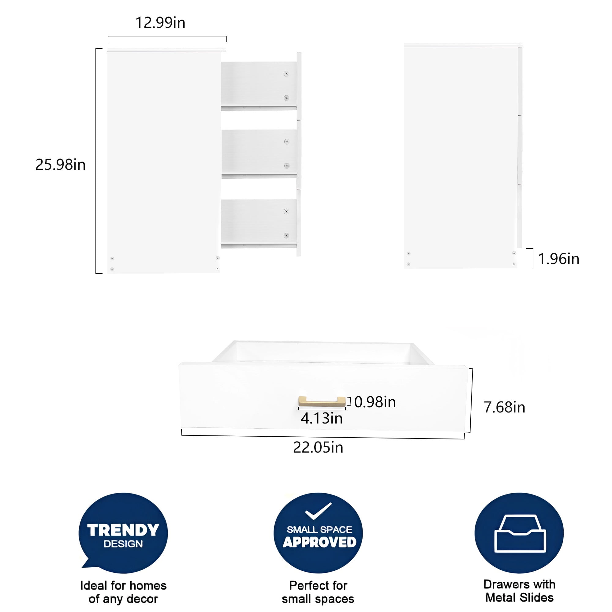 Features elegant vertical lines and a classic white finish, the PAPROOS 3-drawer nightstand is not only just a piece of furniture but also a great decoration for your home. Smooth lacquered engineered wood panels ensure perfect stability and long service life. Specifications: Material: P2 Wood Color: White Handle Color: Silver Dimensions: (25.98 x 13 x 22.05)” / (66 x 33 x 56)cm (L x W x H) Number of Drawers: 3 Pcs Weight: 37.48 lbs / 17 kg Recommended Room: Family Room, Bedroom, Living Room, Home Office Recommended Location: Indoor Package Includes: 1 x 3-Drawer Nightstand