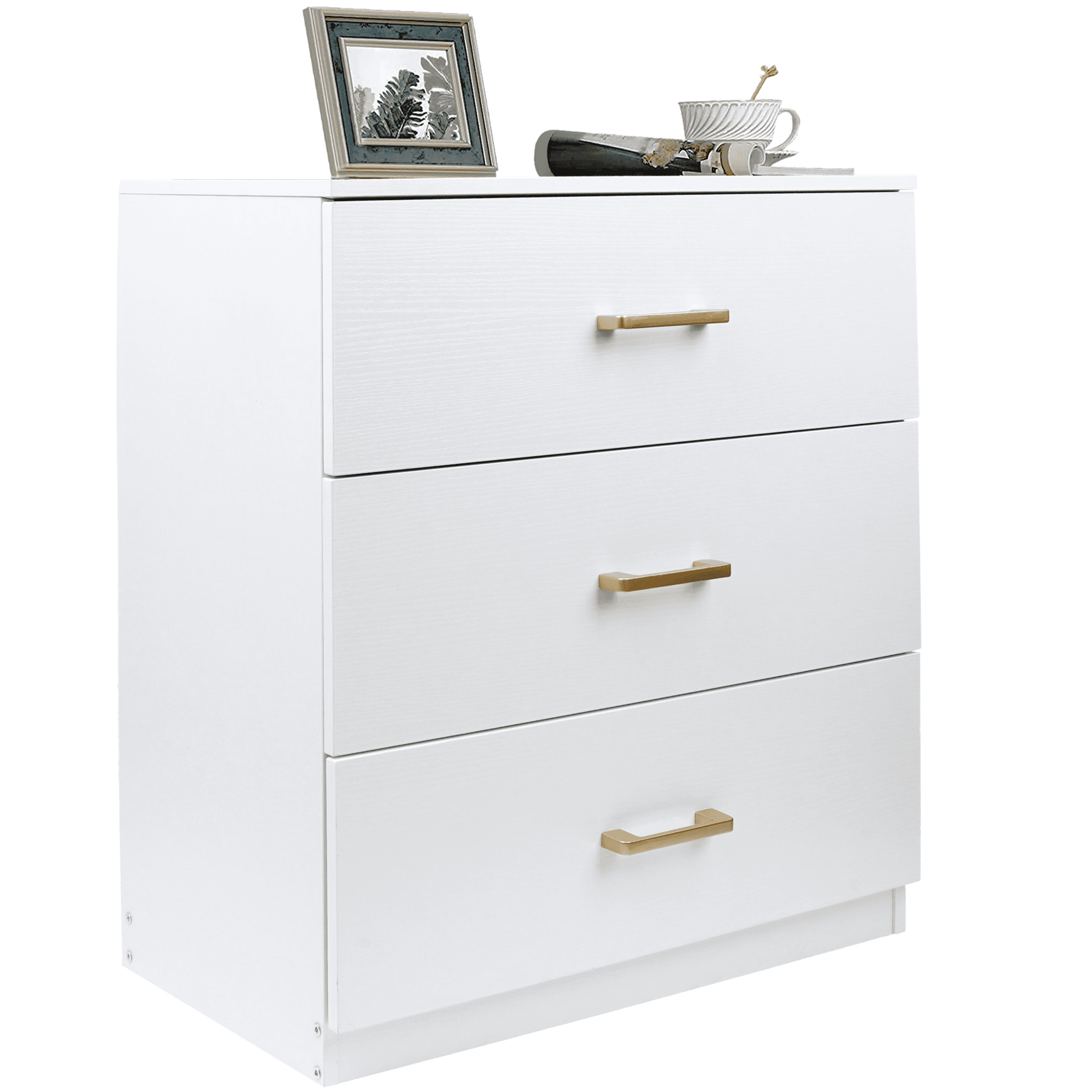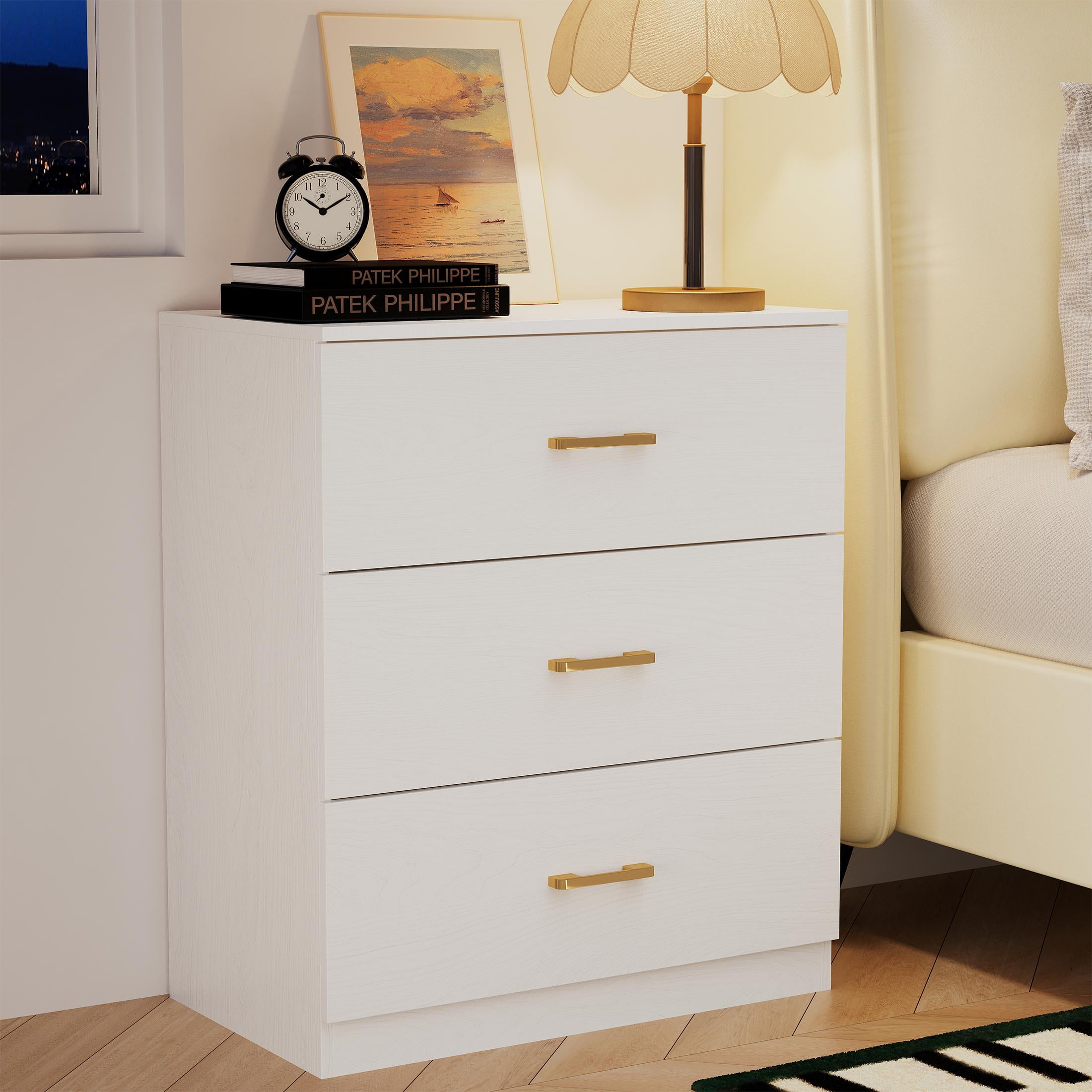 UHOMEPRO Nightstand, Modern 3 Drawer Nightstand, White Nightstand with Gold Handle, Wooden Bedside Storage Cabinet Unit for Bedroom/Small Space
