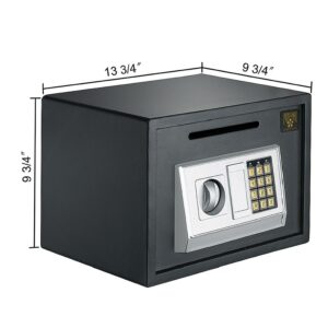– PRODUCT DIMENSIONS External Dimensions: 10″H x 14″W x 10″D. Internal Dimensions: 9.5H x 13.5W x 9D. Deposit Slot: 6″ x 0.50″.