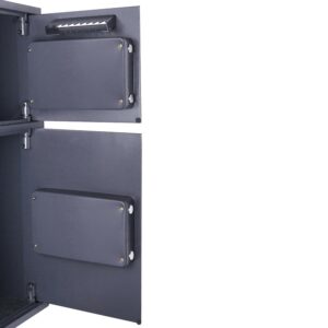 – PRODUCT DETAILS Color: Dark Gray. Material: Constructed of extra-thick 11 gauge solid steel. Powder-coated interior and exterior. Color: Dark Gray. Weight: 82 lbs. Runs on AA SIZE(1.5V) batteries. Anchor bolts are included.