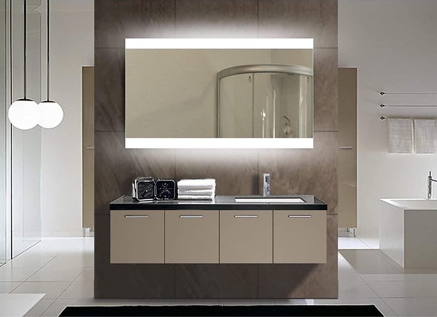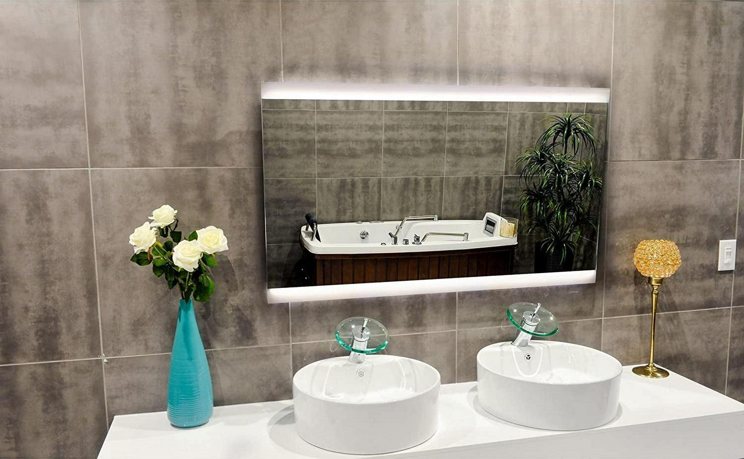 - This illuminated mirror adds brilliance and style to any bathroom decor