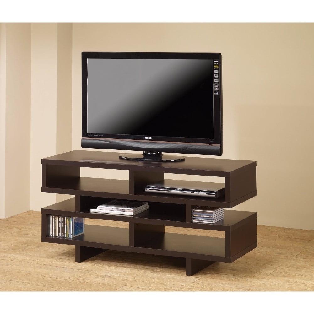 – TV console finished in cappuccino Constructed with MDF, particle board, and laminate Features five (5) open storage compartments Available in cappuccino and white Finish: Cappuccino Max TV size: 50″; Max TV weight: 88 lbs.