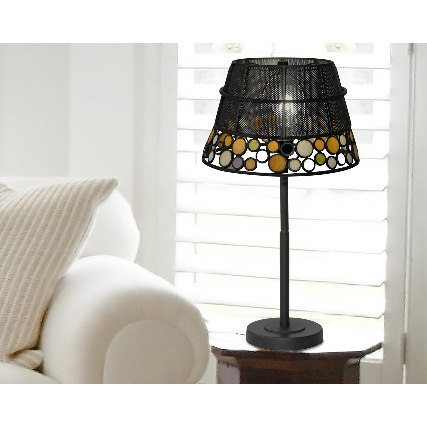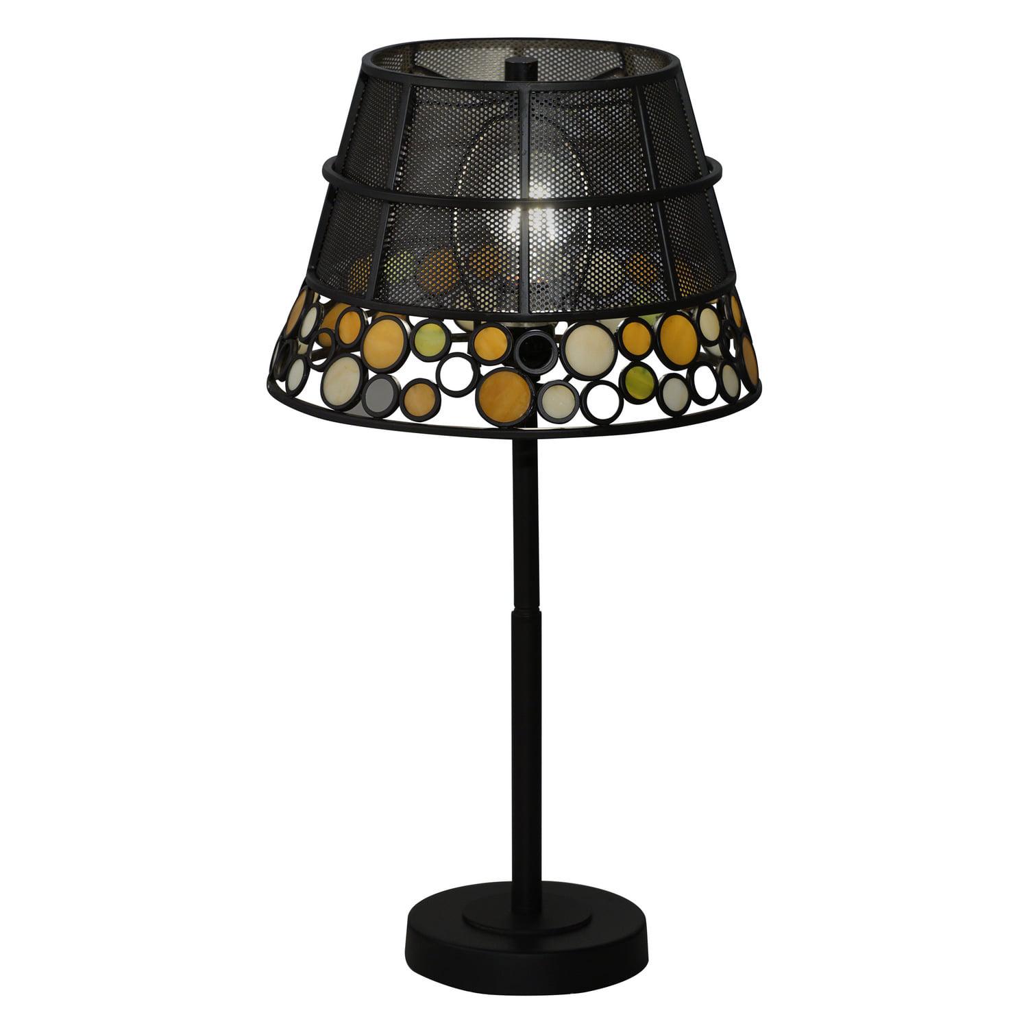 Our Pasqual Mesh Tiffany Table Lamp features a contemporary style that will adapt to your home s evolving décor. The shade features a metal mesh top, wrapped in a metal frame that is finished in Antique Bronze to give the fixture its industrial feel. A wide bottom border of circular art glass pieces in amber, white and yellow, outlined in matching filigree adds to the contemporary vibe. The modern metal base is finished Antique Bronze to match the mesh in the shade, and features a sleek center column and round pedestal. A chic look when displayed in pairs on matching end tables or nightstands, our Pasqual Mesh Tiffany Table Lamp will provide you with many years of stylish and reliable lighting.