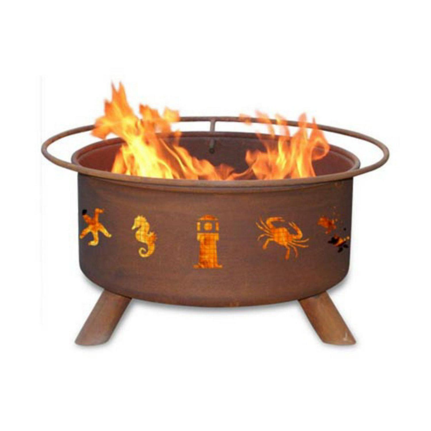 Features: Natural rust patina finish ages beautifully over time. Manufactured from cold-rolled steel for years of durability. Sturdy legs are welded in place to prevent pit from wobbling. Comes fully assembled for immediate use. Includes spark screen cover poker and BBQ grill insert. Portable design allows fire pit to move easily from patio to beach. Wire mesh lines the inside of the firepit to prevent sparks and embers escaping through the cutout design. SKU: PTPR016.