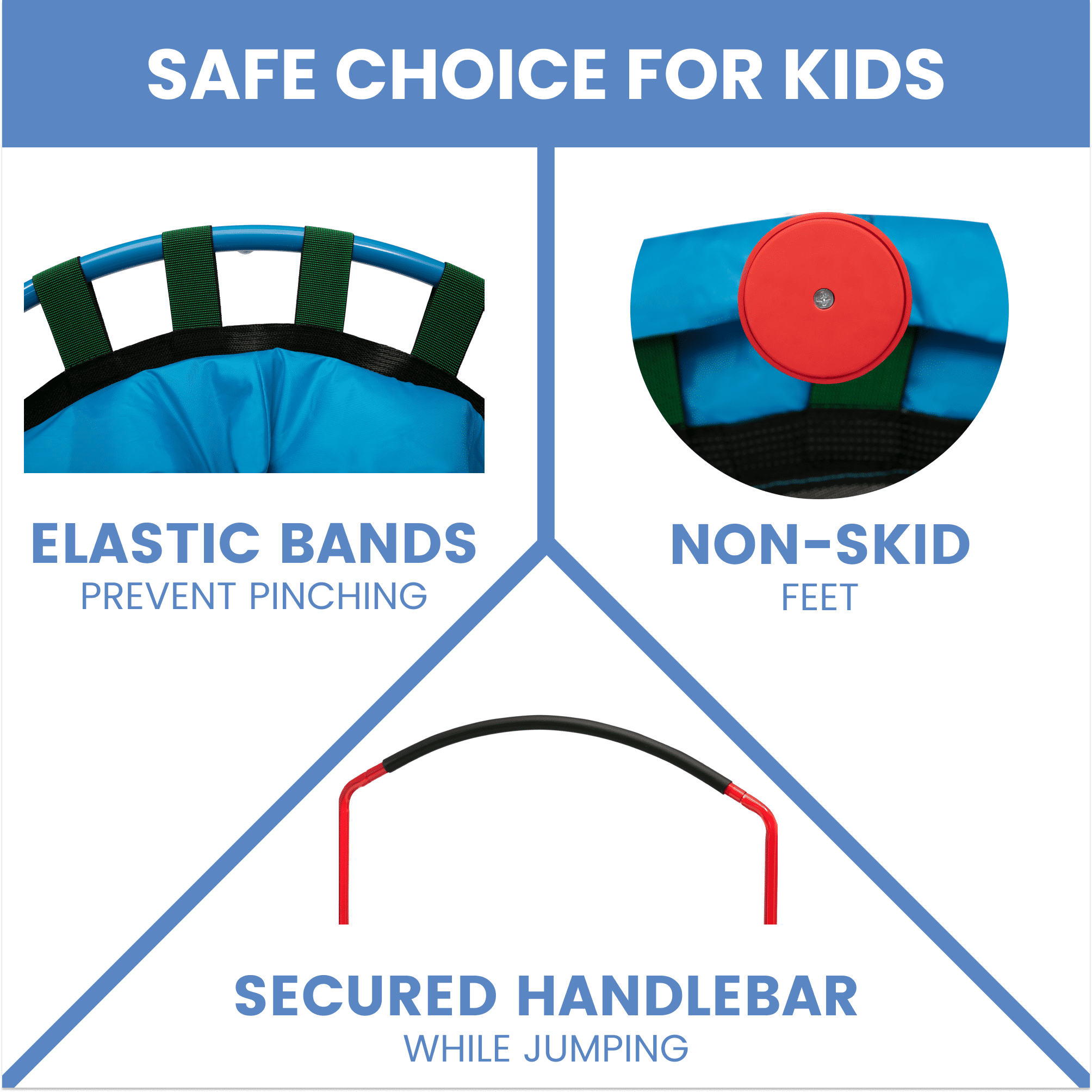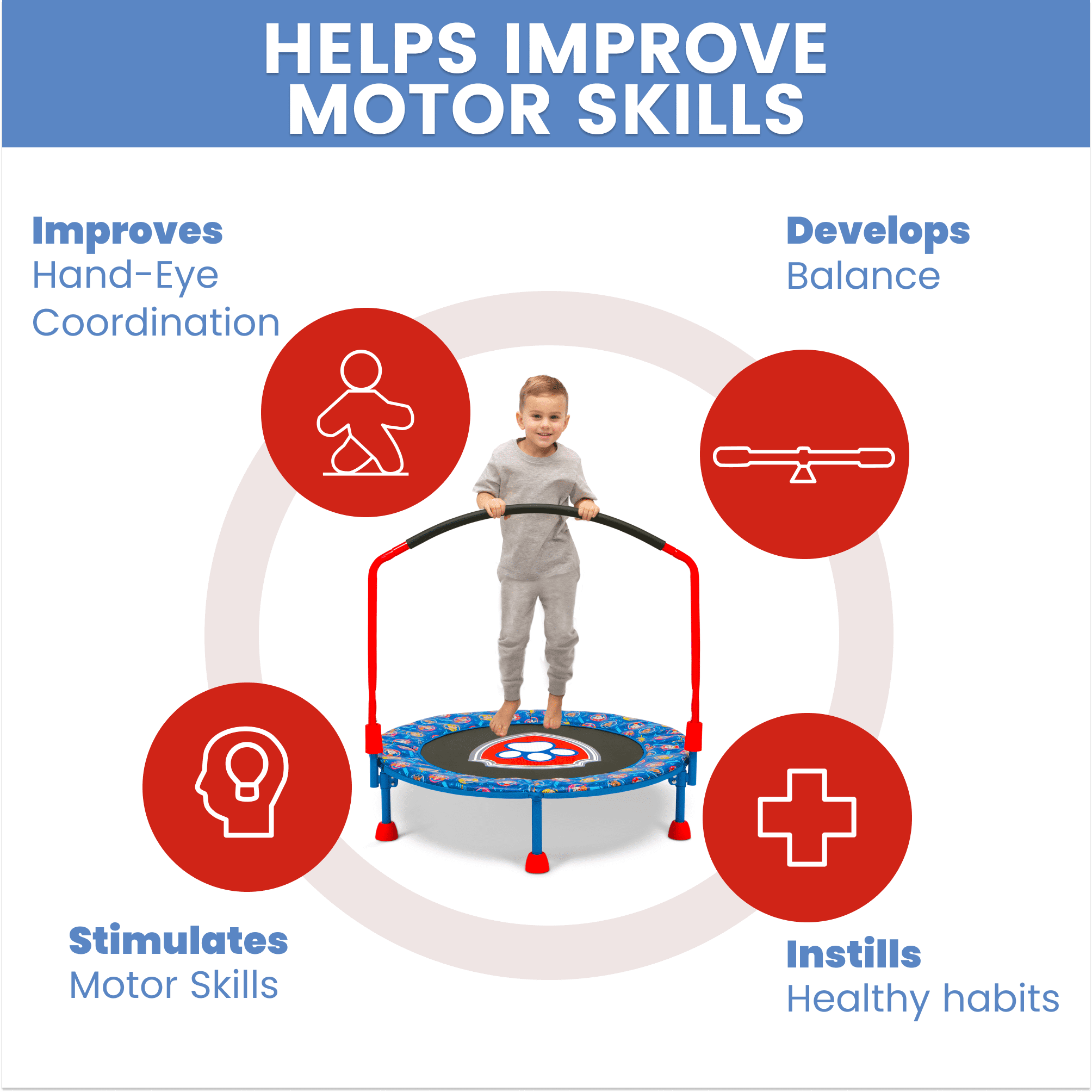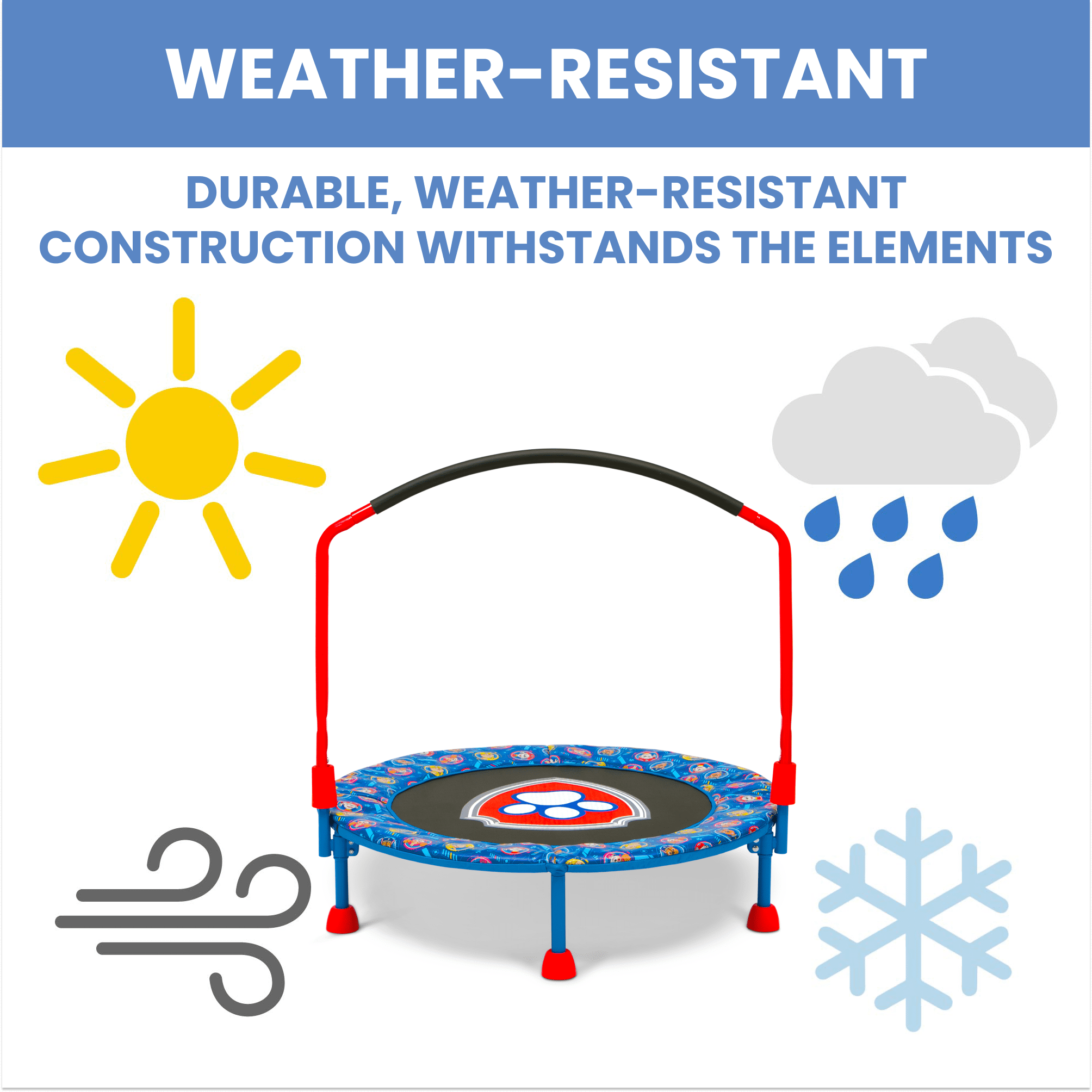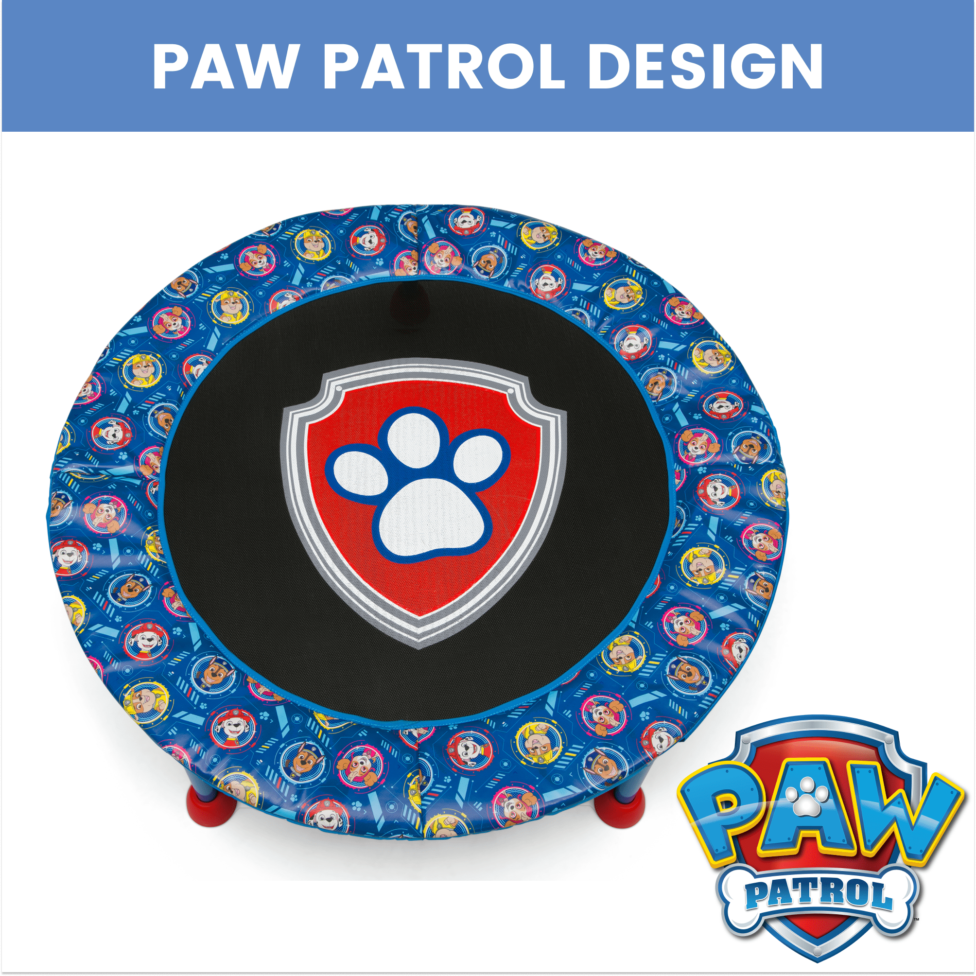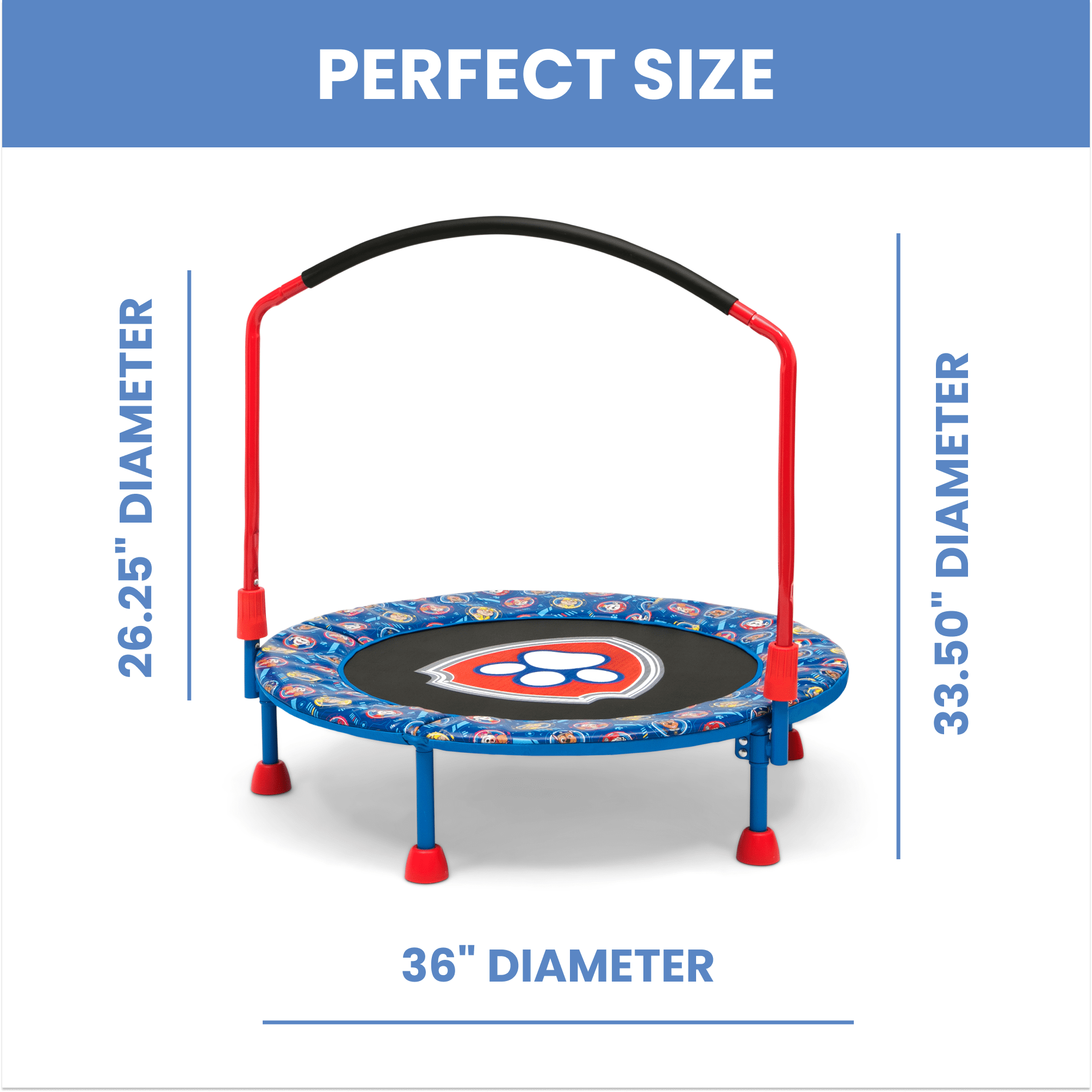 SAFE JUMPING: This trampoline features a safe padded bungee system that reduces noise and prevents pinching | Non-skid feet keep trampoline in place and protects floors | Padded handlebar for comfort | Ideal for ages 3+ | Supports up to 55 lbs. INDOOR/OUTDOOR USE: Suitable for indoor or outdoor use, this trampoline provides hours of entertainment | Trampoline promotes active play and helps improve motor skills, confidence, coordination and sensory processing FOR PAW PATROL FANS: Kids will love seeing the PAW Patrol logo as they jump and bounce EASY SETUP & STORAGE: Easy setup gets kids jumping in no time | Removable handlebar and foldable design for space-saving storage SIZE: 36”L x 36”W x 33.50”H | Jumping surface to top of handlebar: 26.25H | From ground to jumping surface: 8.6”H SIZE: 36”L x 36”W x 33.50”H | Jumping surface to top of handlebar: 26.25H | From ground to jumping surface: 8.6”H