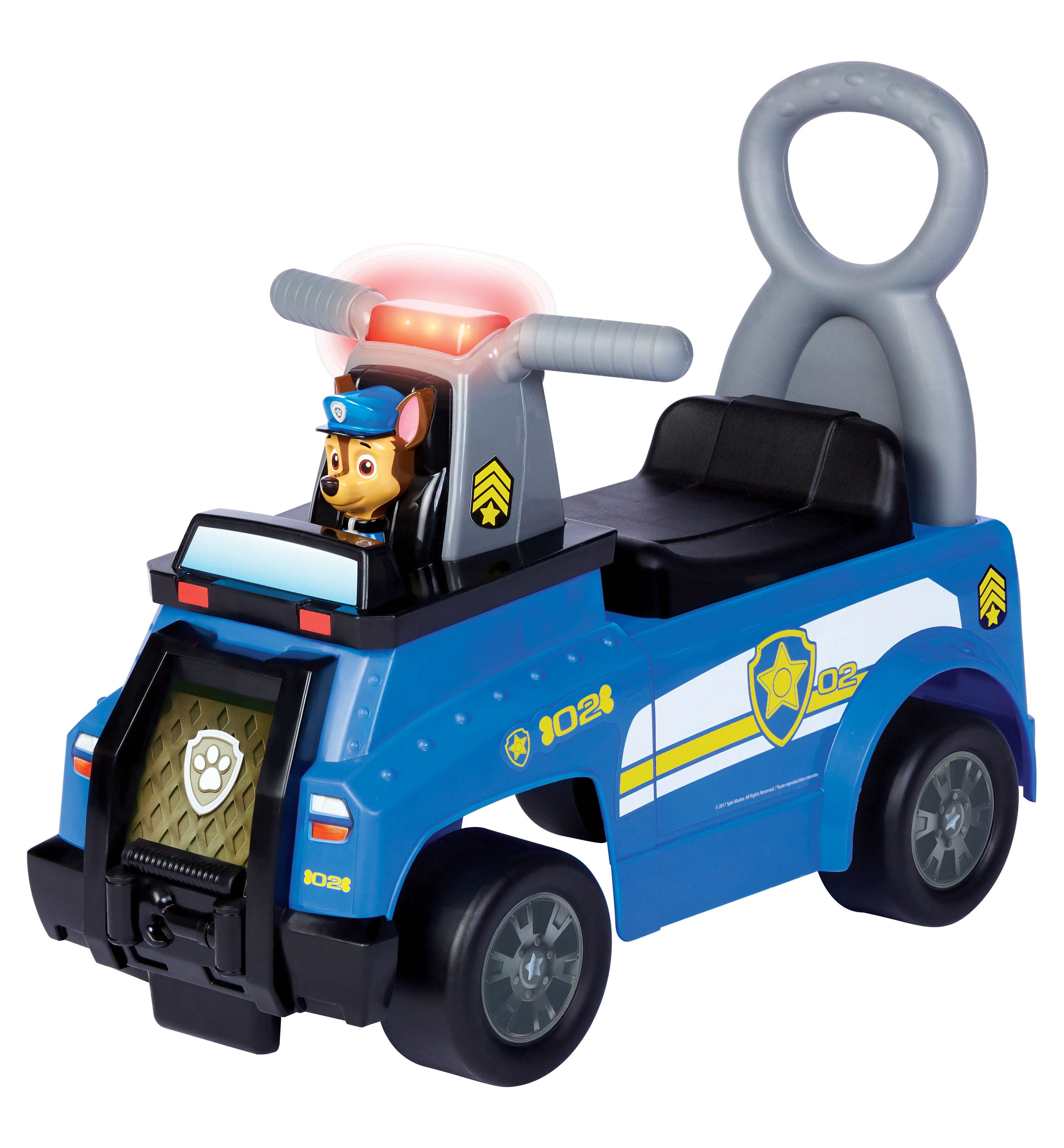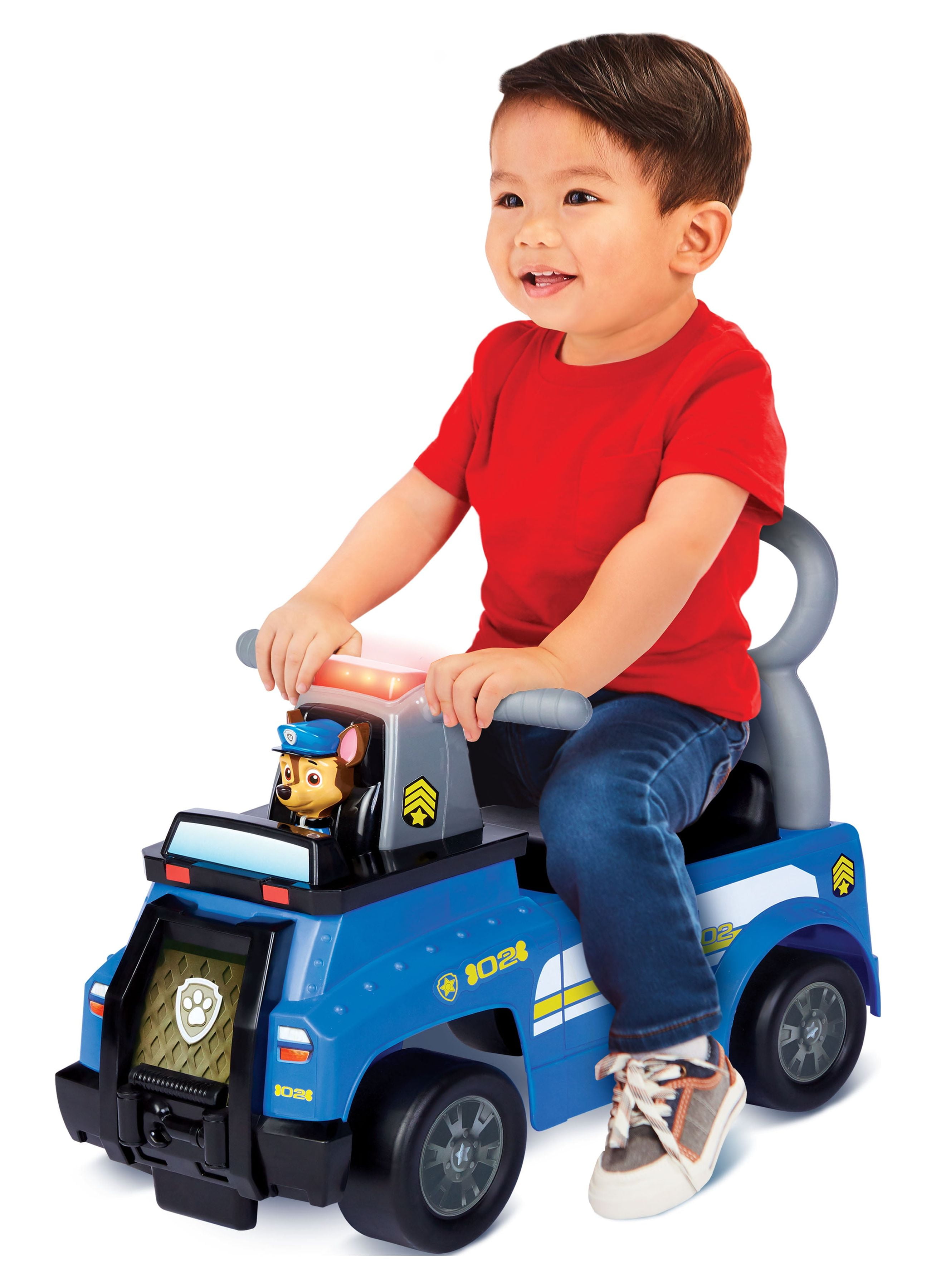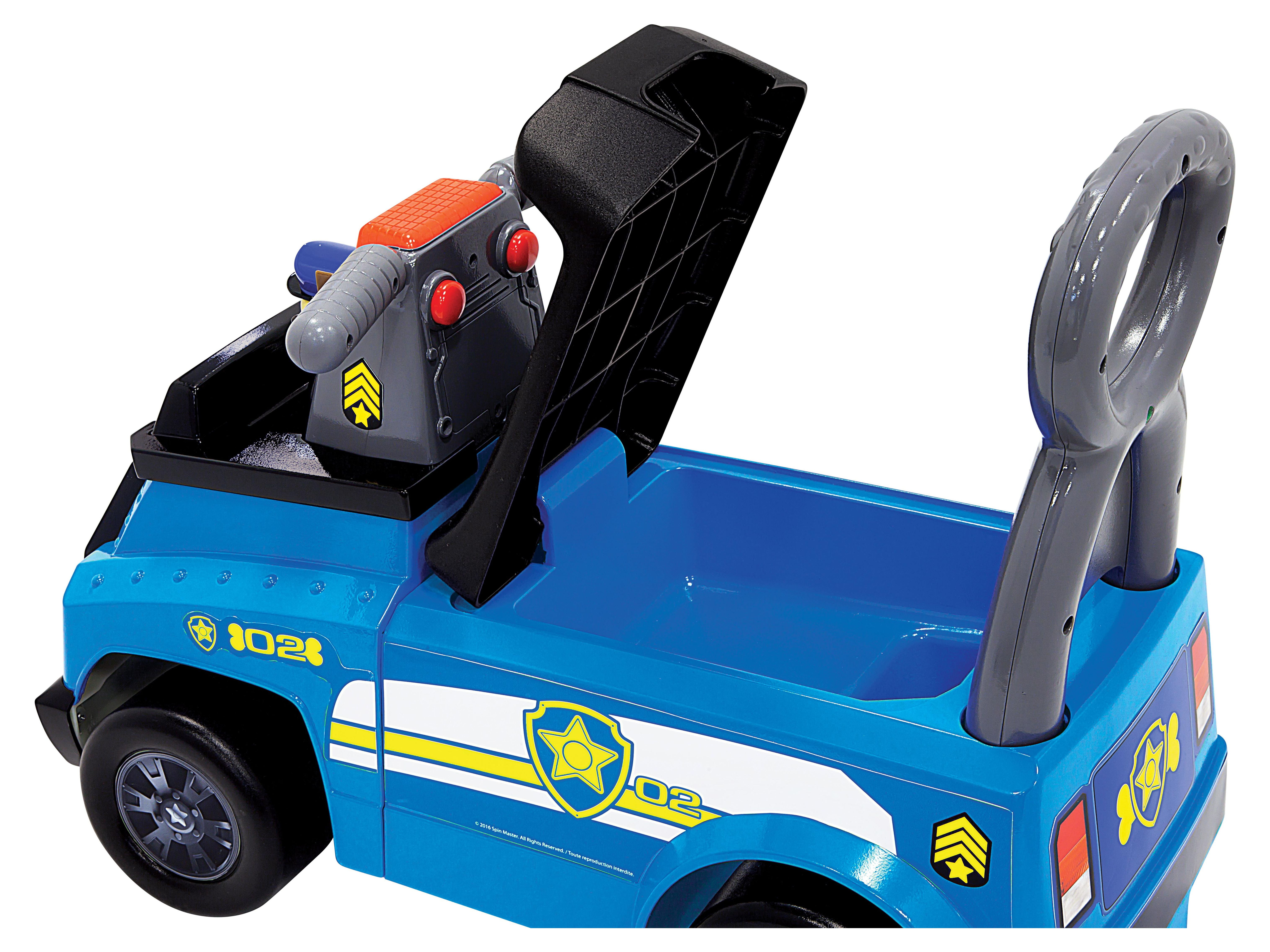 Paw Patrol Chase Cruiser Ride-On: Handlebar button plays sounds Ladder push bar allows user to push kids’ ride on while in upright position Storage compartment underneath seat Removable walkie-talkie activates sound effects in dashboard Intended for kids ages 1-3