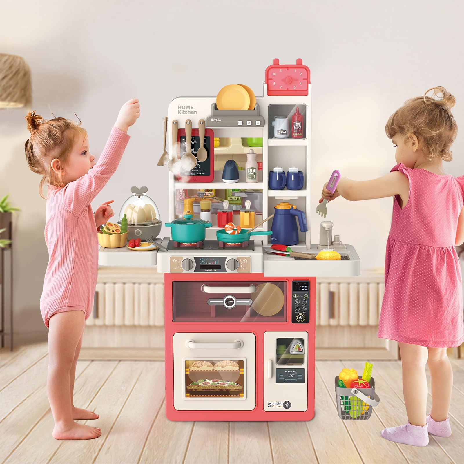 PayUSD Play Kitchen Set for Kids, 63 PCS 33Inch Pretend Play Food Toys Kitchen Set with Realistic Sounds & Lights, Play Sink, Simulation of Spray Kitchen Toys for Toddlers Girls Boys Gift, Pink