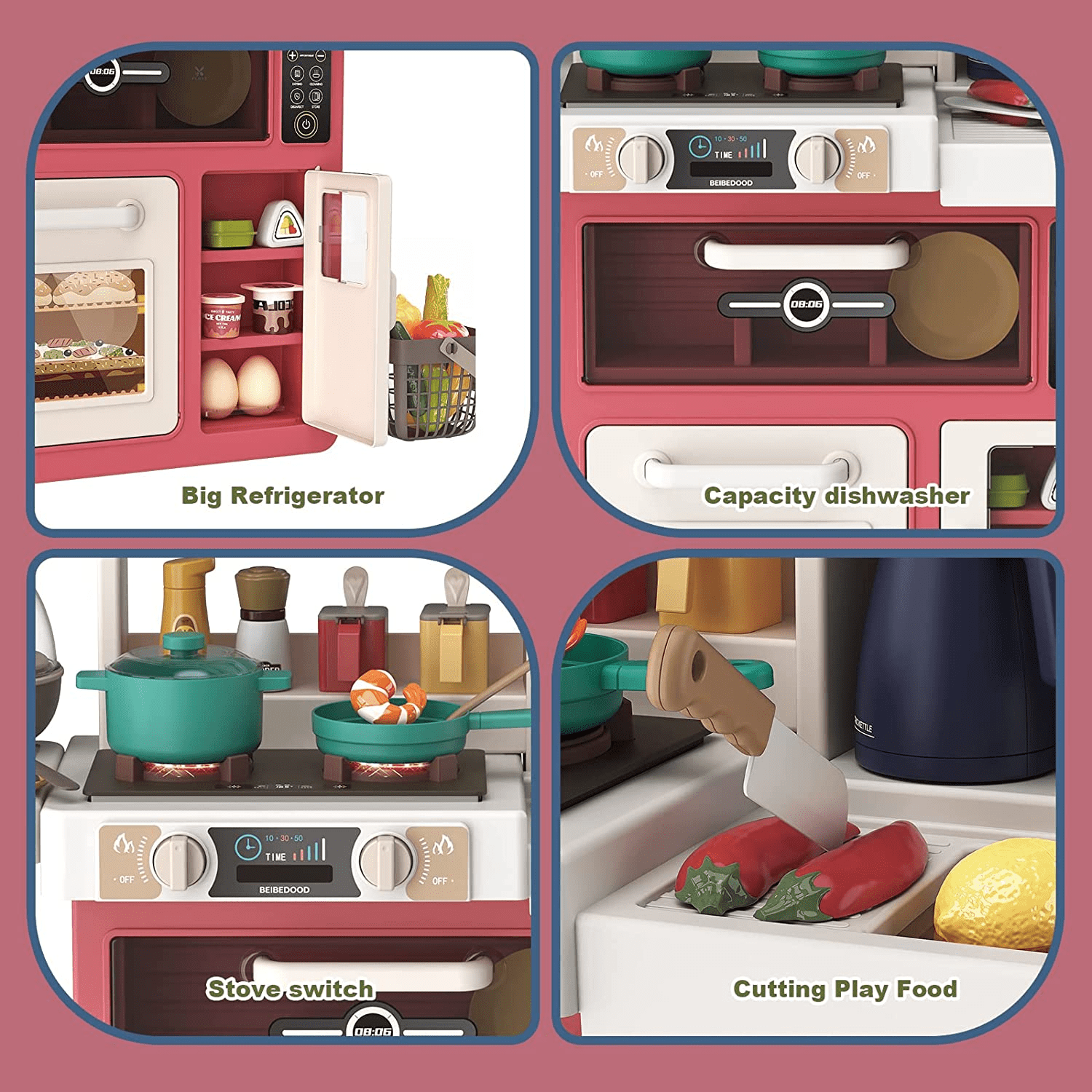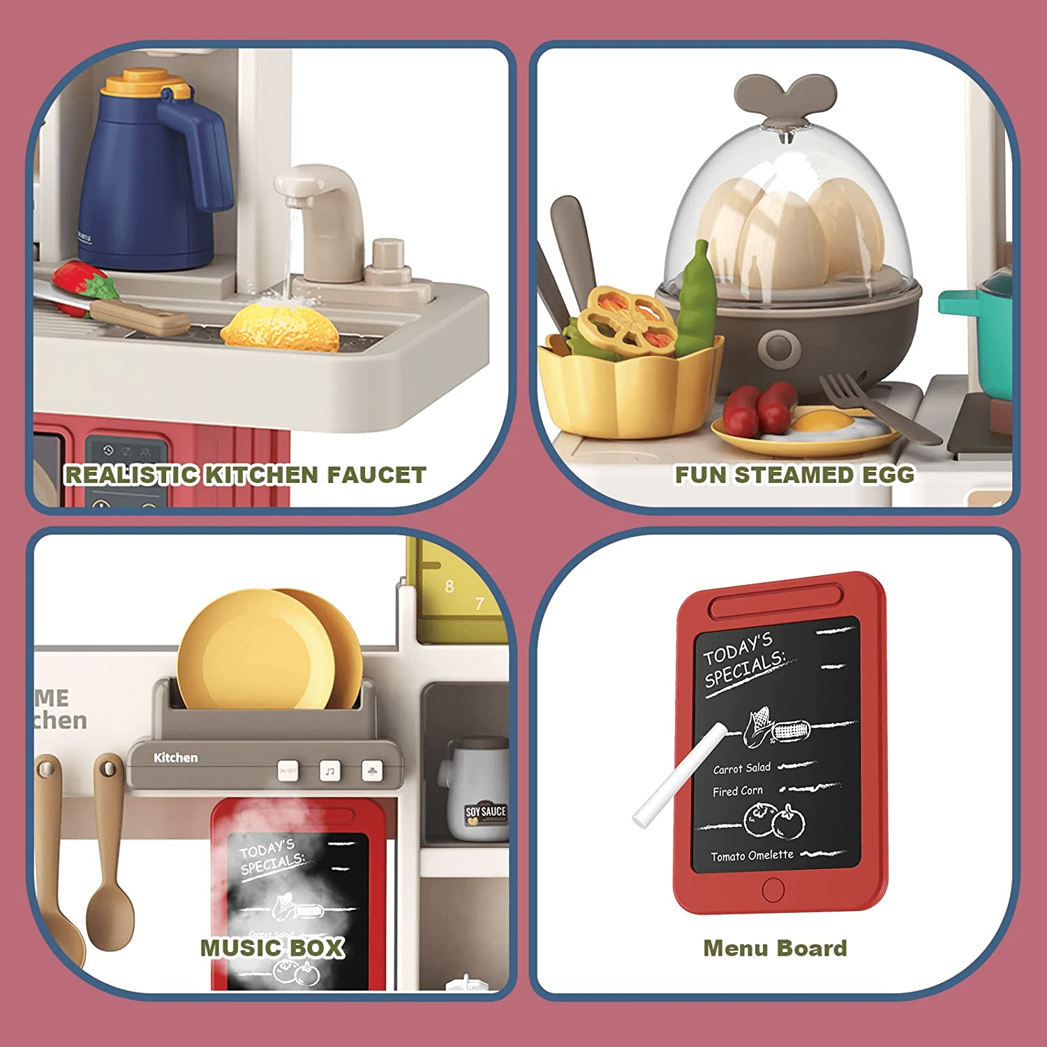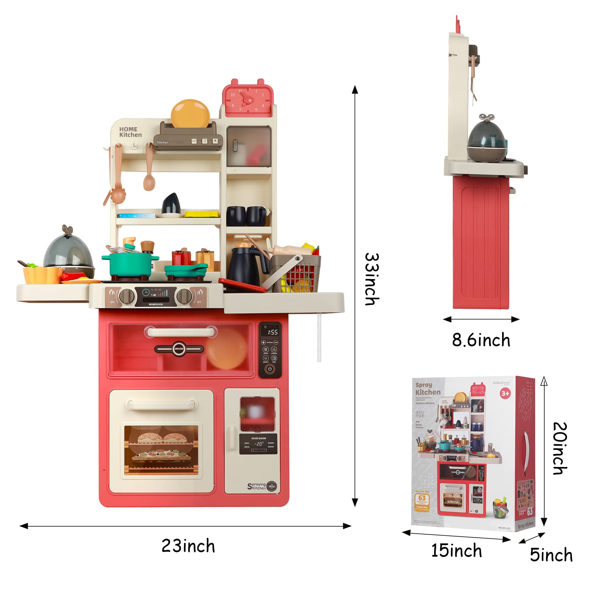 【Large Kids Pretend Kitchen Toy】 – The size of children’s kitchen toy set is: 33*8.6*24in. 63-Piece Play Kitchen Accessory Set included electronic stovetop,play sink with running water,rotatable egg steamer,oven,refrigerator,Mini blackboard and kinds of kitchen accessories.Various cooking utensils for your little one to have countless hours of fun and play. 【Real Kitchen Experience】- Pretend stovetop burner features realistic electronic lights and sounds.Place the pot and pan on the stove,turn on the button, Spray will comes out while your kids cooking.Working lights,sizzling sounds,simulation of spray and play sink add to the pretend play fun! (need 8AA battery, not included) 【Water Circulation Design】- Just add water to the sink, and then manually press the faucet button to drain the water, you don’t need to add water repeatedly. Children can wash food or dishes by imitating real life situations. Fill the water dispenser with water and put it into the sink, and the water will flow out when you press the water dispenser switch. Large storage space and dish racks make storage easier. 【High-Quality Material】- Toy Kitchen Set is made of high-quality materials,easy to assemble, and the edges are smooth and burr-free,allowing children to play safely.Large storage space allows children to organize and store independently. 【Fun and Educational Kitchen Toy】- Kids Kitchen Playset is perfect gift,your child can role-play with friends and parents to strengthen interaction.Learn to recognize the color of vegetables and fruits while playing, exercise hands-on skills,hand-eye coordination,and communication skills.